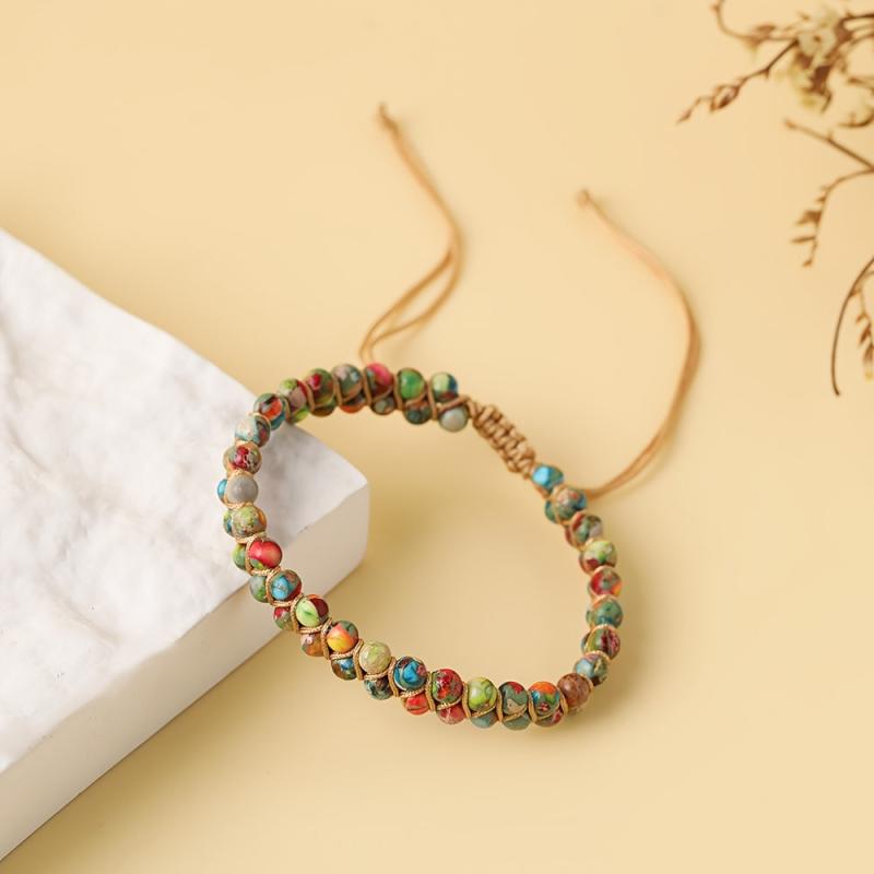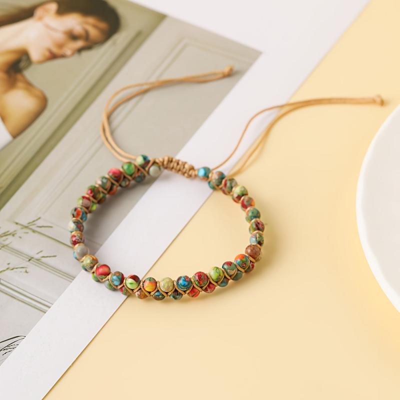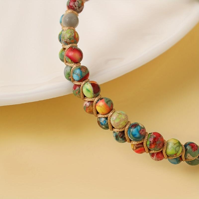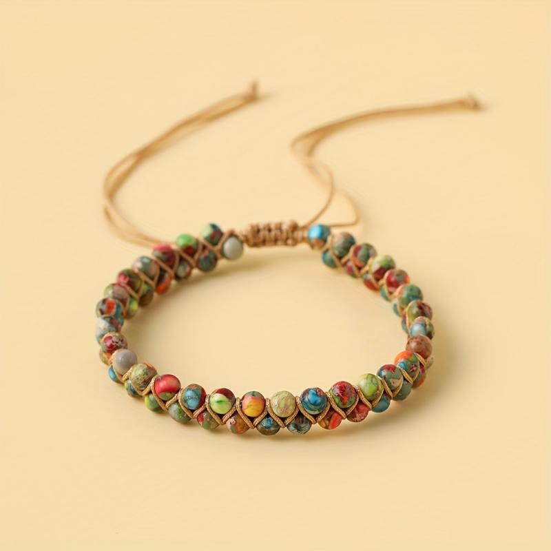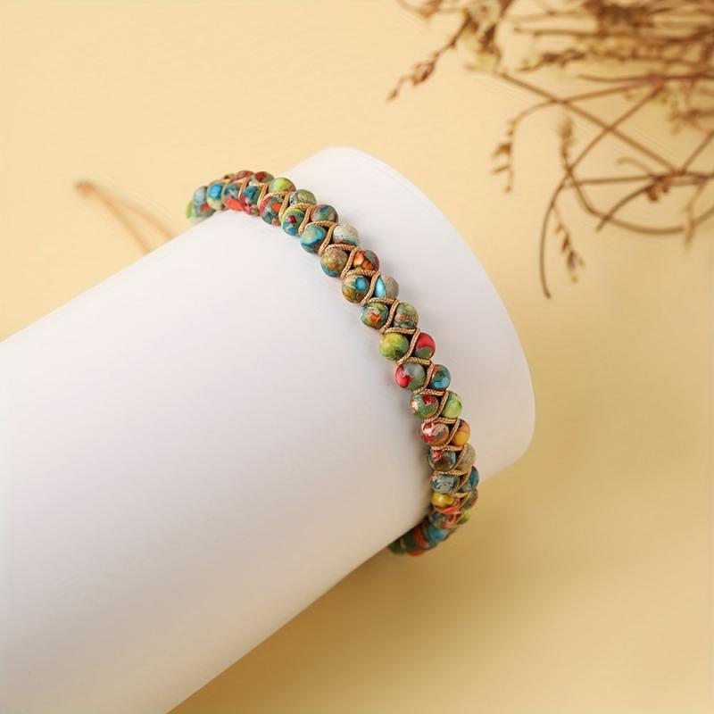 Elevate your style with this bohemian double layered bracelet featuring natural stones in round beads, perfect for a unique ethnic look.