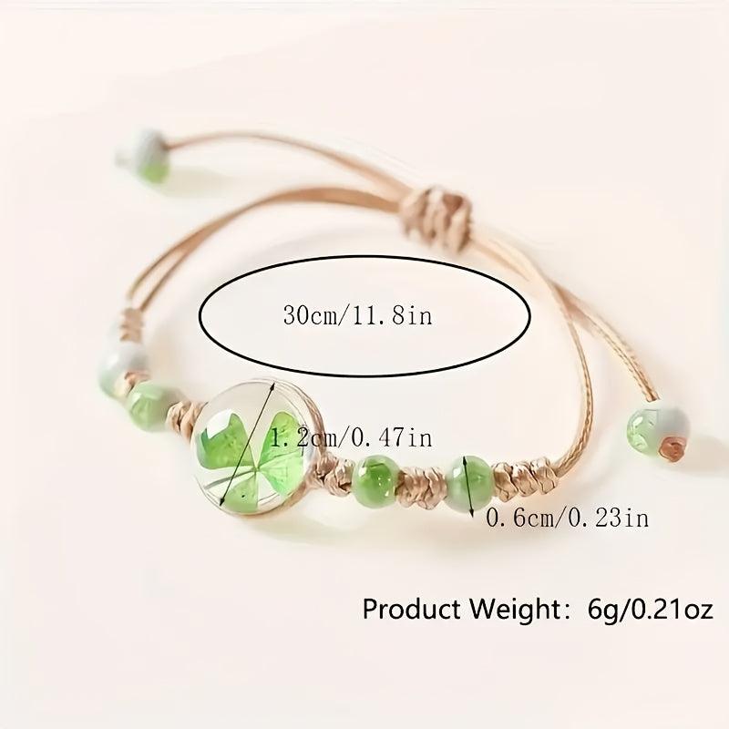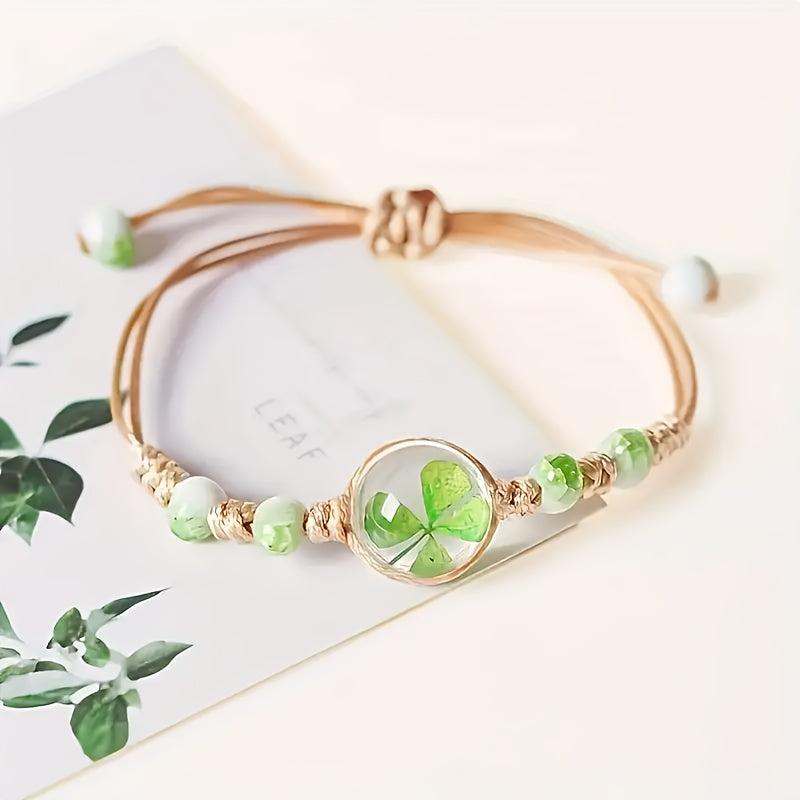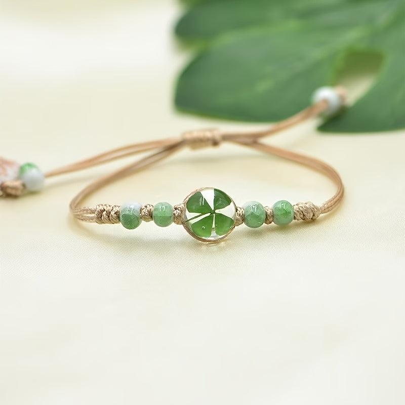 This adjustable bracelet features dried flowers, a lucky four leaf clover charm, and a golden tone wire bangle. Perfect for daily wear or as a thoughtful gift.