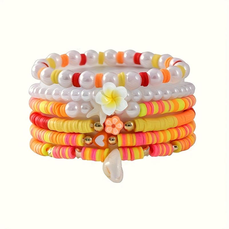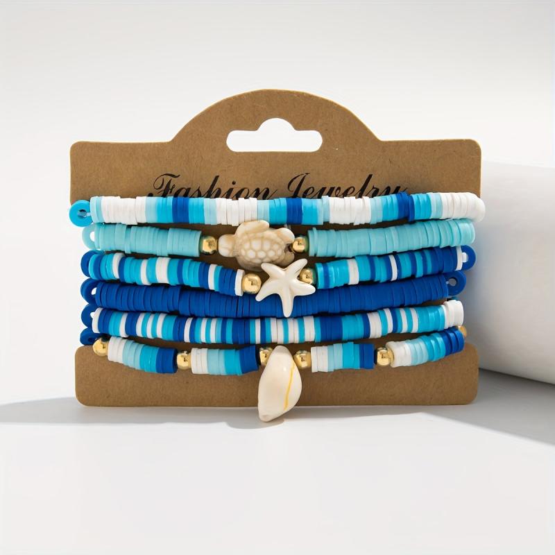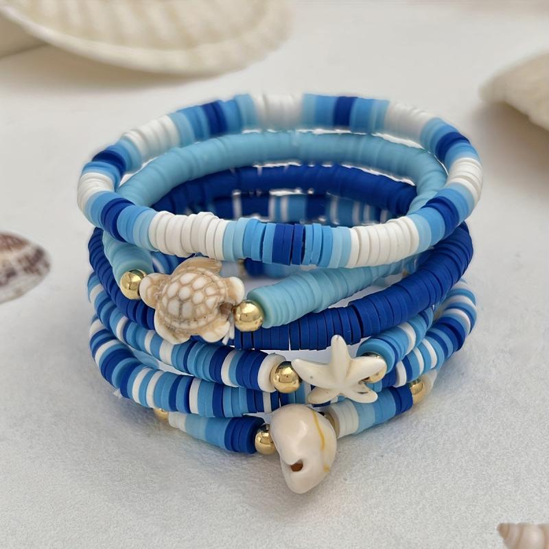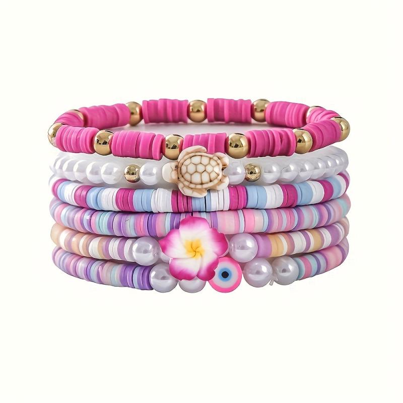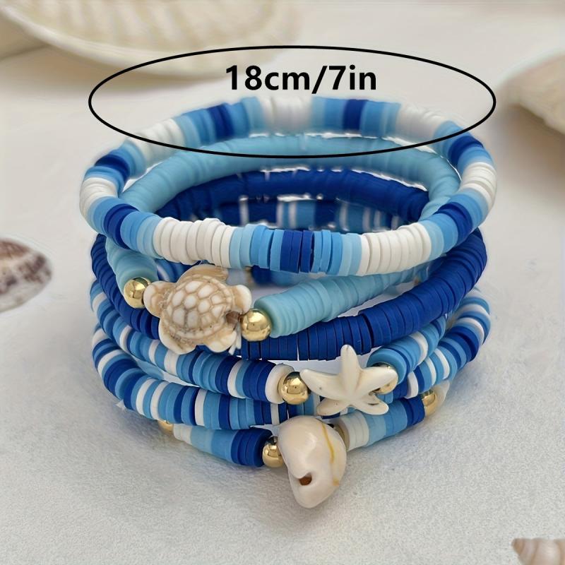 This bracelet set features soft clay charms of frangipani flowers, turtles, and starfish, perfect for a beach-themed look. The elastic design ensures a comfortable fit.
