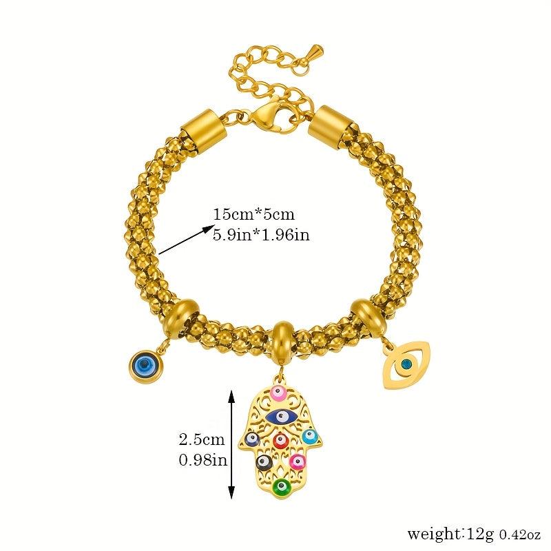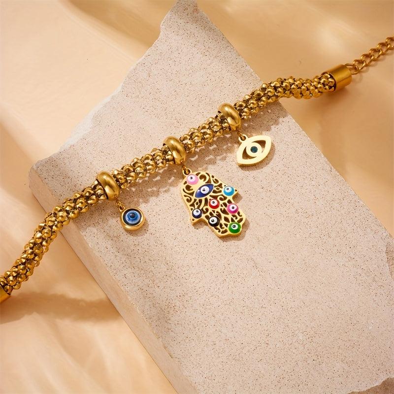 Elevate your style with this boho golden stainless steel bracelet featuring hollow eye and hand charms, adjustable thick chain, and vibrant gemstone accents. Perfect for parties and music festivals.