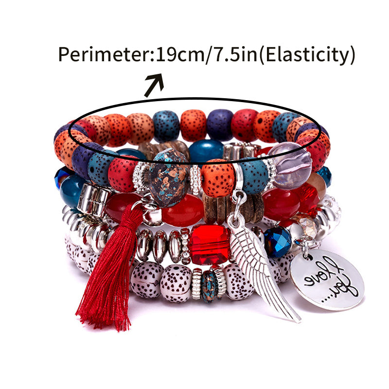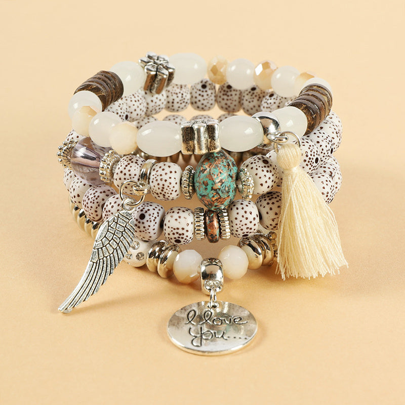 This boho bracelet features layered beads with metal letter 'LOVE YOU' charm, wing and tassel pendant for a stylish look.