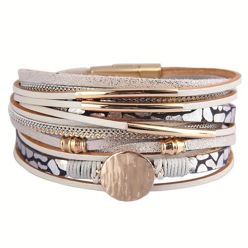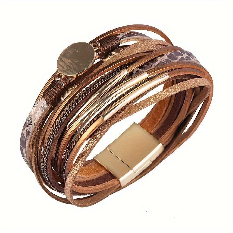 This boho style leather wrapped bracelet features an alloy crescent moon with a magnetic clasp and synthetic stone. It is perfect for daily wear and makes a great gift for women or sisters.