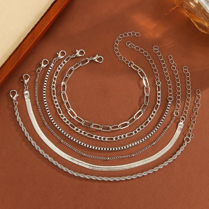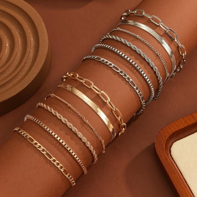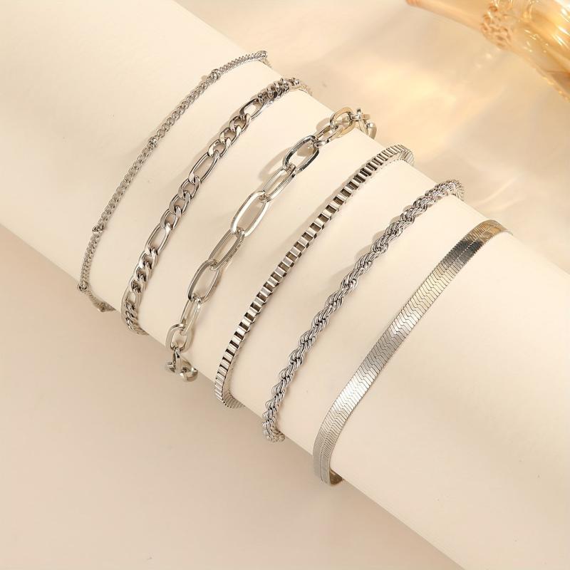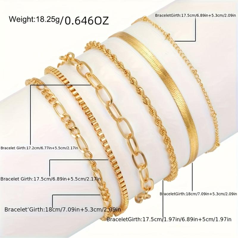 Elevate your style with this set of 6 bohemian minimalist golden metal bracelets featuring figa chain design. Perfect for everyday wear or special occasions.