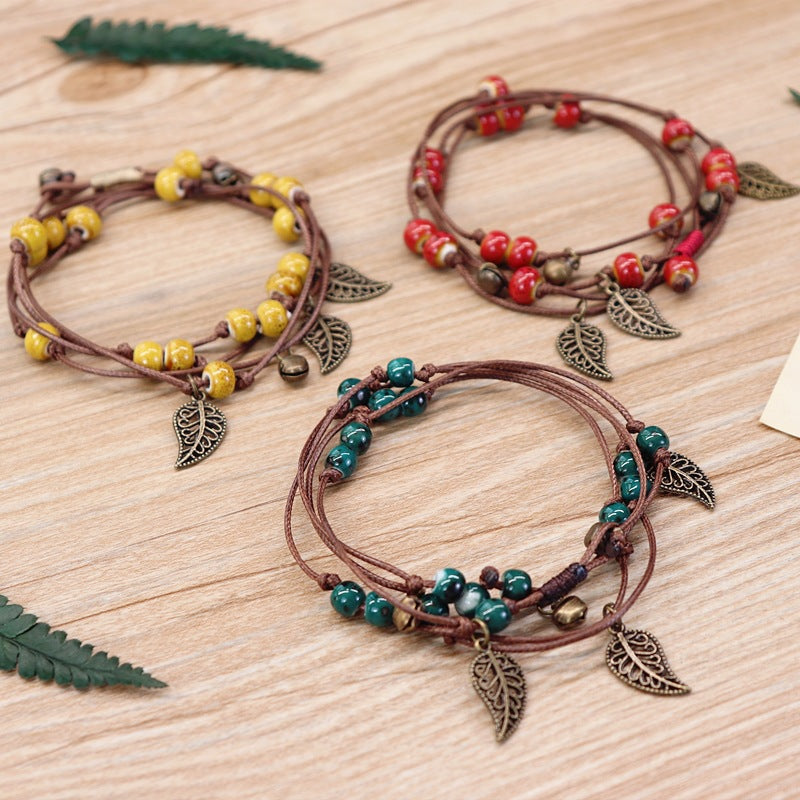 Add a touch of bohemian style to your outfit with this rope bracelet featuring a hollow leaf-shaped design and rice beads. Perfect for women's clothing and jewelry accessories.