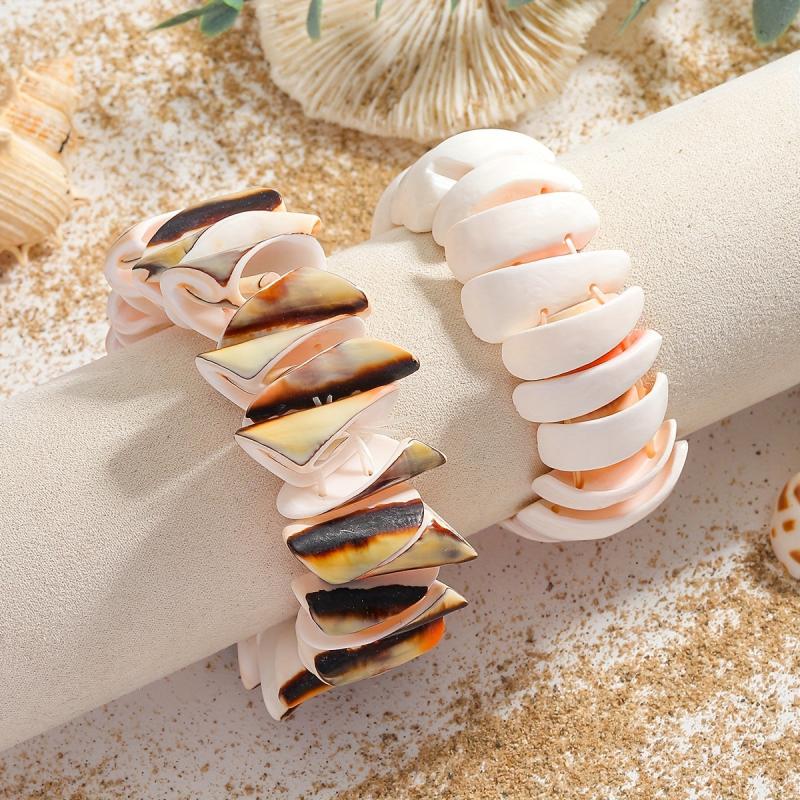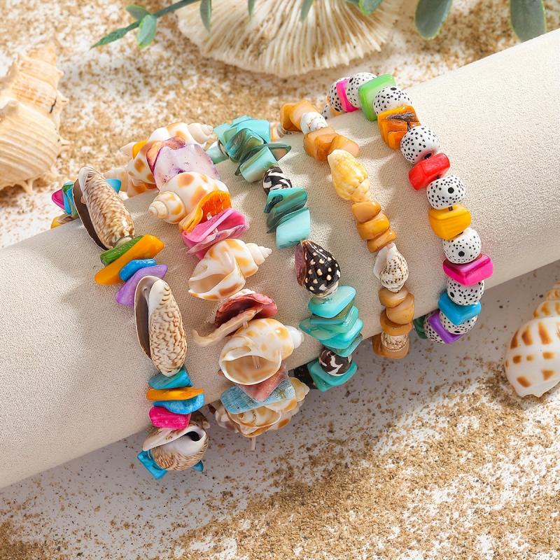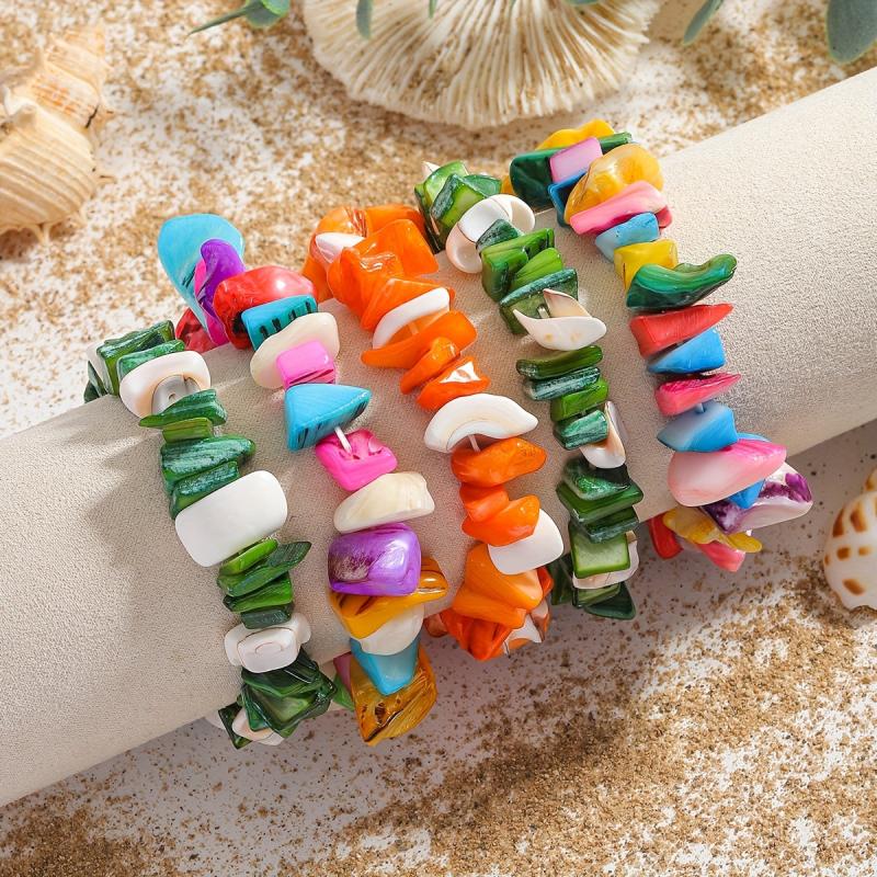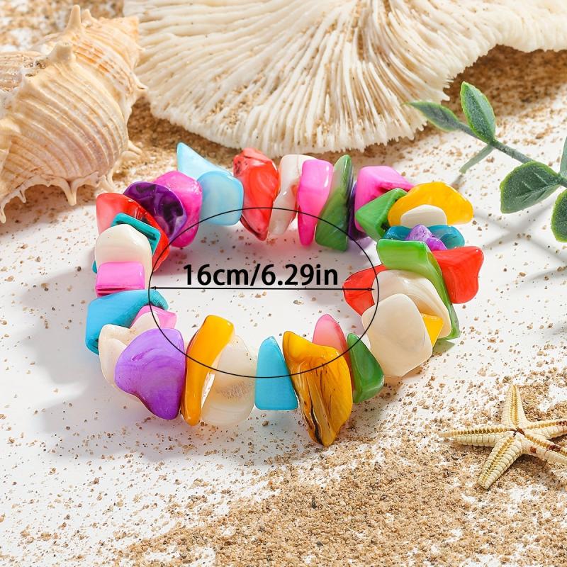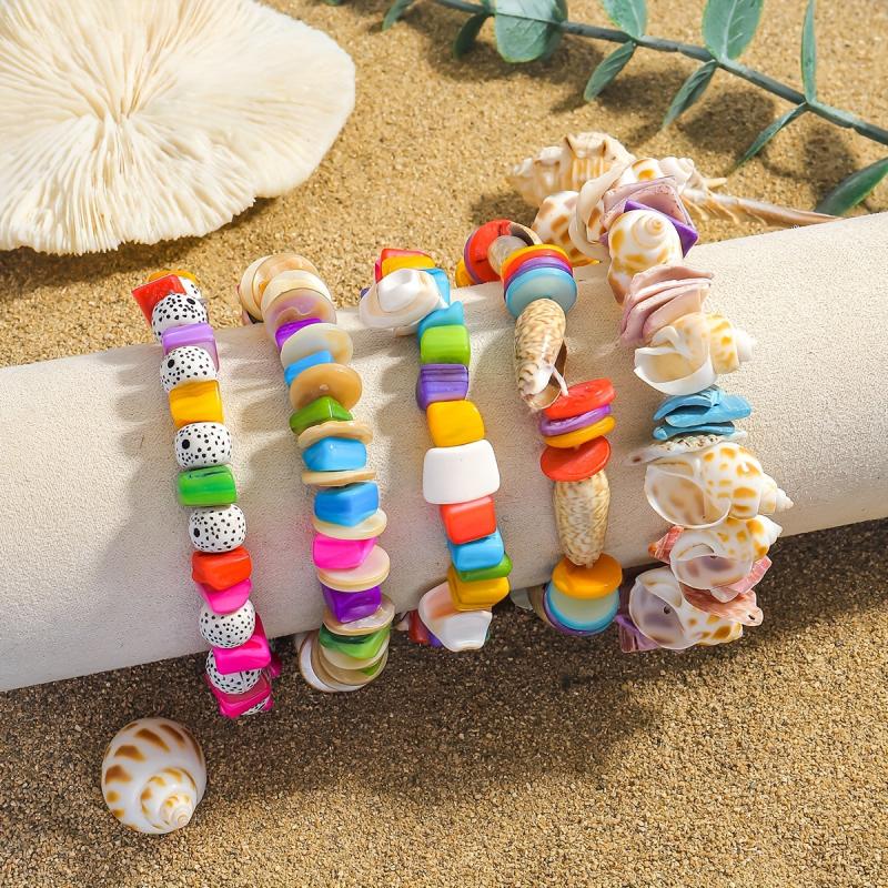 Elevate your style with this set of 5 bohemian bracelets featuring colorful shells and beads. Perfect for everyday wear or vacation vibes.