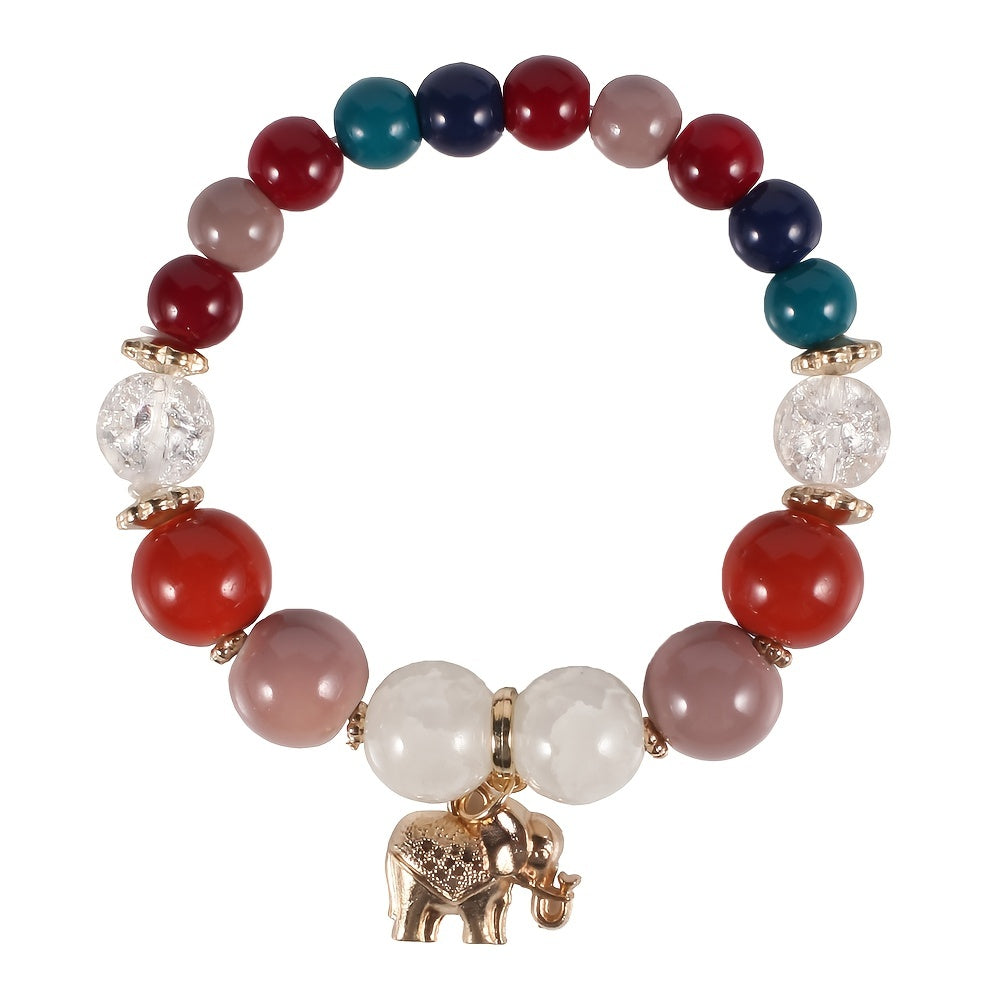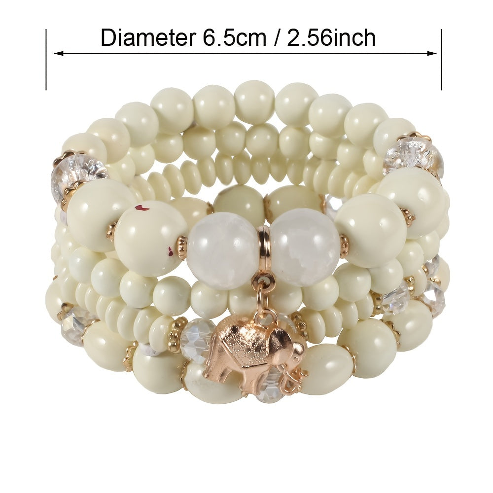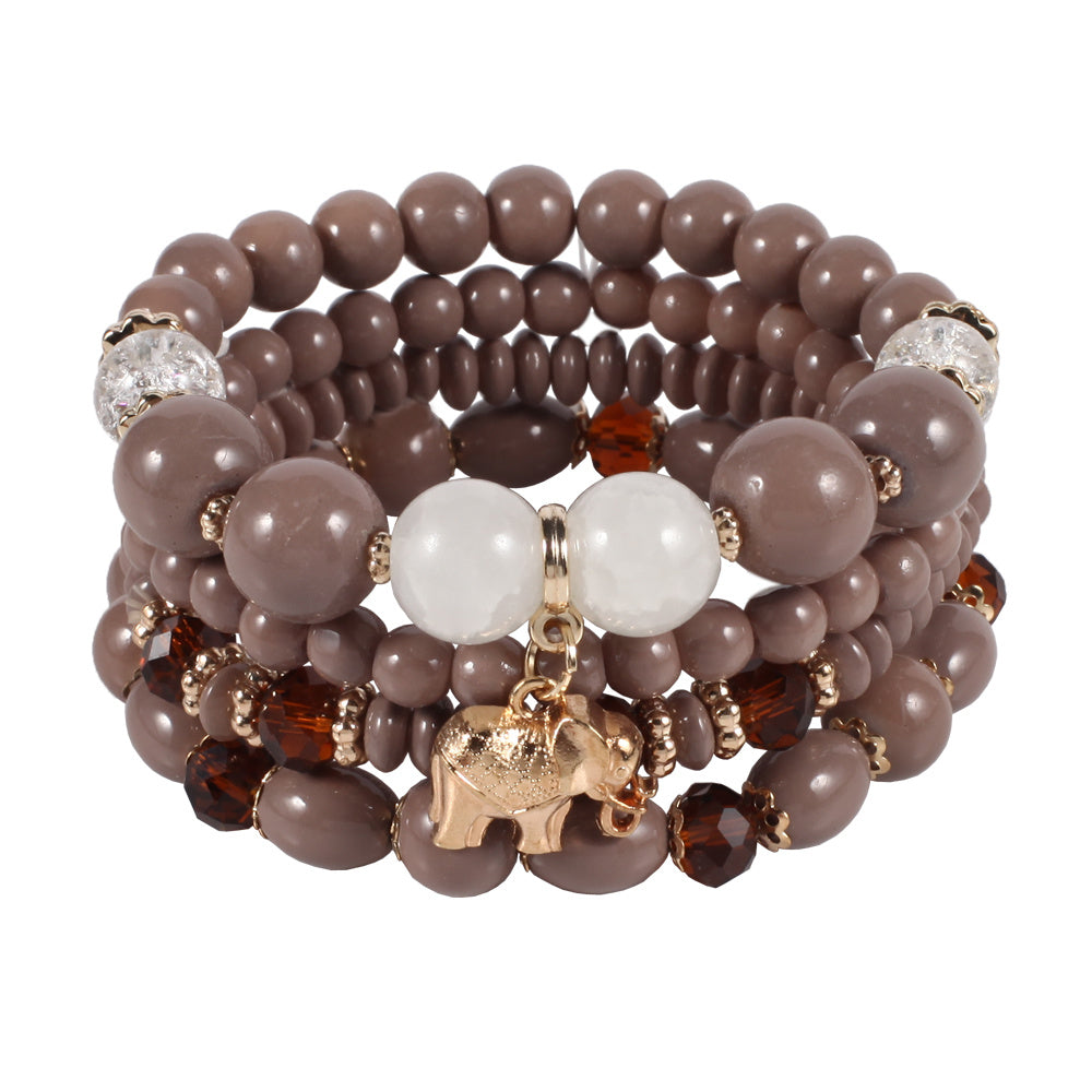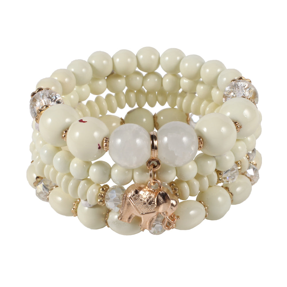 Add a touch of bohemian style to your look with this colorful stretch bracelet featuring multiple layers of beads and a cute elephant charm.