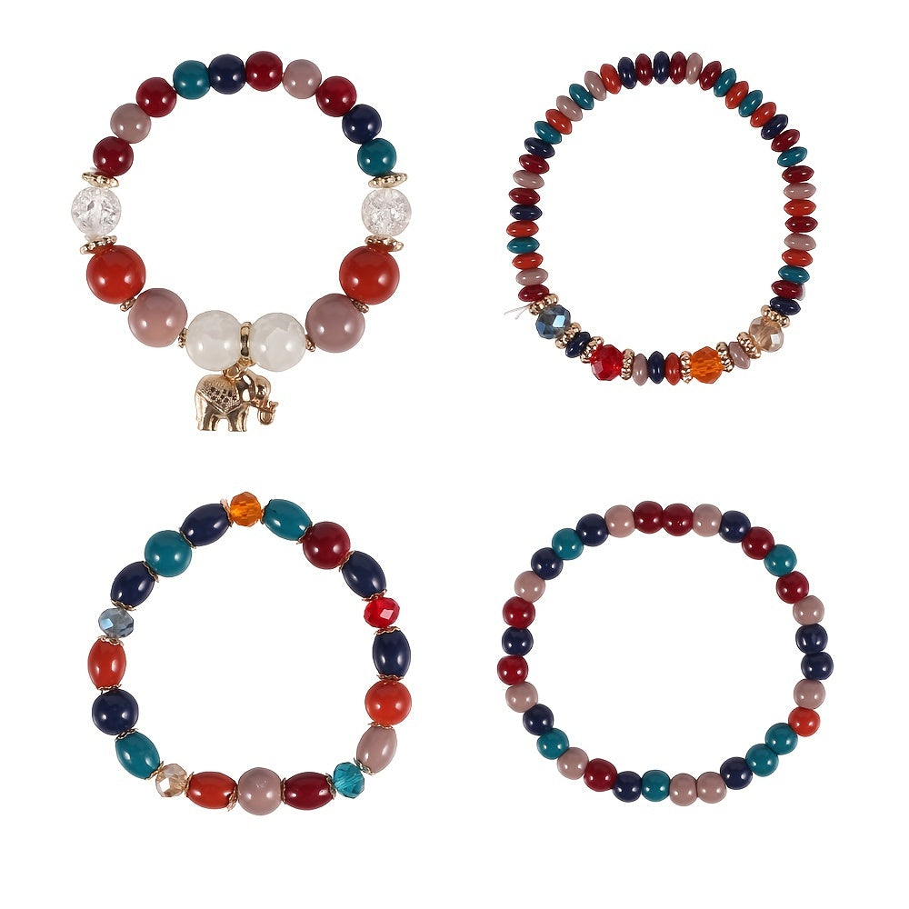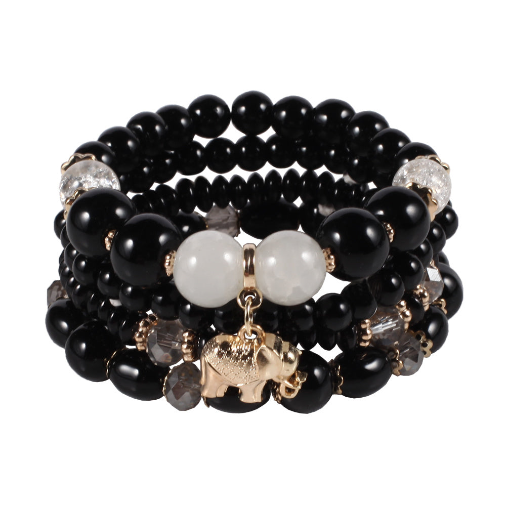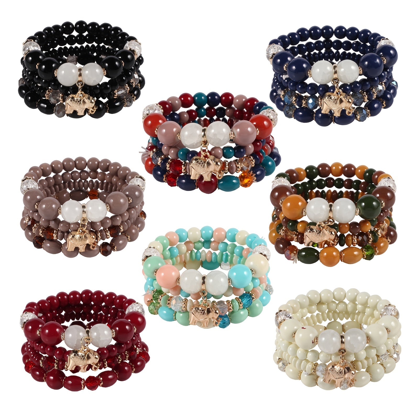 Add a touch of bohemian style to your look with this colorful stretch bracelet featuring multiple layers of beads and a cute elephant charm.