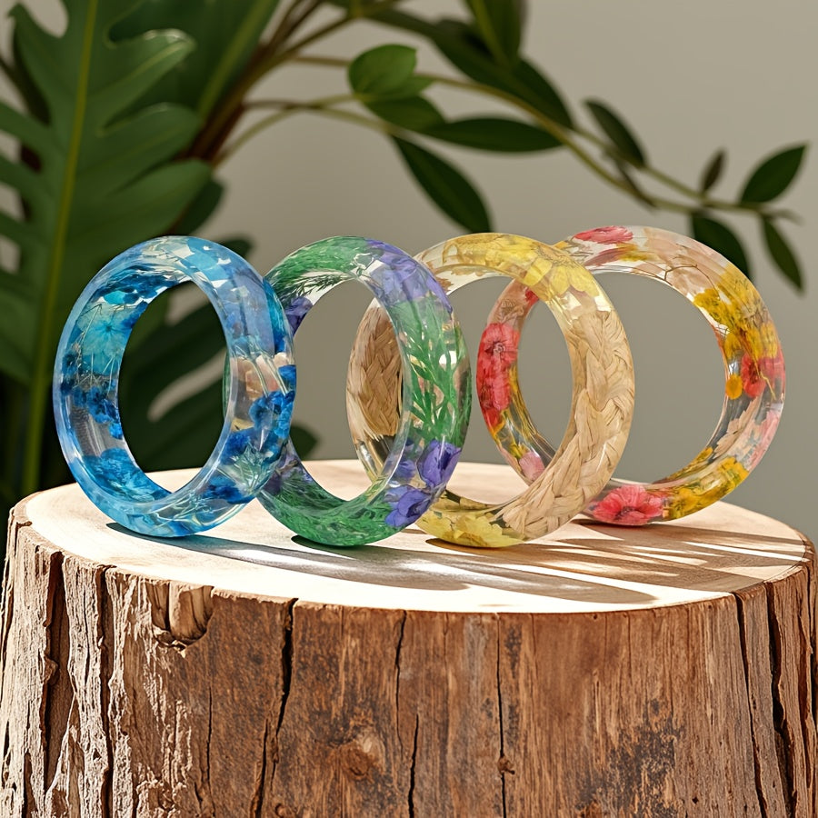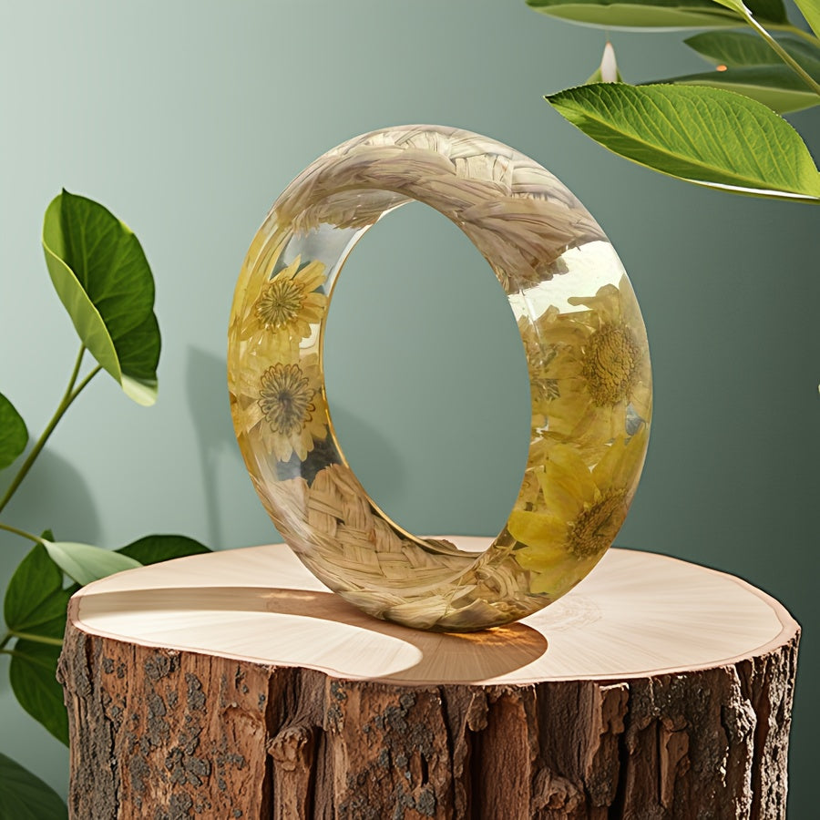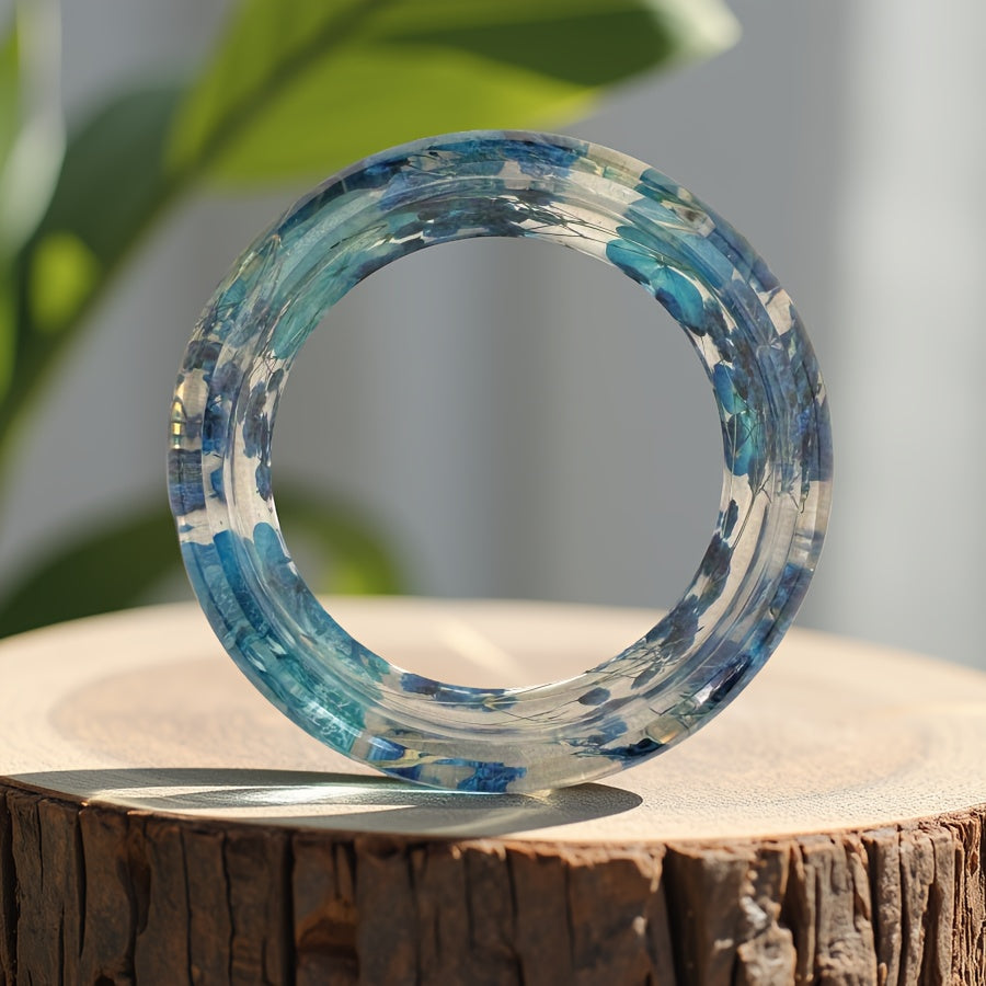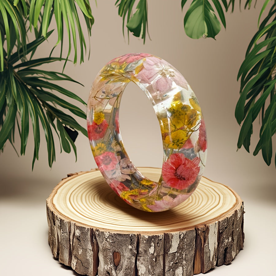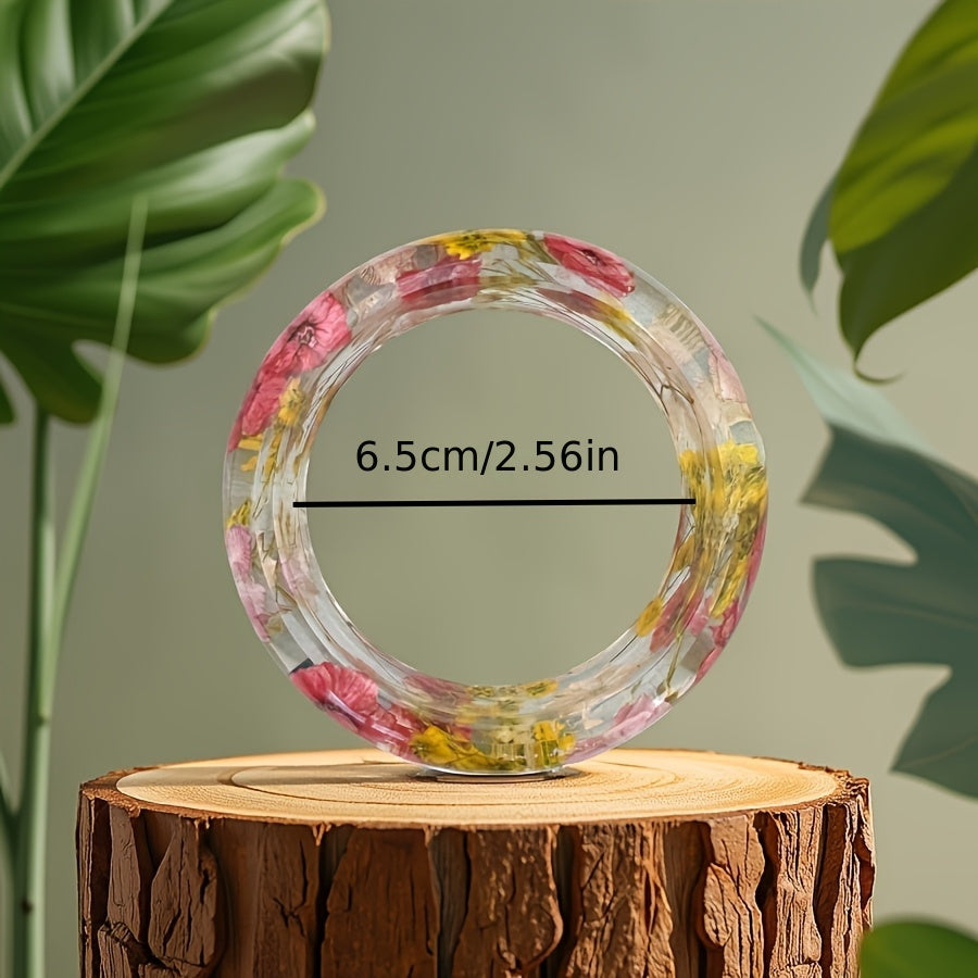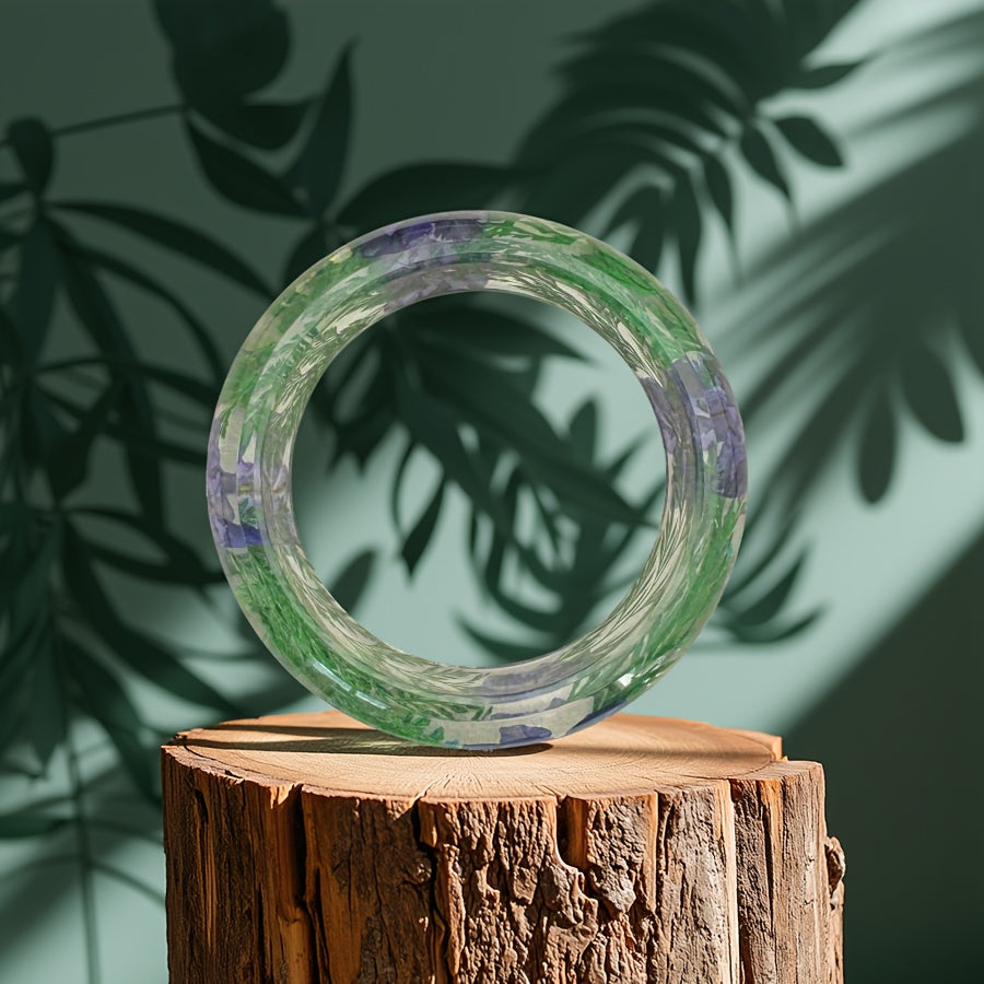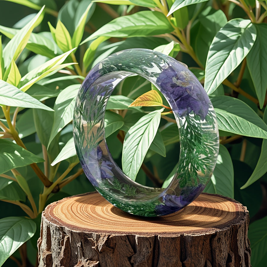 Elevate your look with this bohemian style resin bangle featuring real dried flower inlay in vibrant purple and crackle wood. Perfect for daily wear and casual attire.