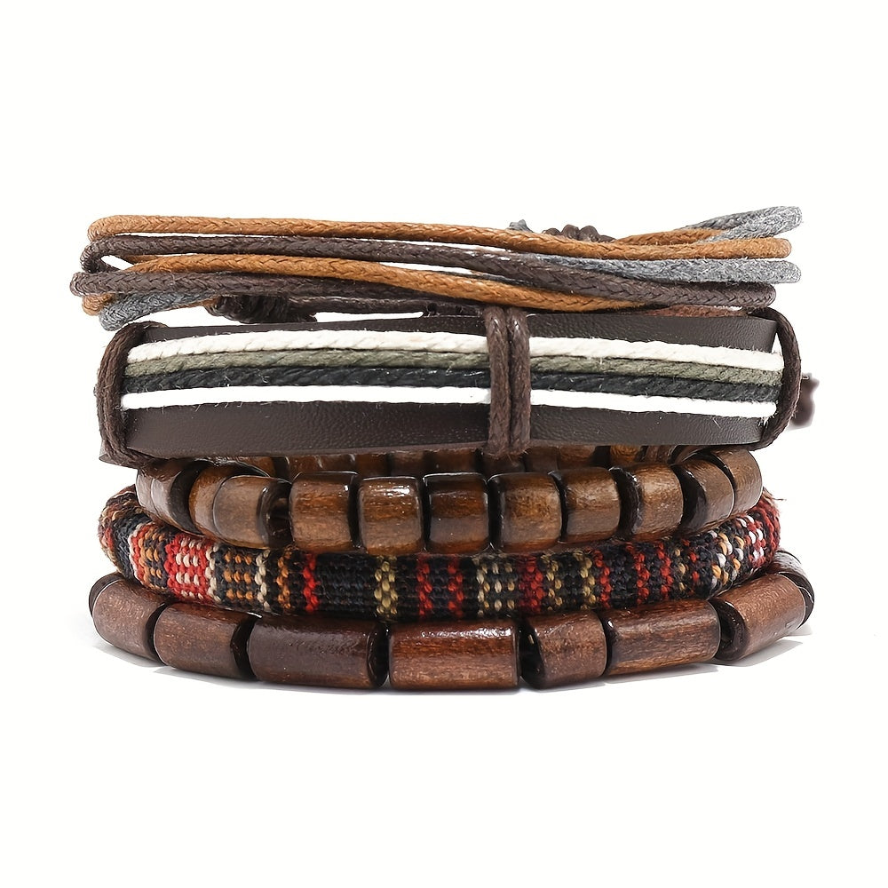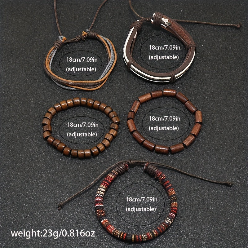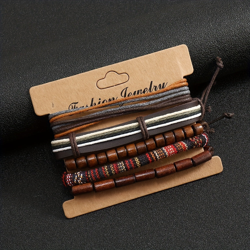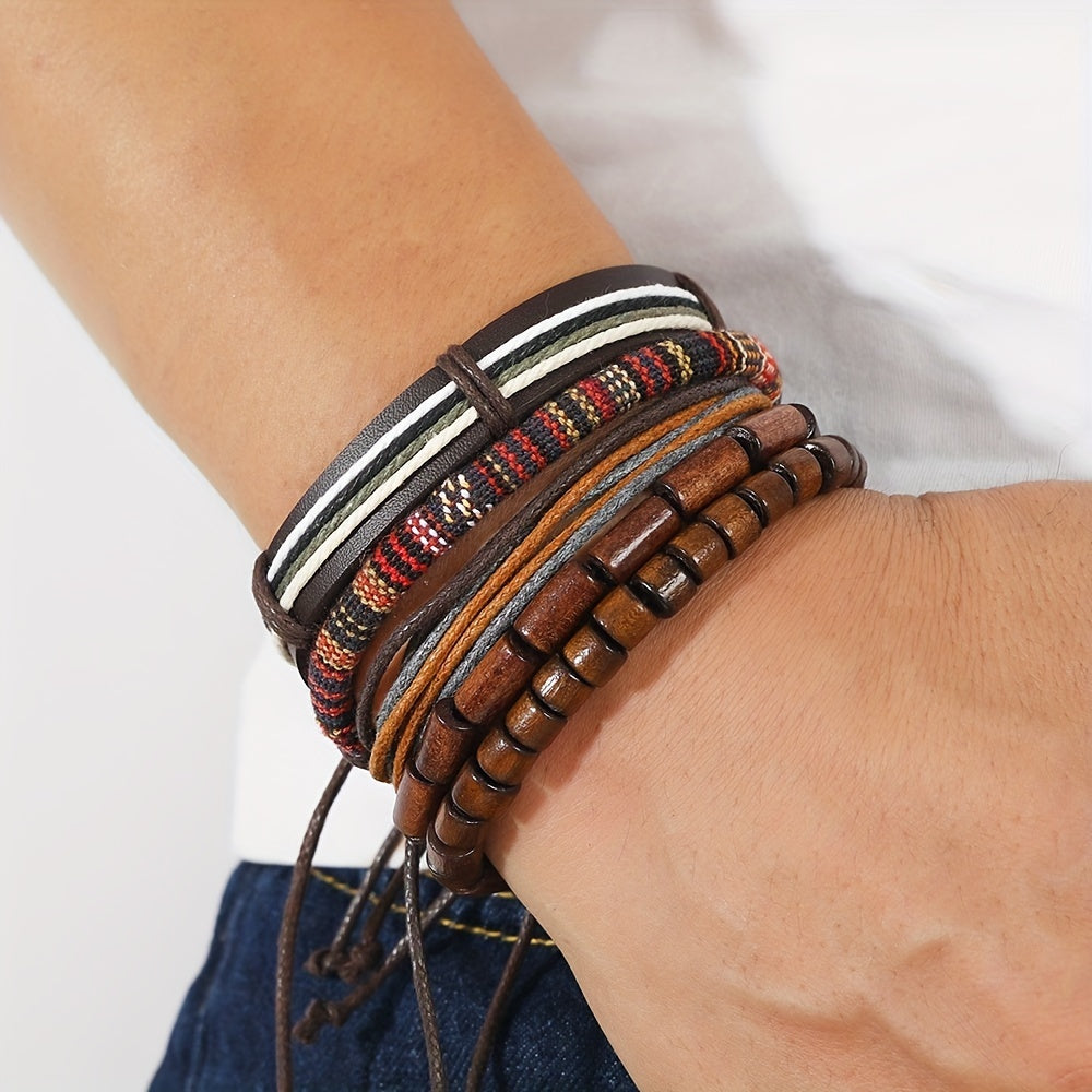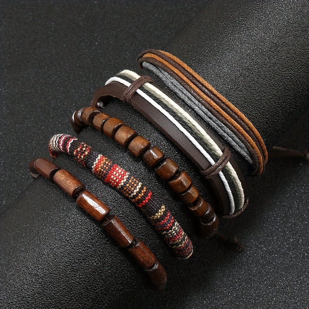 Elevate your style with this boho-inspired set of five bracelets featuring braided hand ropes, wooden beads, and vintage leather.