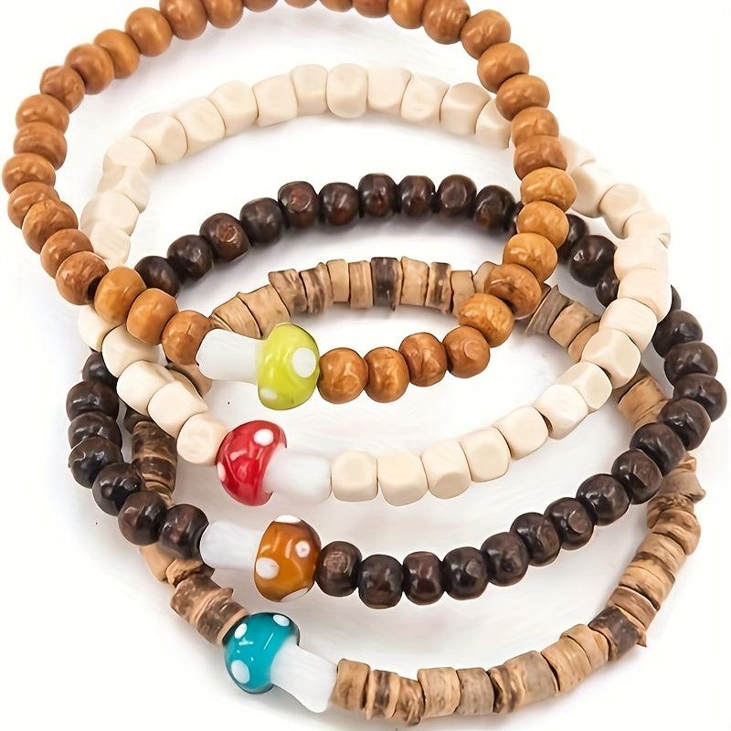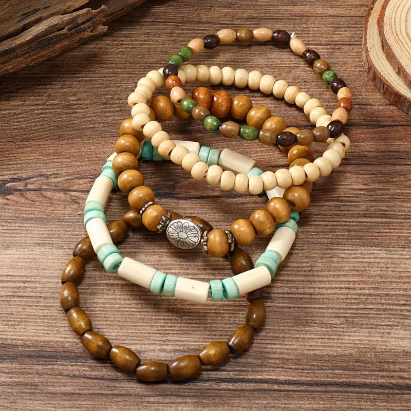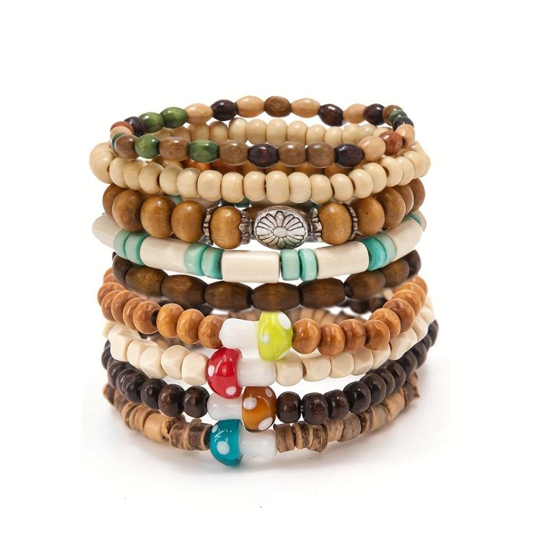This 9-piece bracelet set features a mix of vintage and modern styles with wooden beads, daisy charm, and floral accents. Perfect for stacking and creating a bohemian look.
