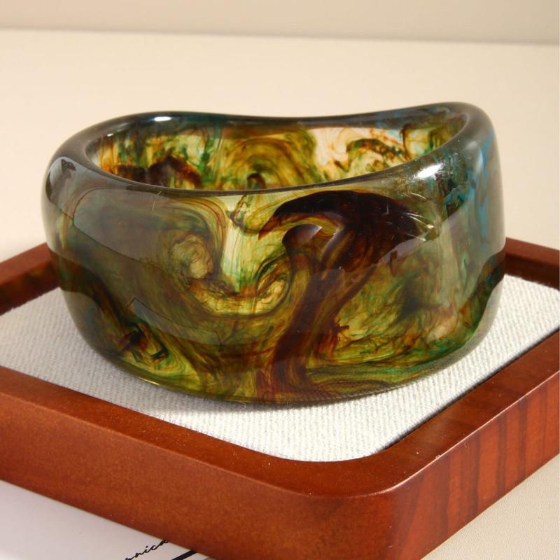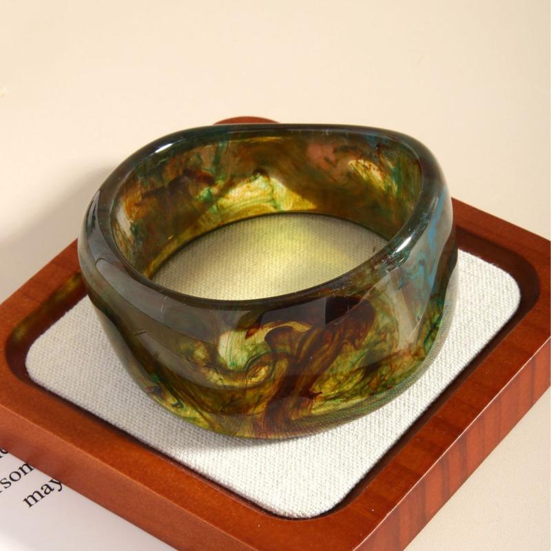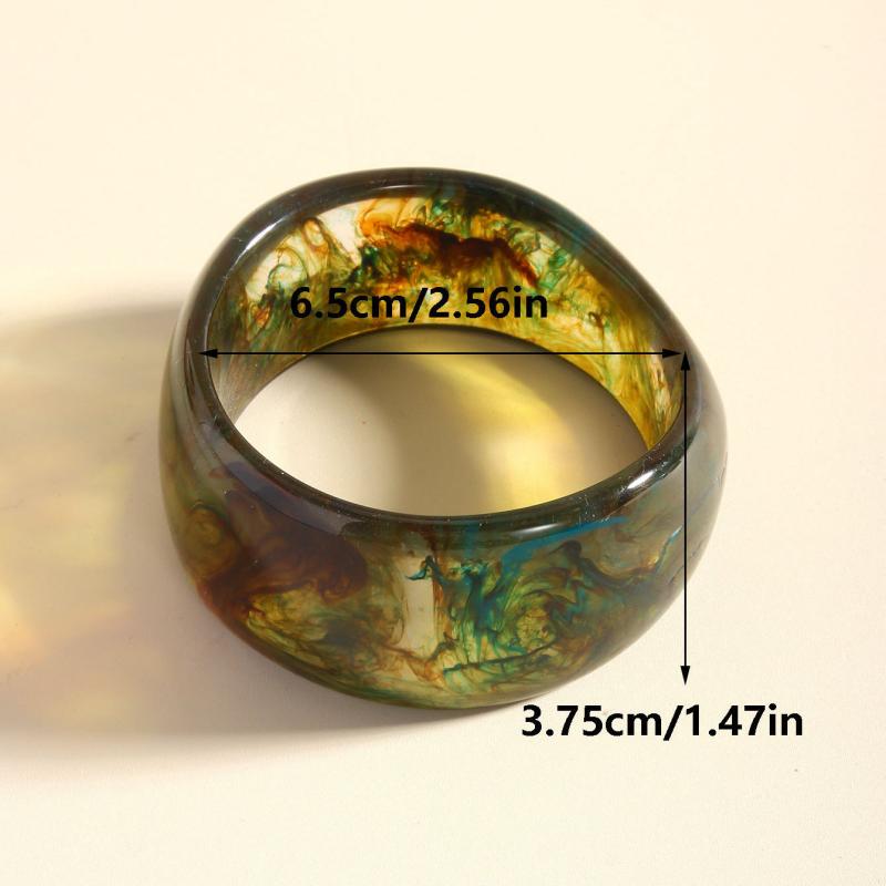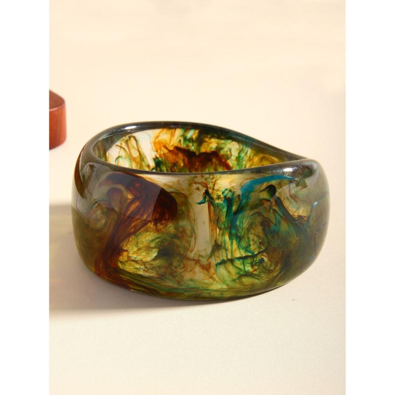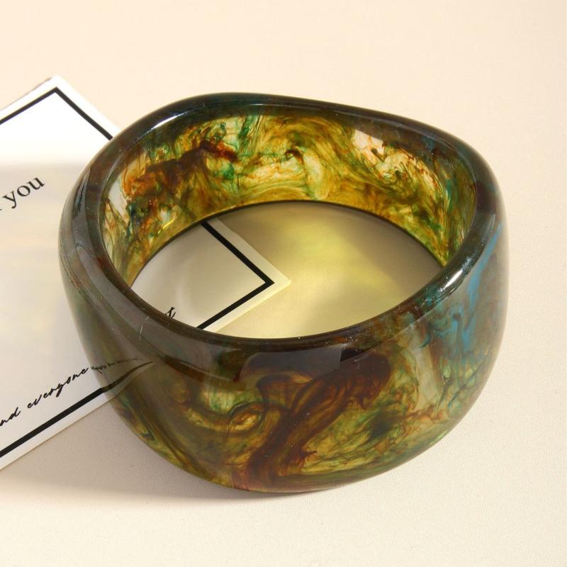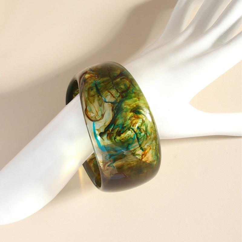Elevate your style with this striking marbled resin bracelet. Featuring a semi transparent gradient design in green and brown, this geometric cuff is perfect for everyday wear and special occasions.