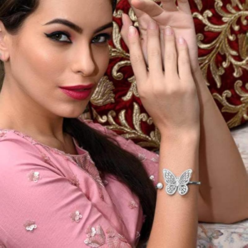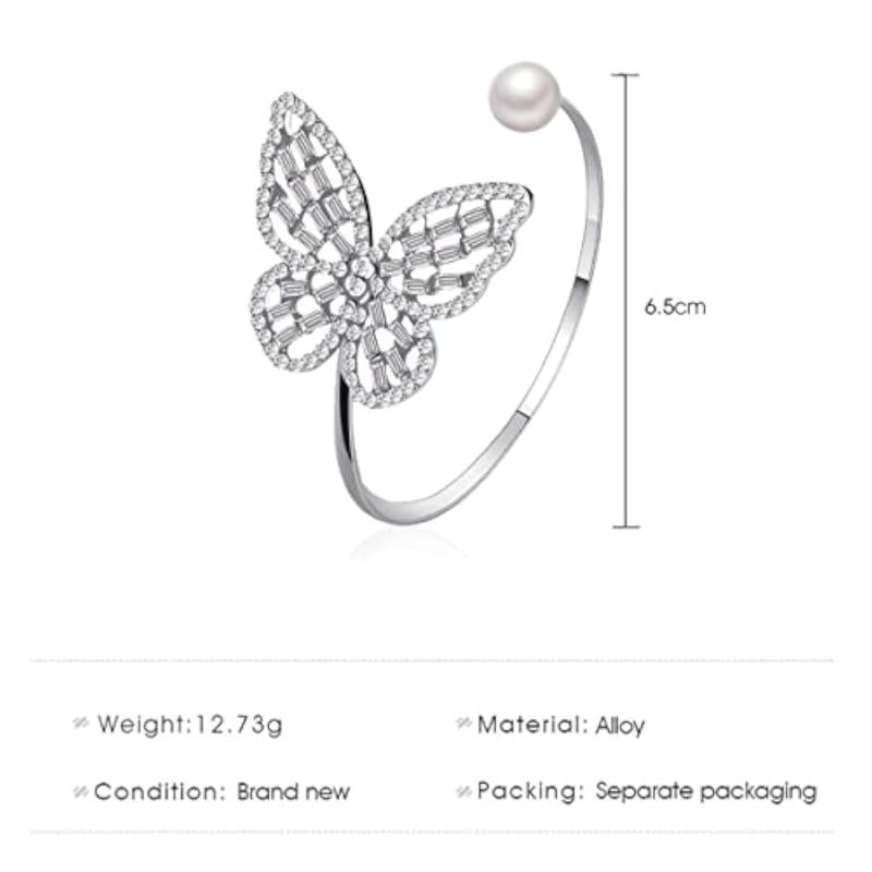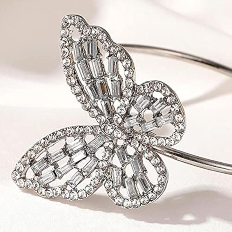 Elegant silver plated cuff bracelet with butterfly design and stunning stone studs, perfect for any occasion.