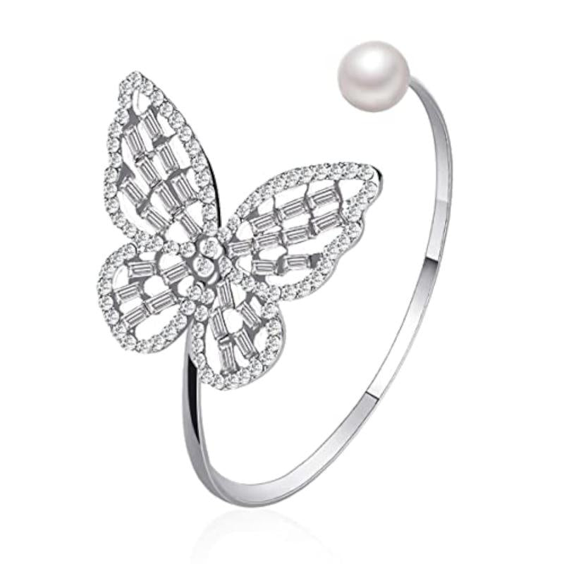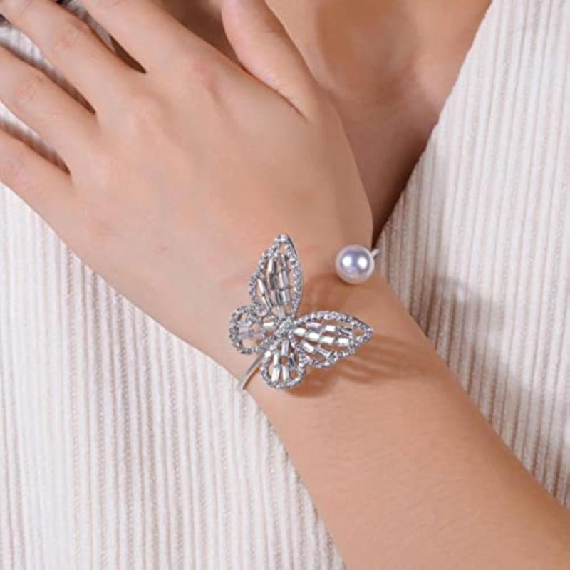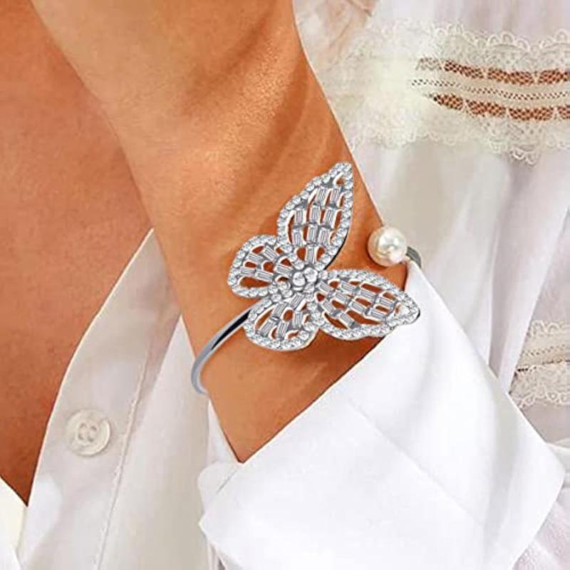 Adorn your wrist with this elegant silver plated cuff bracelet featuring a butterfly design and stone embellishments.