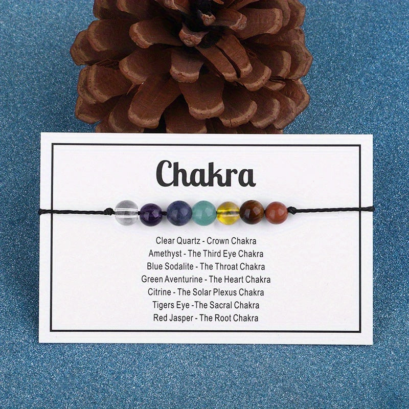 This Chakra Stone Bracelet features smooth round shape beads on a rope bracelet, perfect for yoga, meditation, and anxiety relief. It makes a thoughtful jewelry gift.