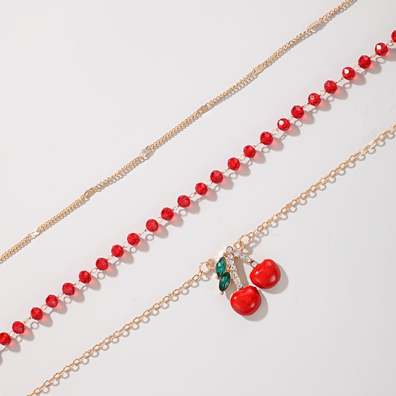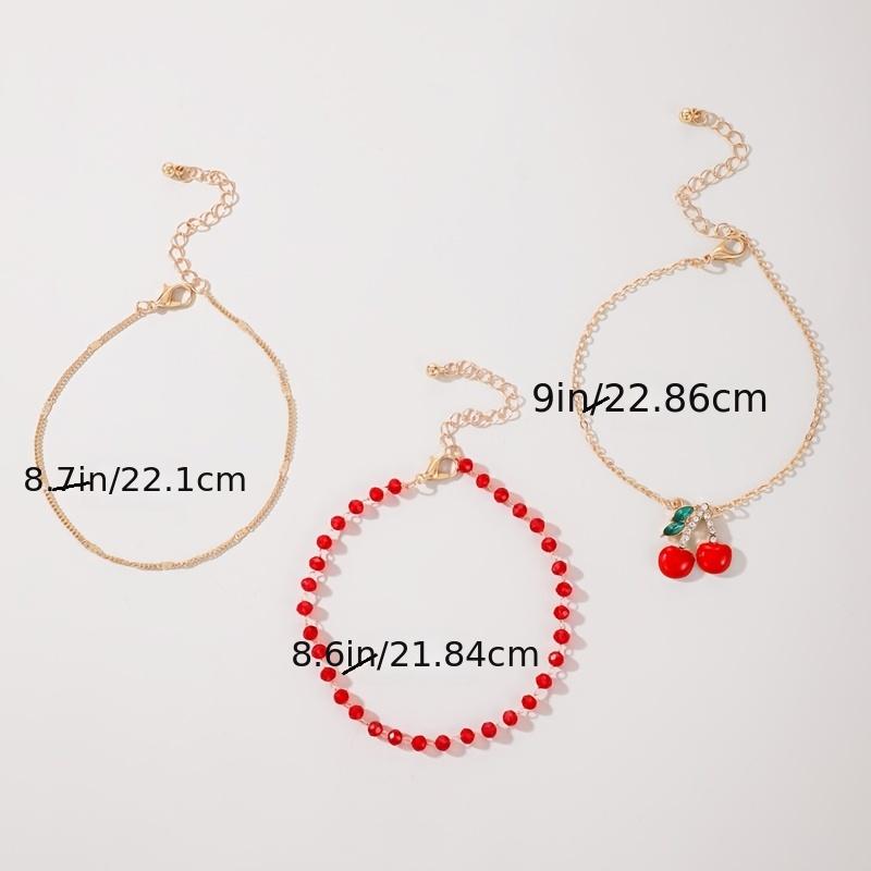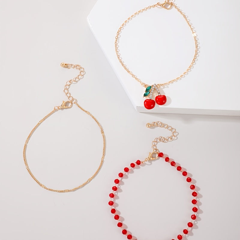 Adorn your ankles with this 3-piece anklet set featuring cherry fruit pendants. Perfect for a boho look, these ankle bracelets add a fun touch to your outfit.