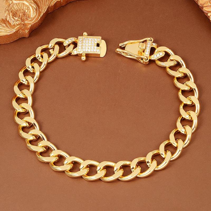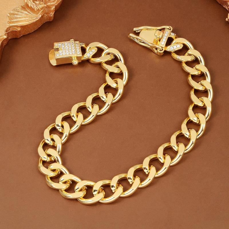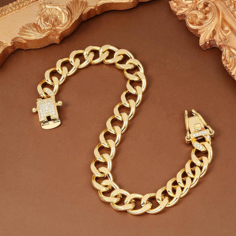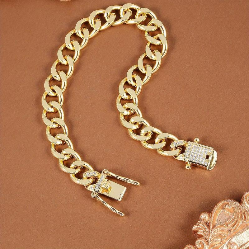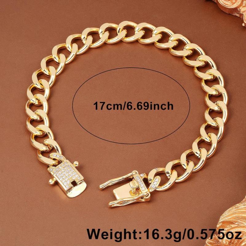 Elevate your everyday and special occasion looks with this chunky golden chain bracelet featuring interlocking links and sparkling accents. Made from high-quality metal, this durable piece offers versatile styling options.