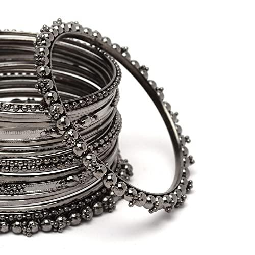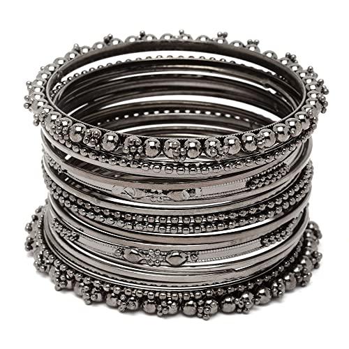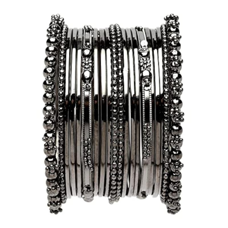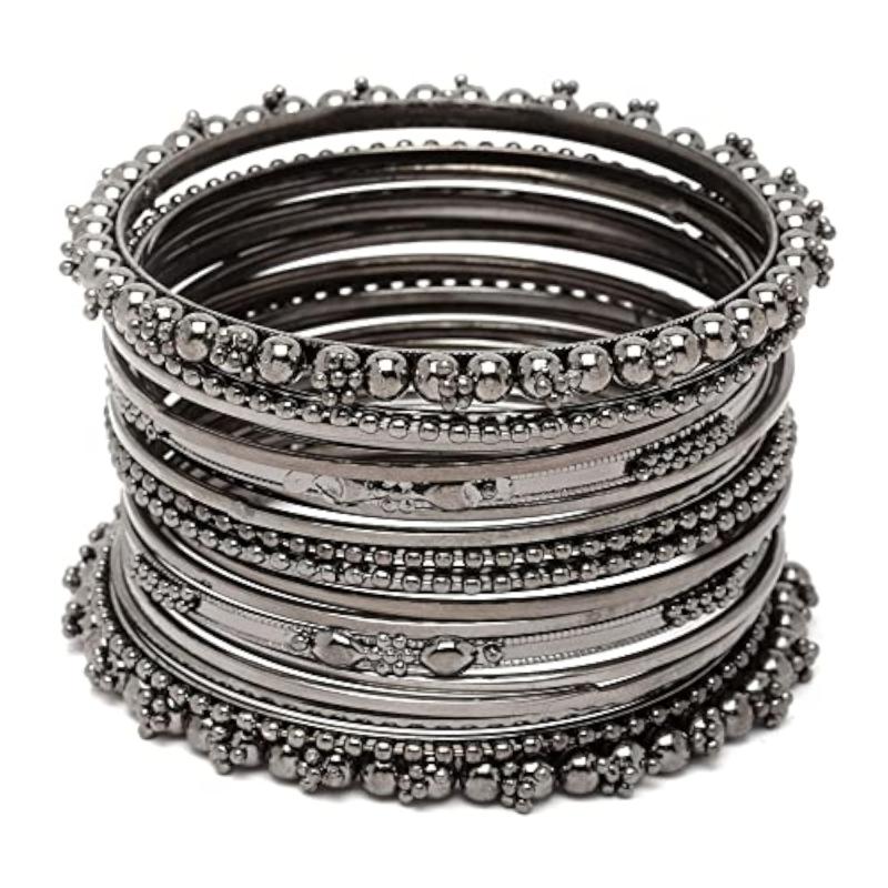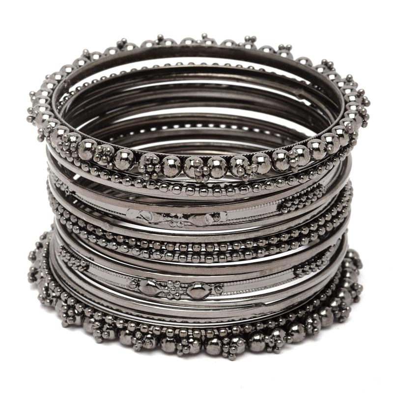 Elegant bangle set featuring textured design, made of oxidised silver-plated metal. Perfect for adding a touch of sophistication to any outfit.