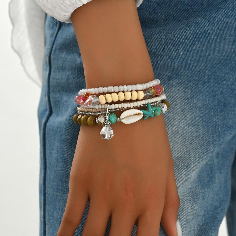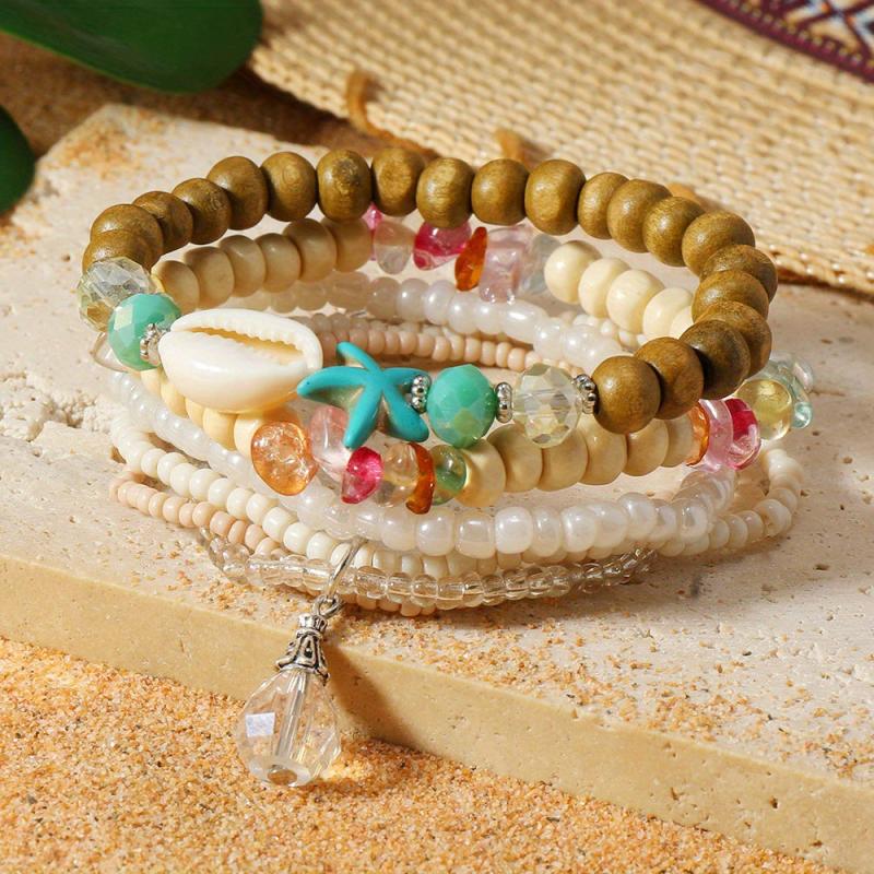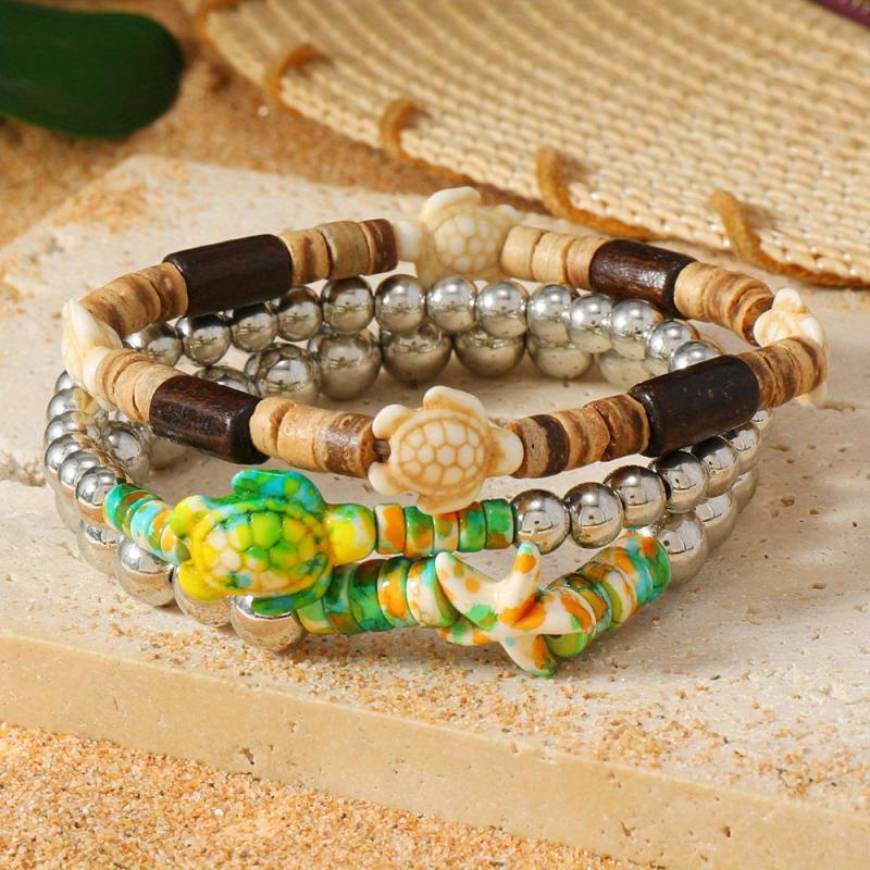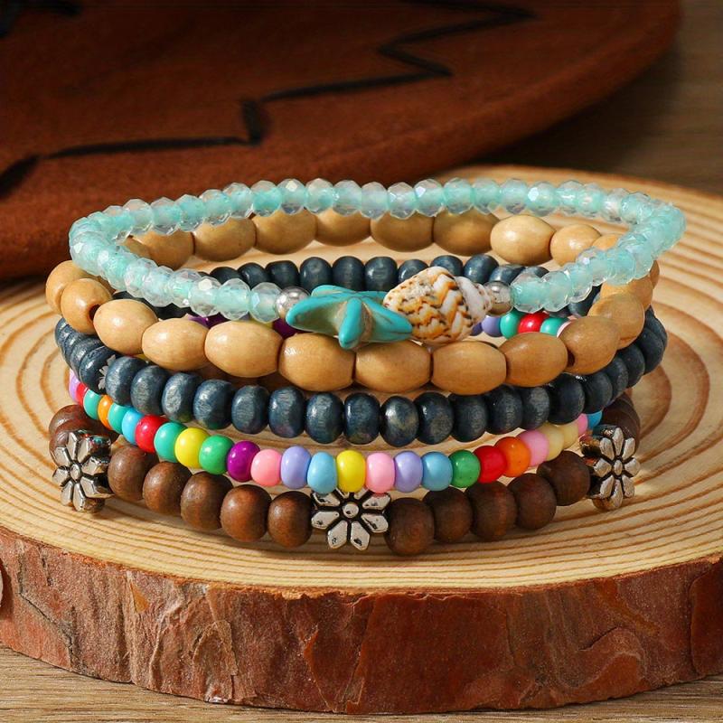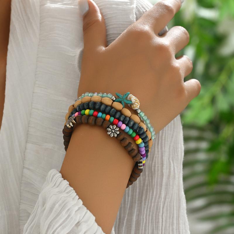 Add a touch of bohemian chic to your outfit with this colorful beaded bracelet set featuring turtle shell and flower wooden bead pieces. Perfect for daily wear or as a vacation accessory.