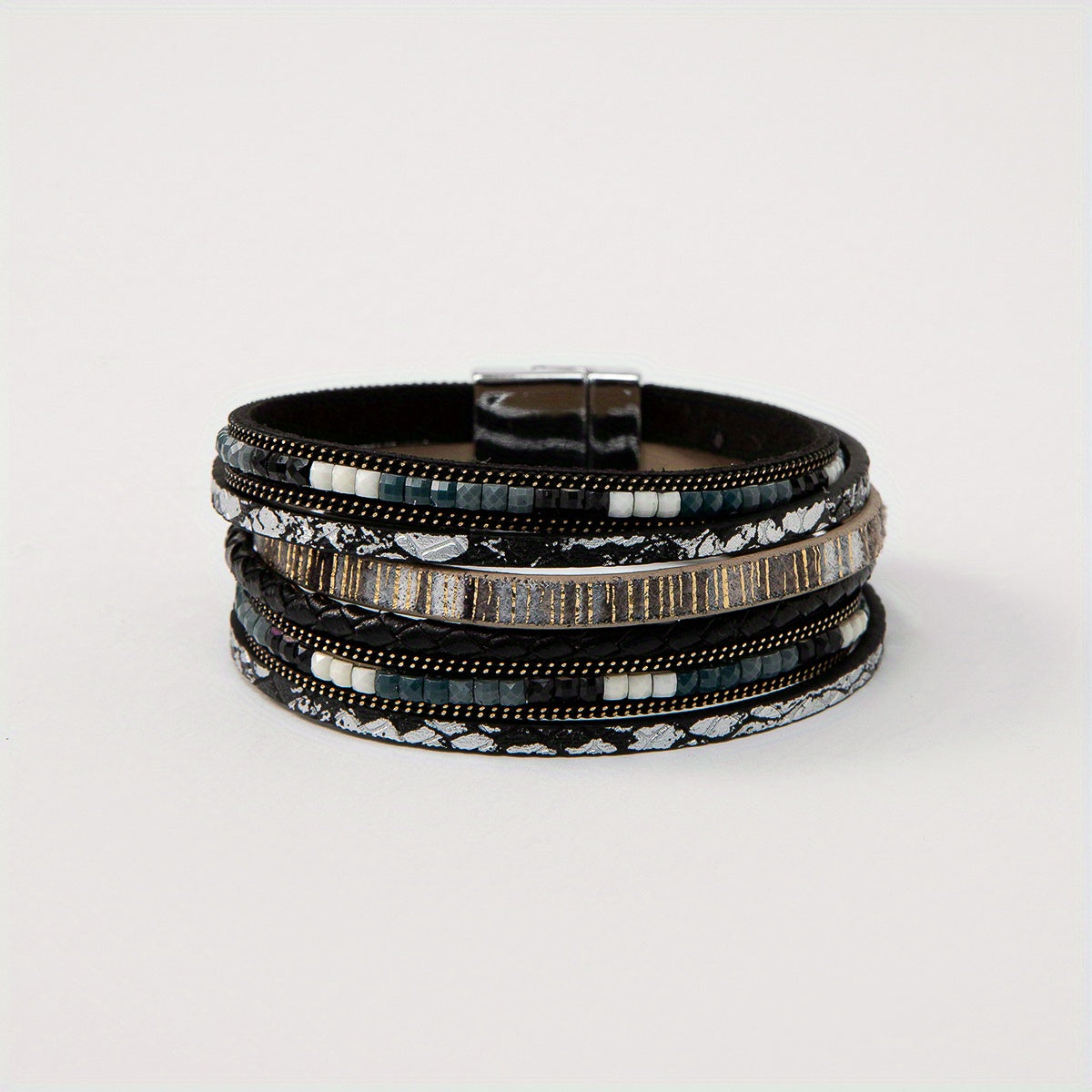 Add a vibrant touch to your outfit with this colorful PU leather wrap bracelet featuring a magnetic buckle. Perfect for boho style lovers.
