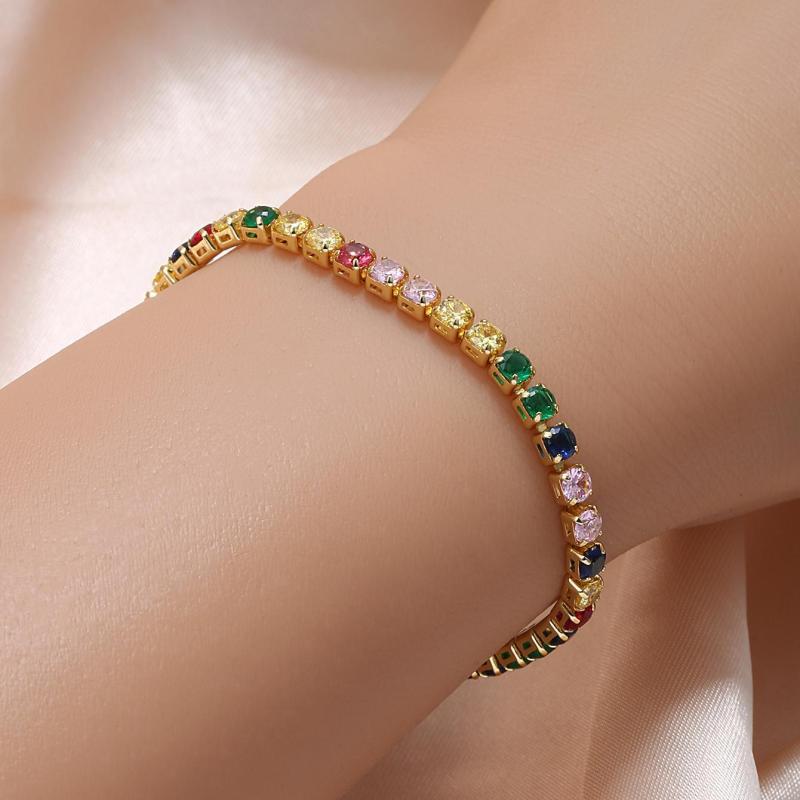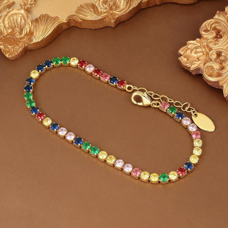 Add a touch of elegance to your daily look with this colorful cubic zirconia bracelet. Crafted with a copper base and coated in golden plating, this sophisticated accessory is perfect for all seasons.