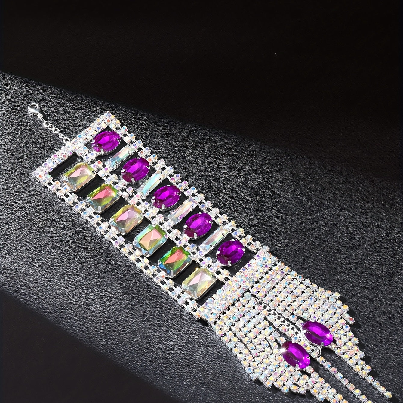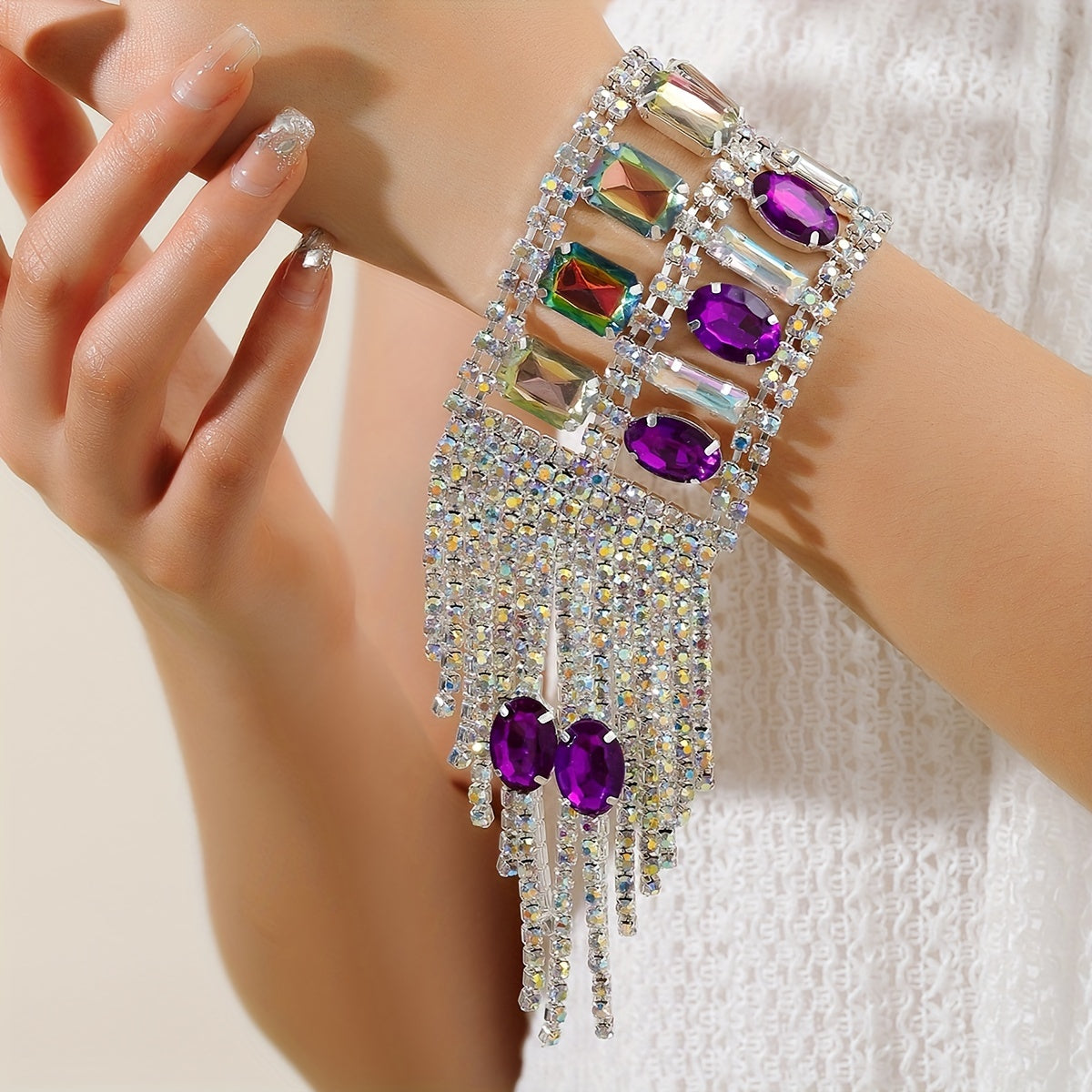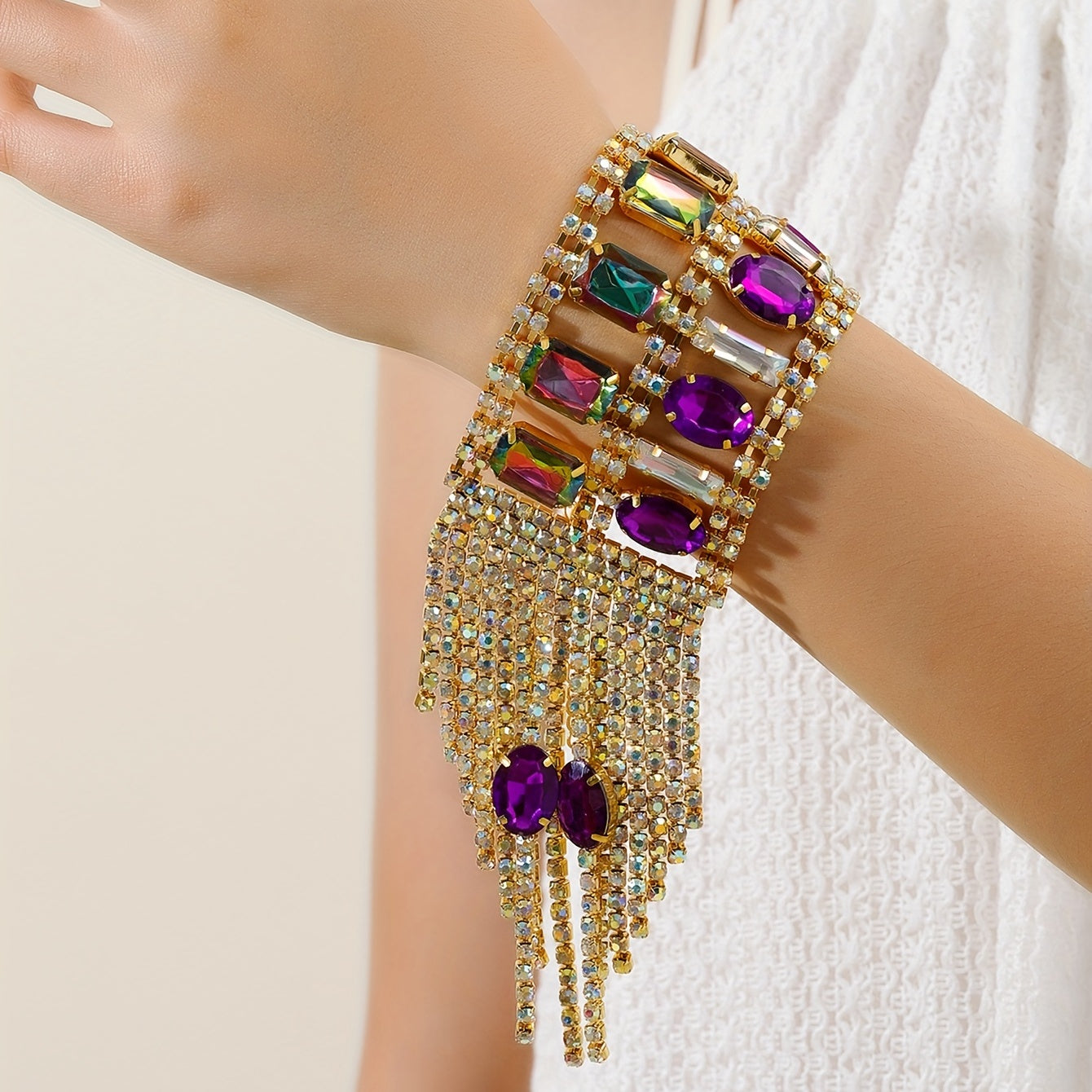 Make a statement with this eye-catching crystal hollow geometric bangle featuring oversized long tassel and rhinestone details. Perfect for parties and special occasions.