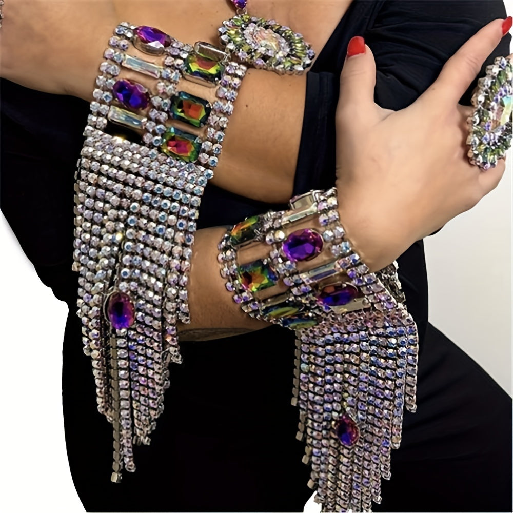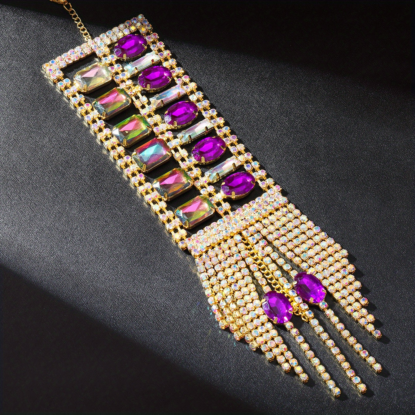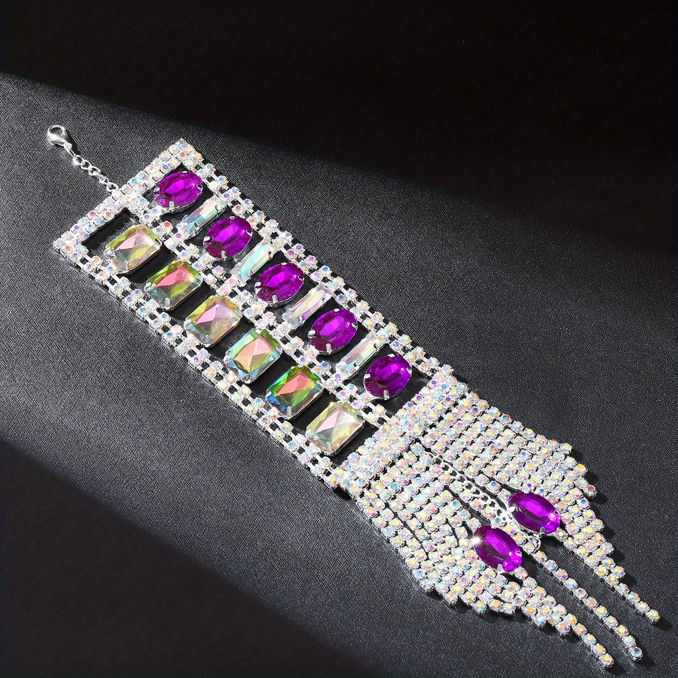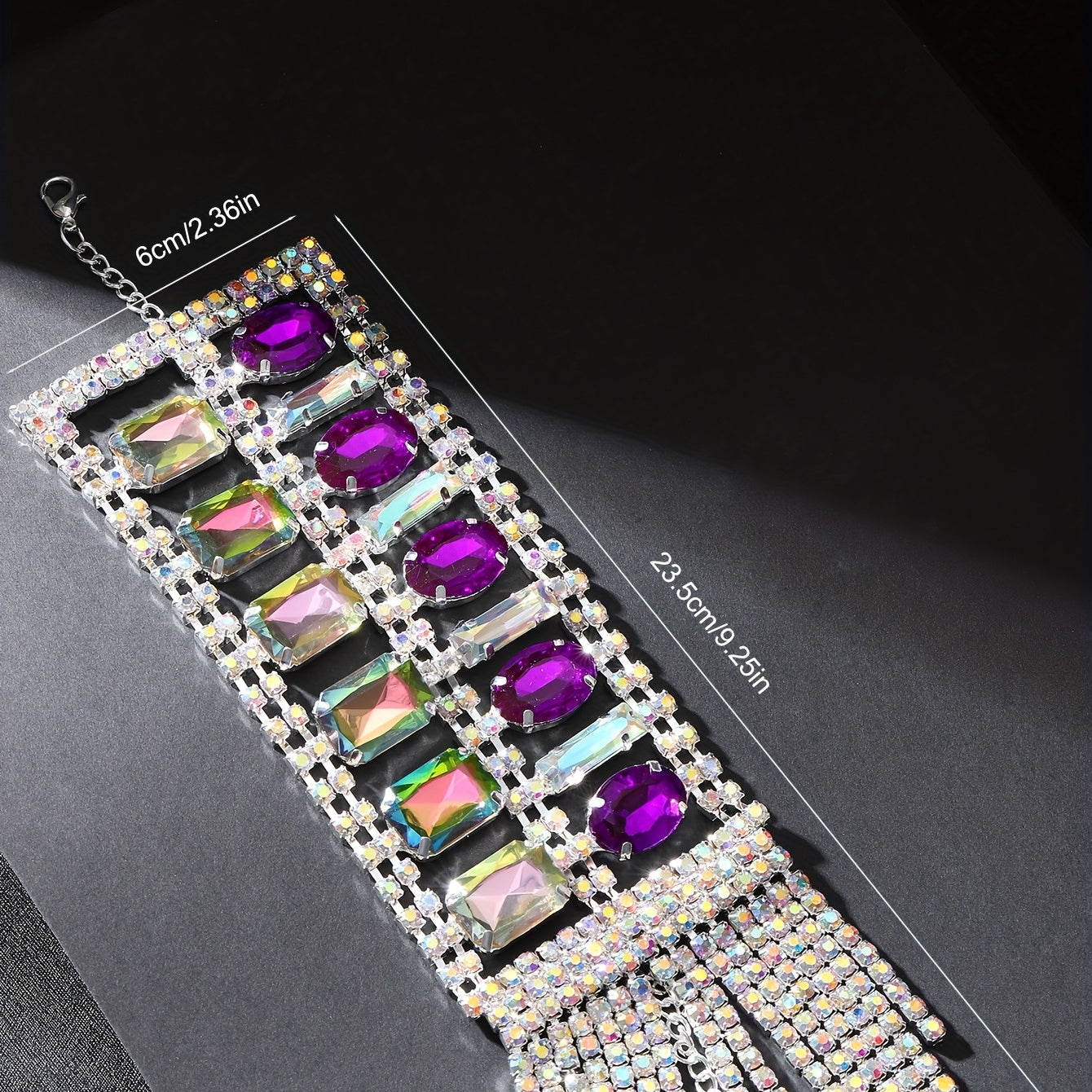 Make a statement with this eye-catching crystal hollow geometric bangle featuring oversized long tassel and rhinestone details. Perfect for parties and special occasions.