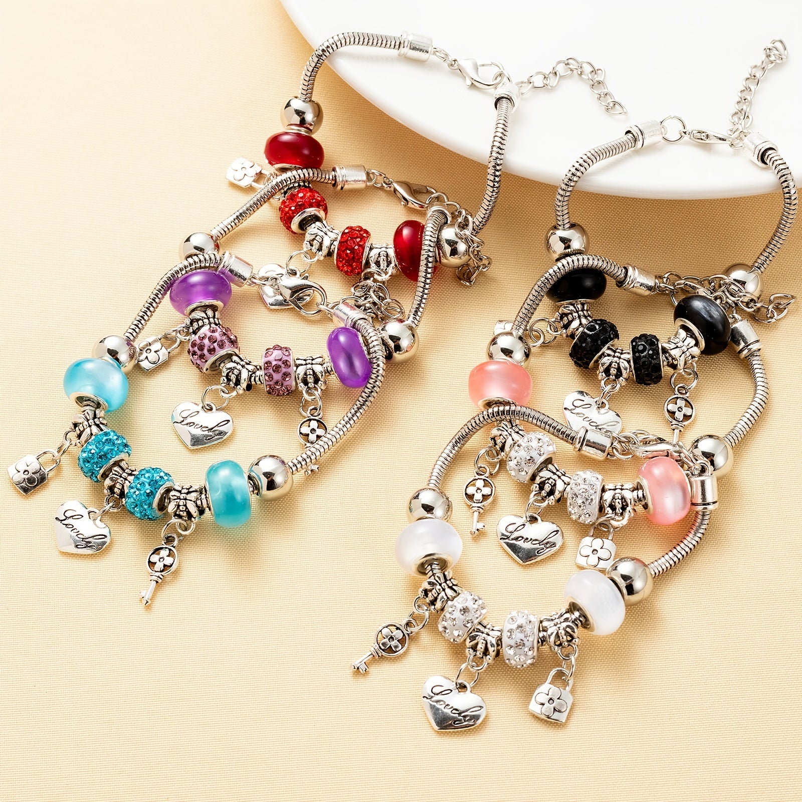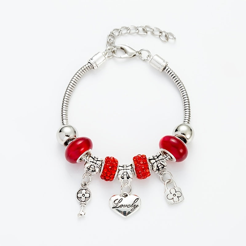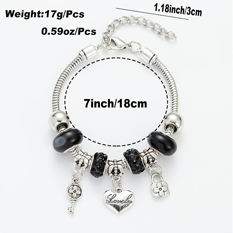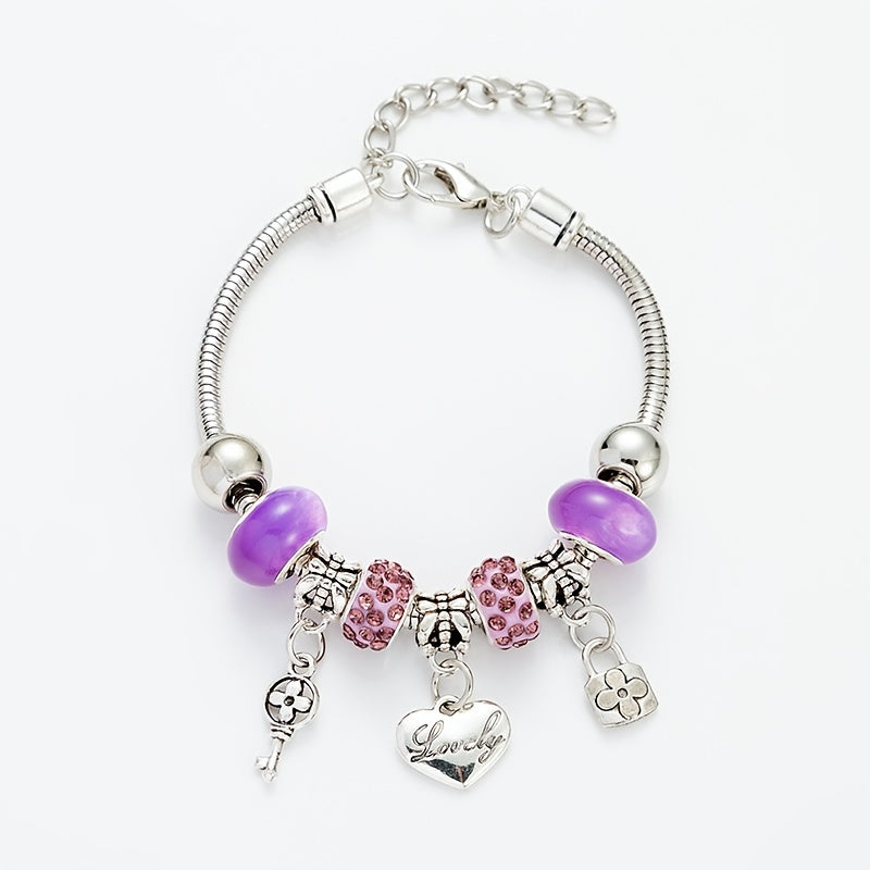 This DIY bracelet features glass beads in 6 vibrant colors with a key lock love charm. It's a fashionable and meaningful accessory perfect for gifting.