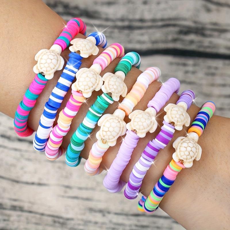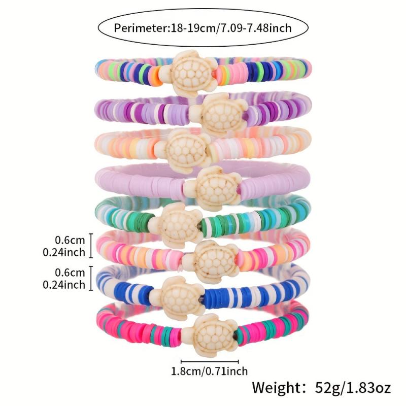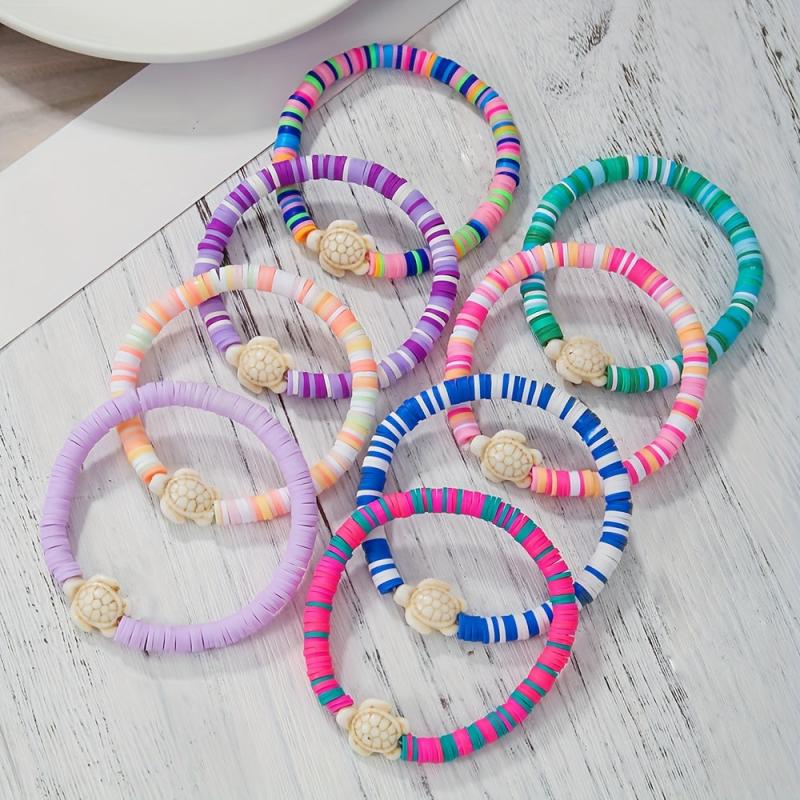 Get ready for a beach holiday with this vibrant Porsilia bracelet set. Made of polymer clay, this set features a fresh and colorful design with a cute turtle charm. Perfect for layering or wearing alone.