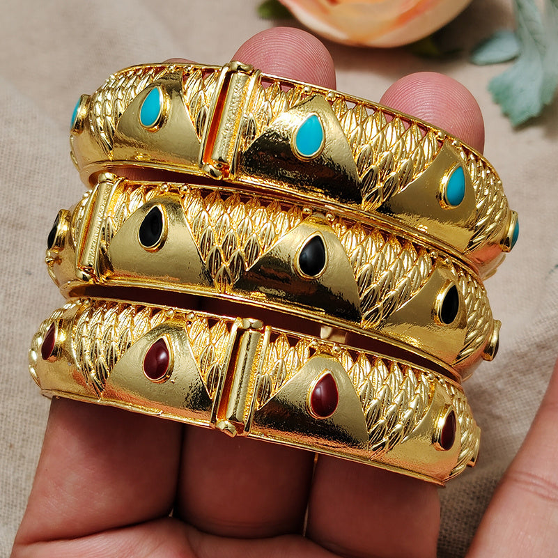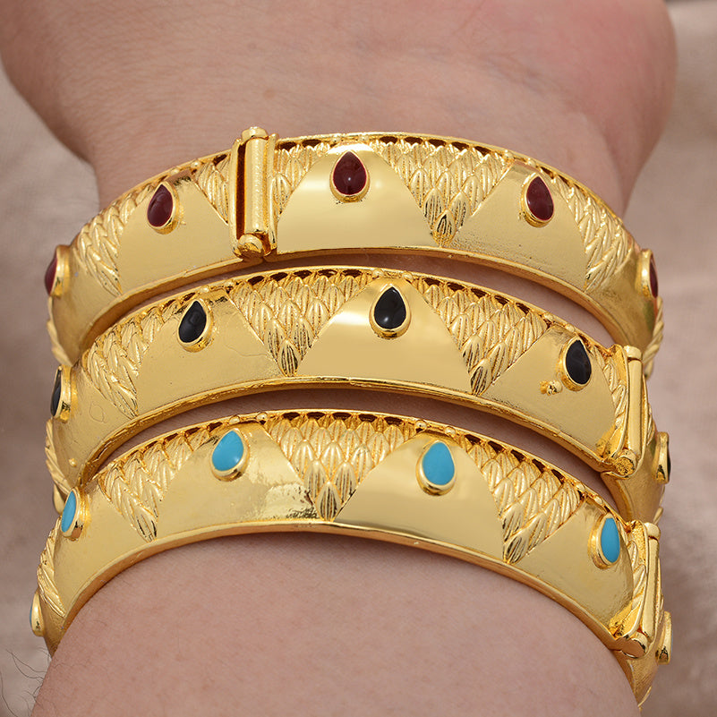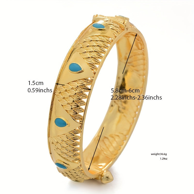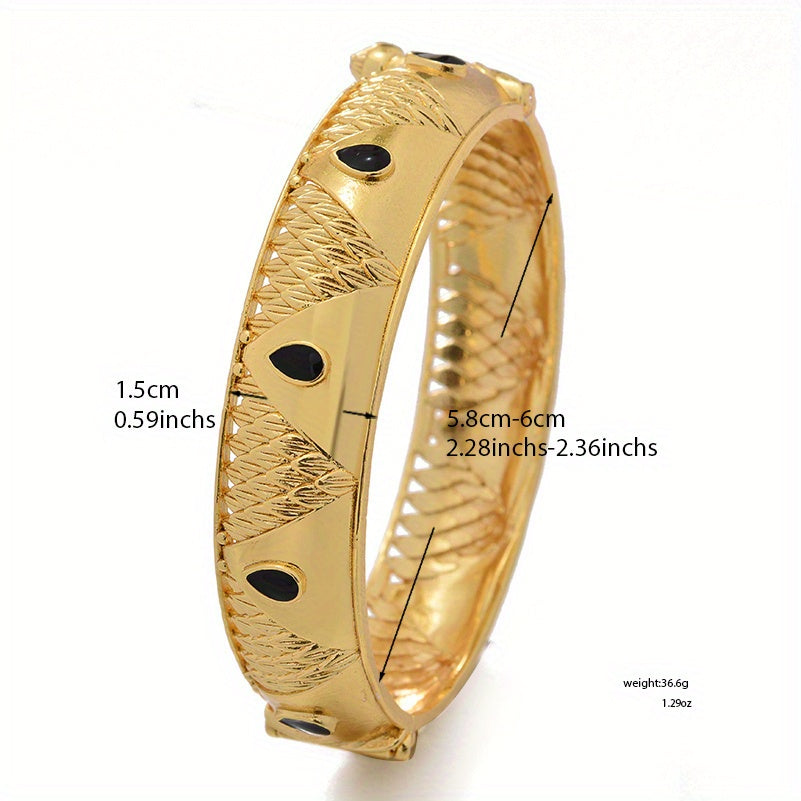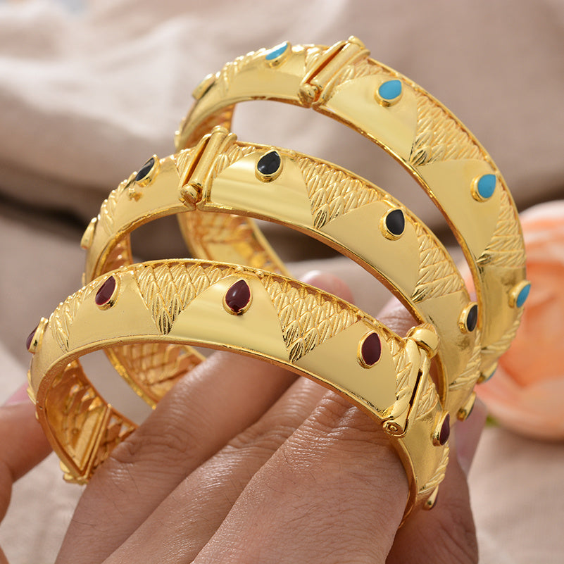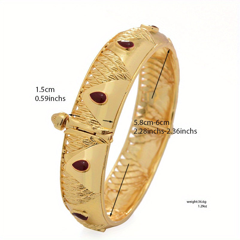 Elevate your style with this stunning golden bangle featuring a colorful teardrop shape pattern. This 24K plated hand jewelry is a perfect accessory for any outfit.