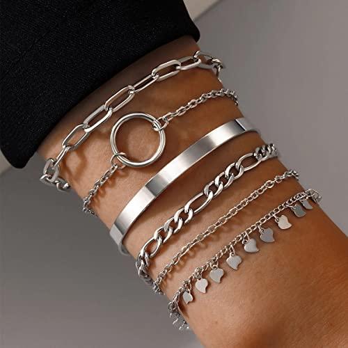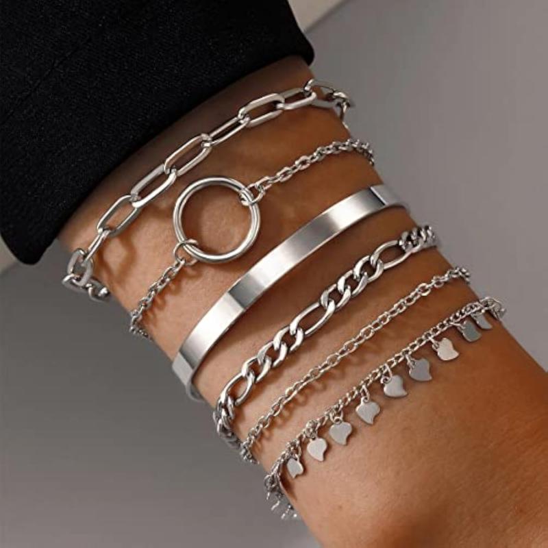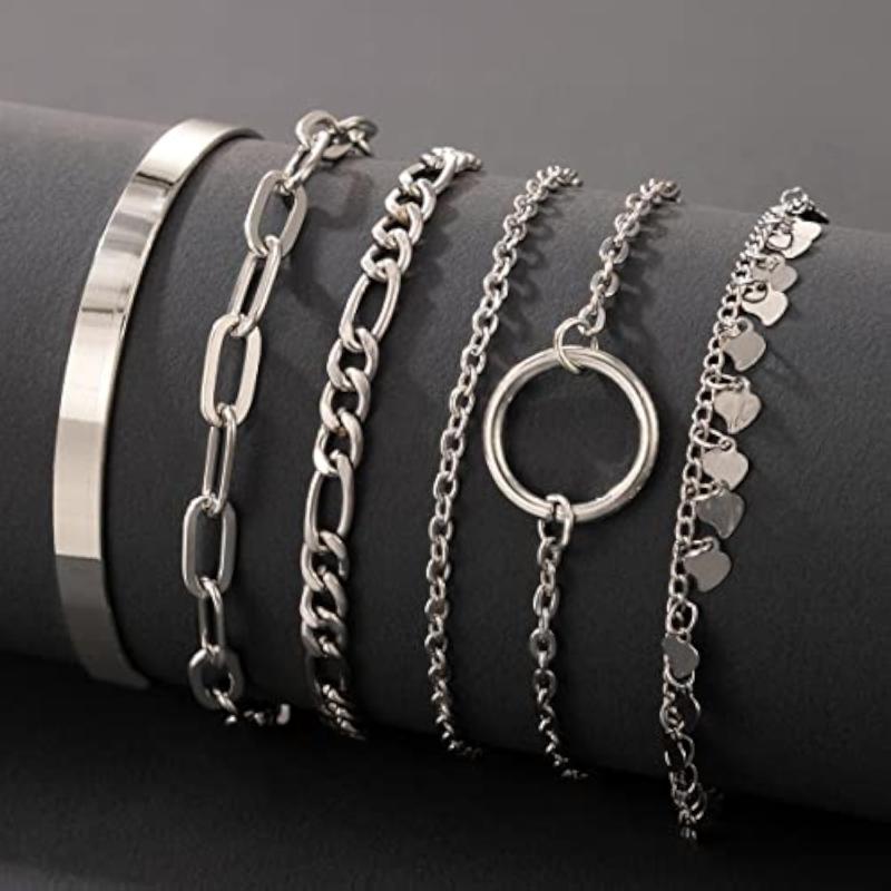 Elevate your style with this set of 6 stackable bracelets featuring a contemporary design in toned plated finish.