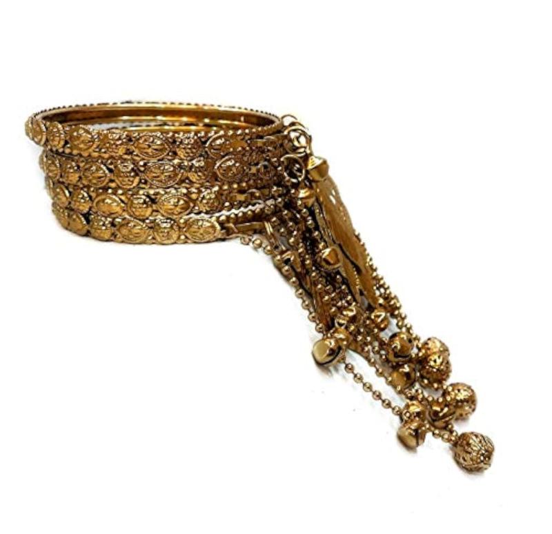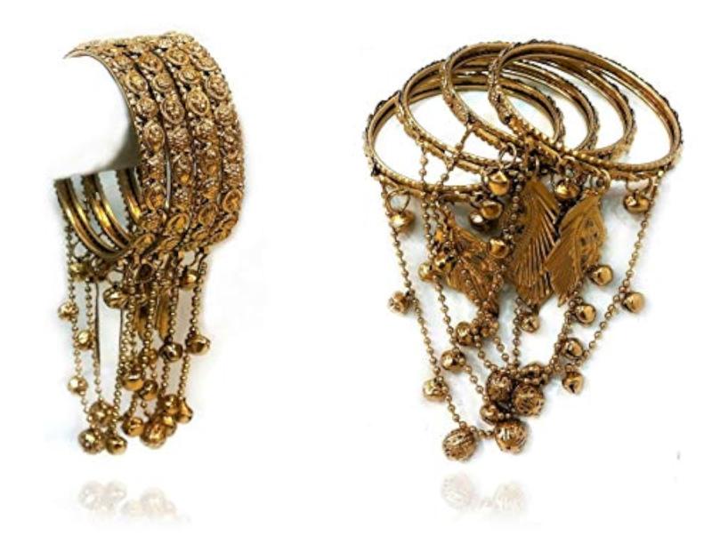 Elegant set of 8 copper bangles adorned with small pearls, perfect for brides. Features Latkan & Ghugaroo for added style.