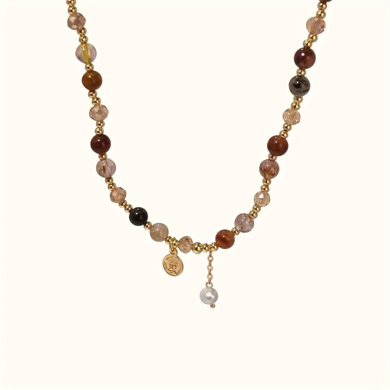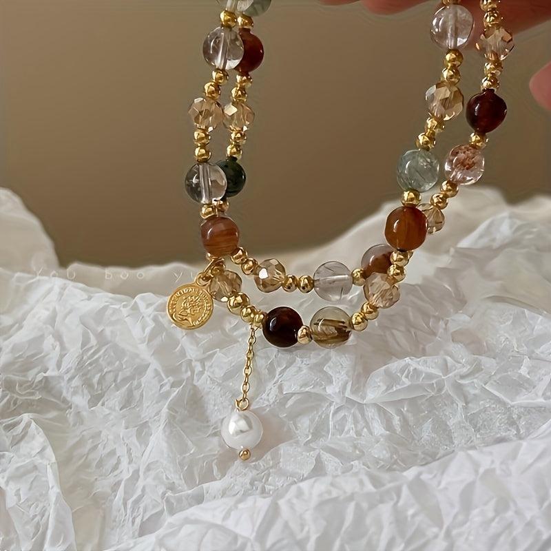Elegant vintage inspired copper beaded bracelet with double layer design and pearl charm. Features golden accents and assorted bead colors. Perfect everyday accessory or gift for any occasion.