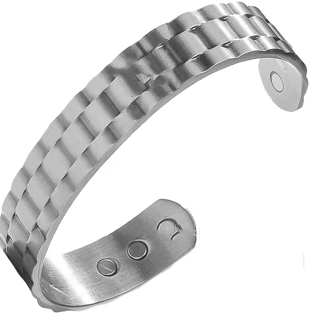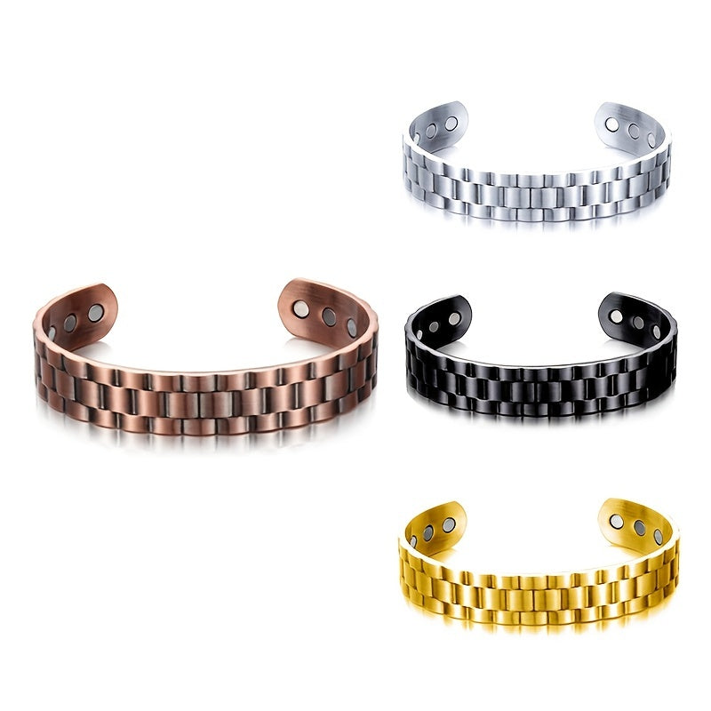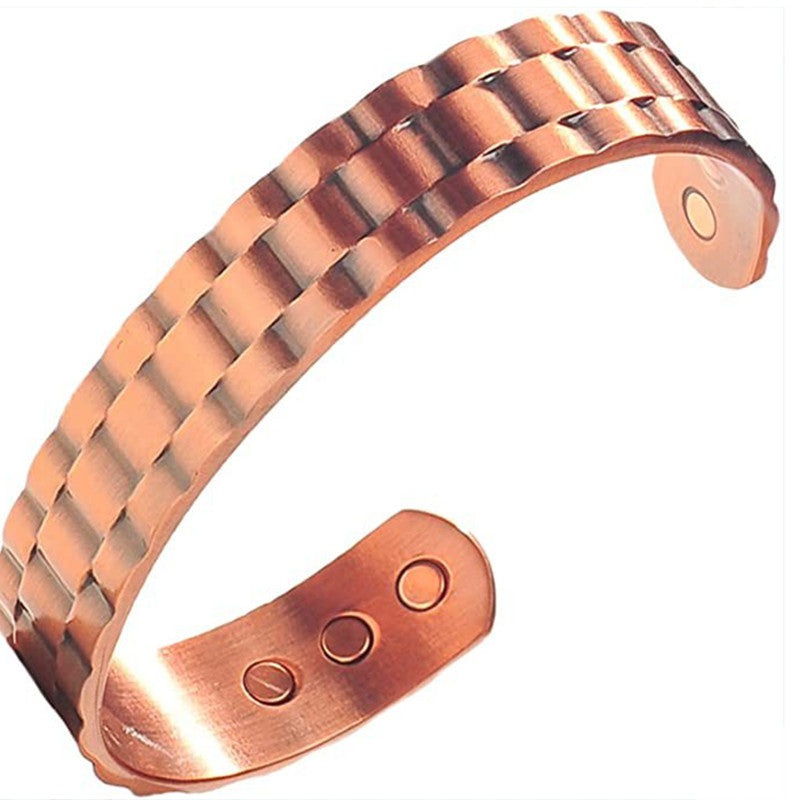 Stylish and magnetic, this men's bracelet features a wide panel design with a copper plated finish. The braided structure adds a unique touch to your look.