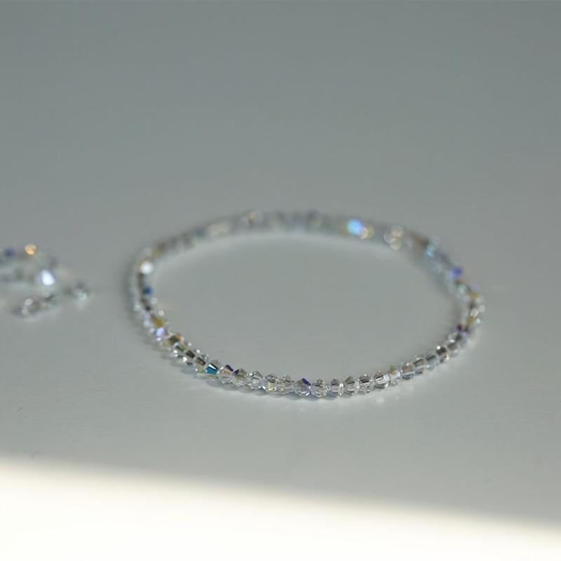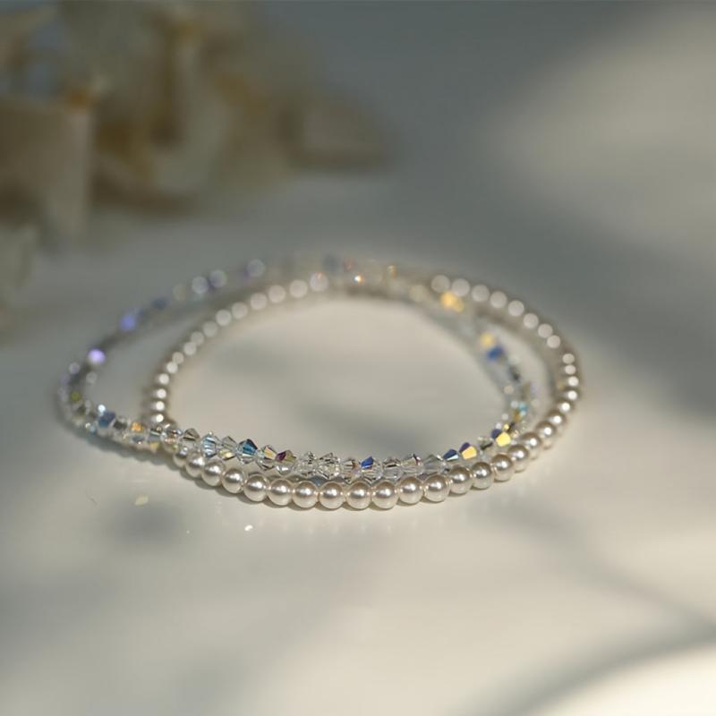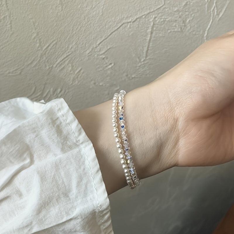 Elegant interwoven bracelet featuring crystal beads, freshwater pearls, and dreamy pastel charms. Perfect for daily wear and vacation accessorizing.