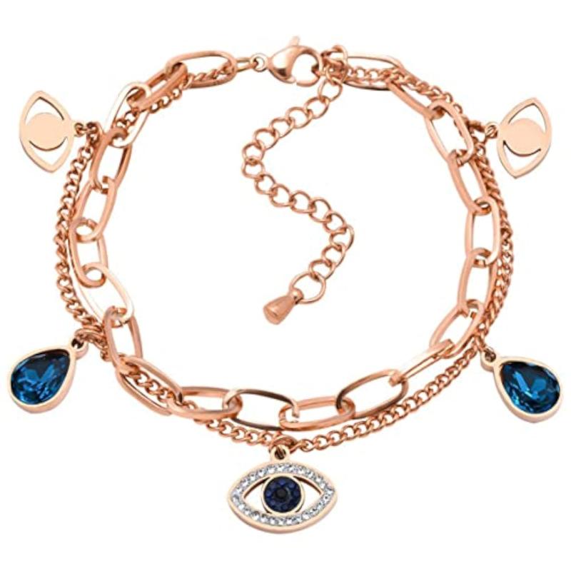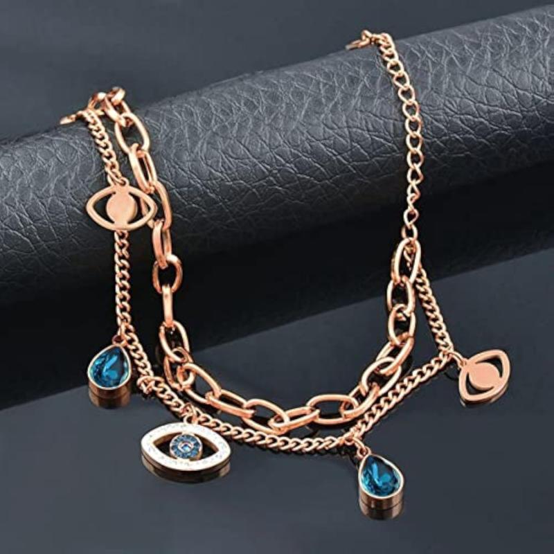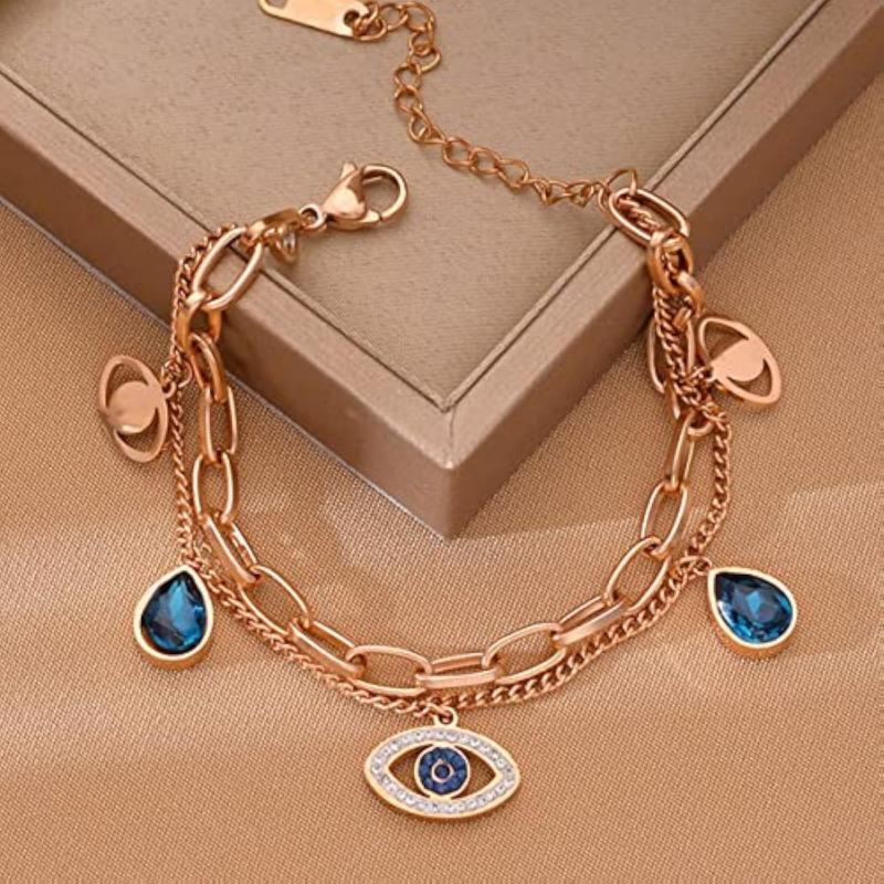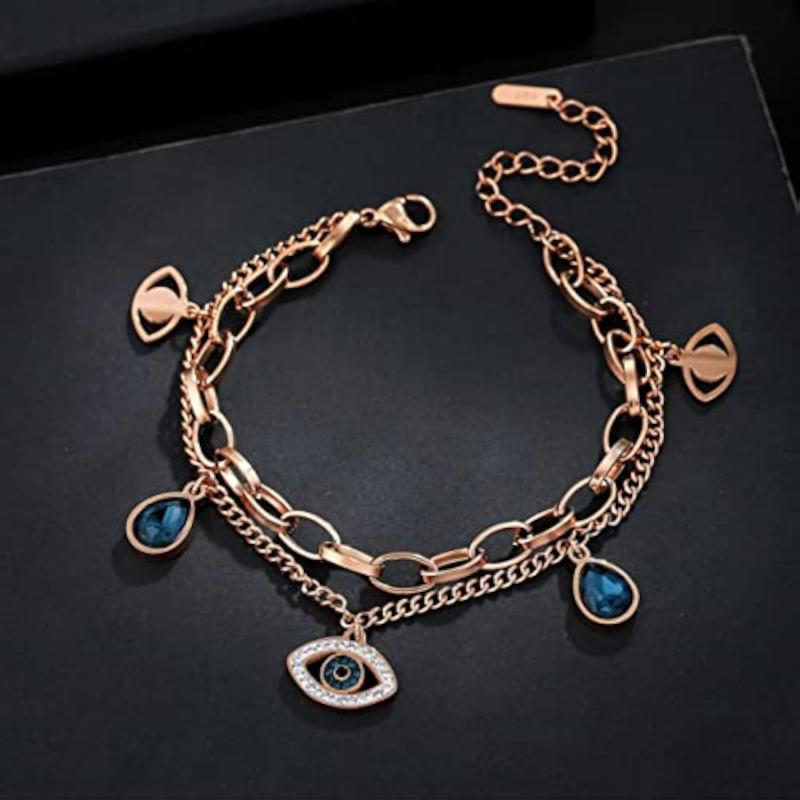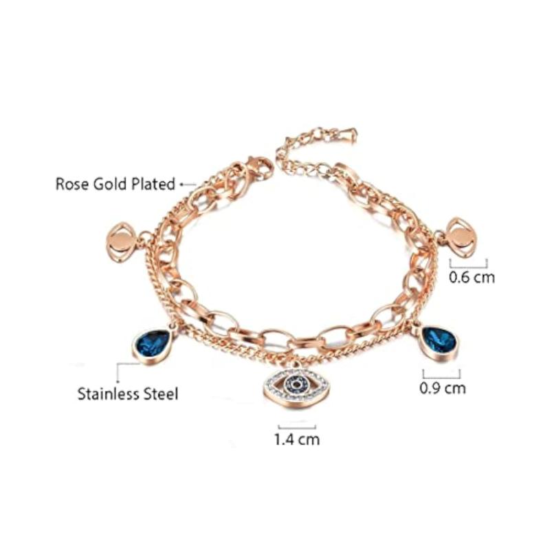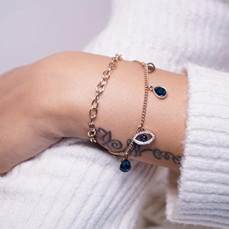 This stunning evil eye bracelet is crafted with plated stainless steel to prevent tarnishing. The evil eye charm is adorned with sparkling crystals for a touch of glamour.