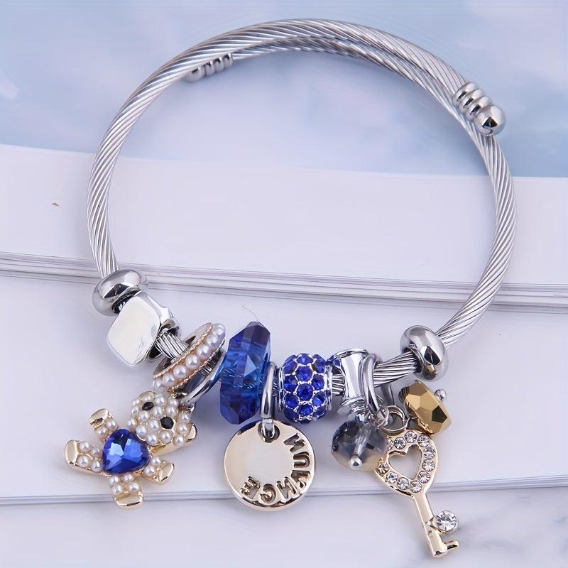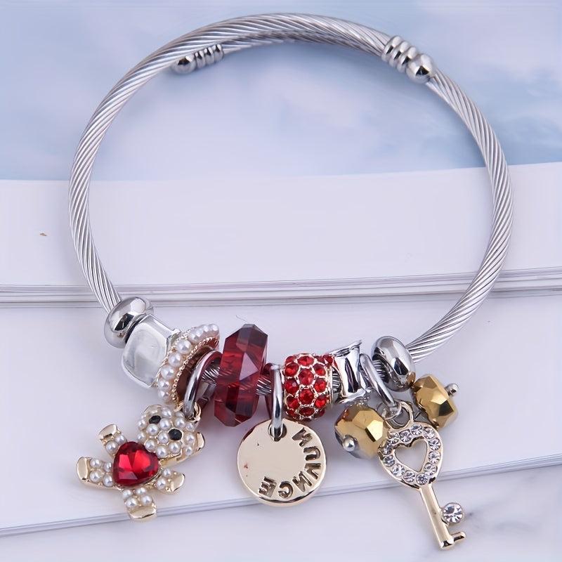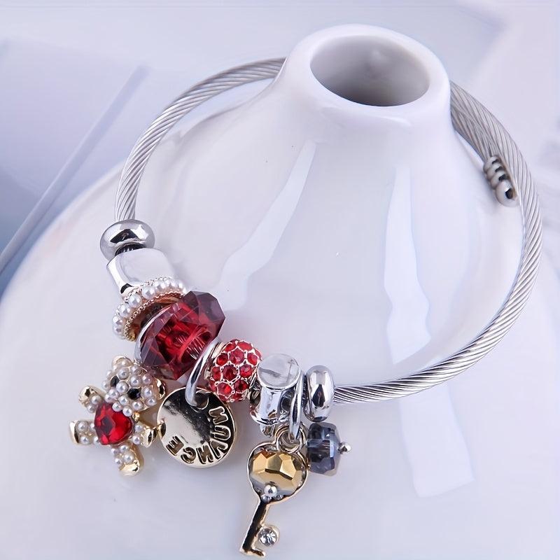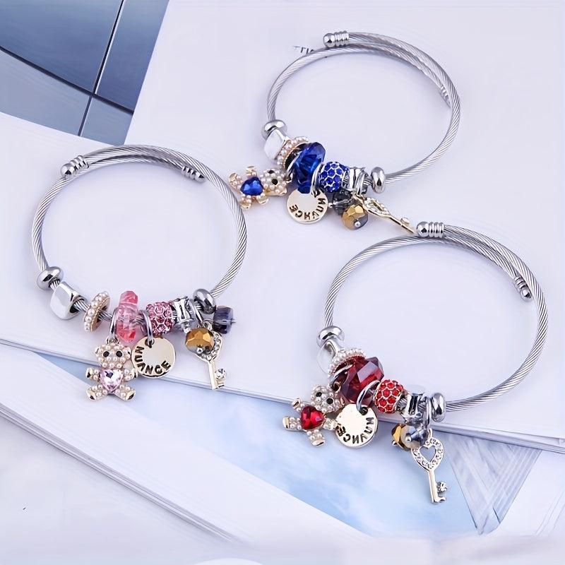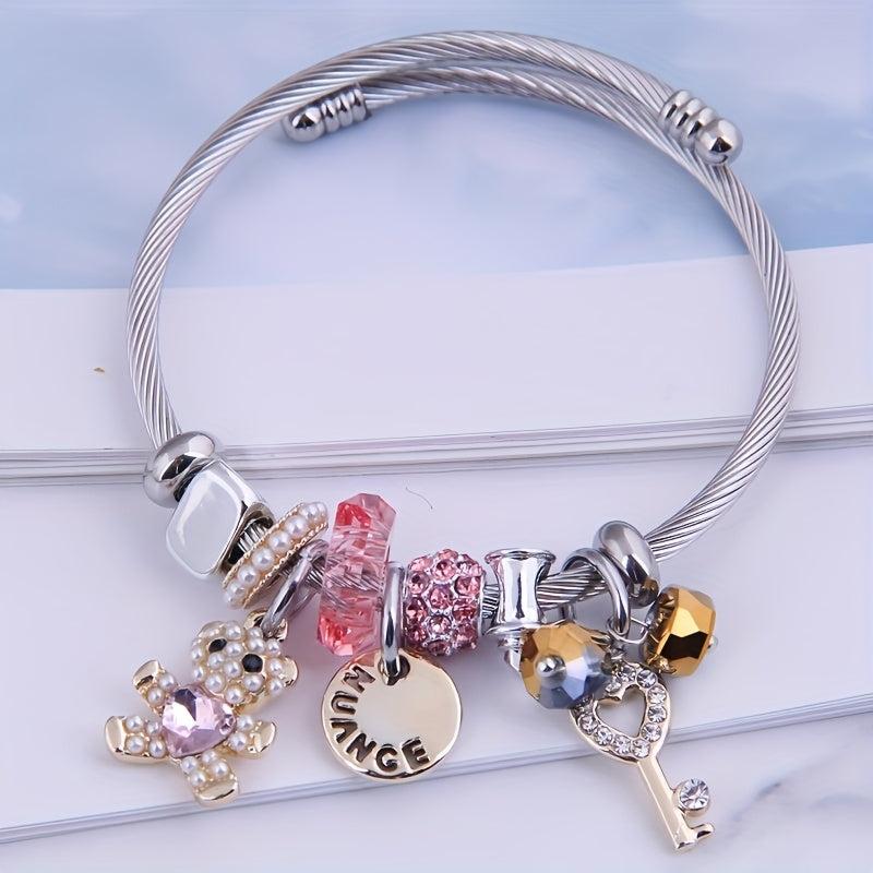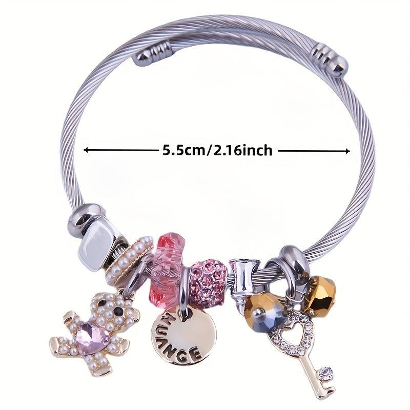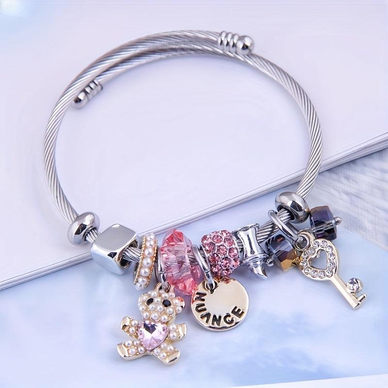 Adorable charm bracelet featuring a cartoon bear design with sparkling rhinestone and pearl details. Adjustable titanium steel bangle with a cute CHANGE pendant. Perfect for every day wear.