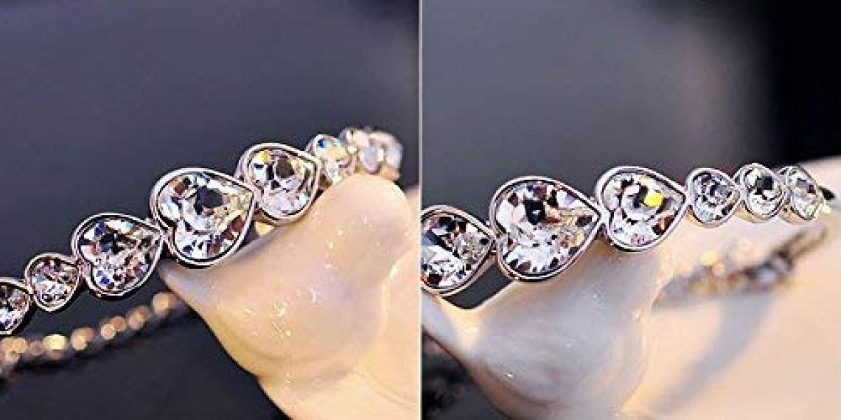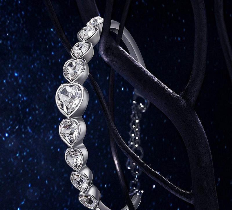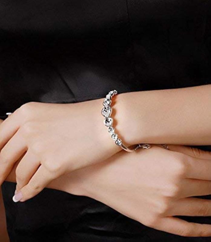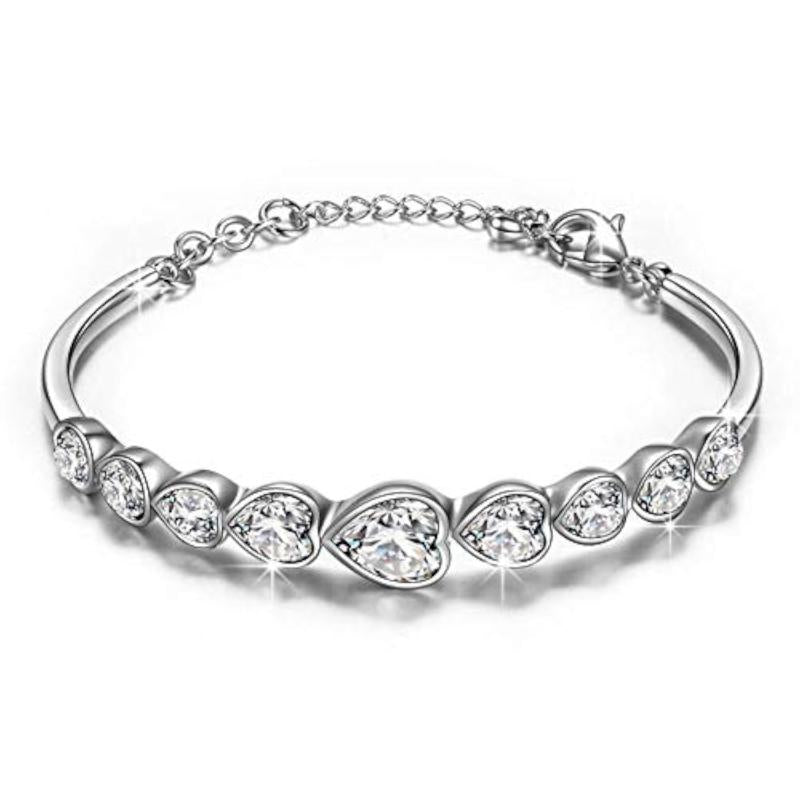 Elegant charm bracelet plated in platinum silver, adorned with stylish crystal accents.