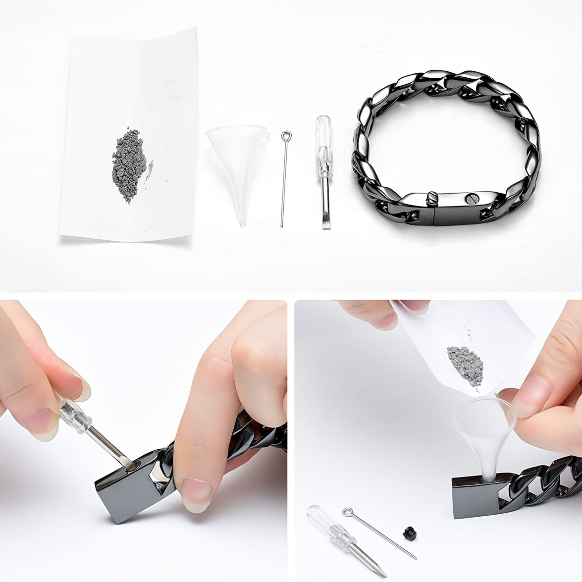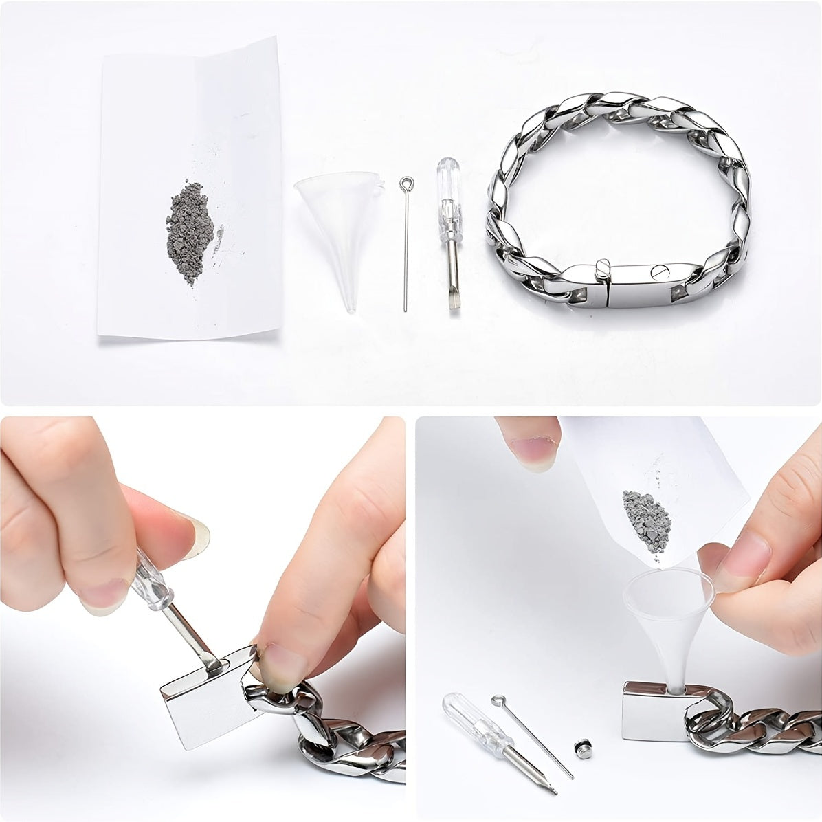 This bracelet serves as a unique way to carry the ashes of a loved one. It features a Cuban link design and can be used as a memorial cremation jewelry.