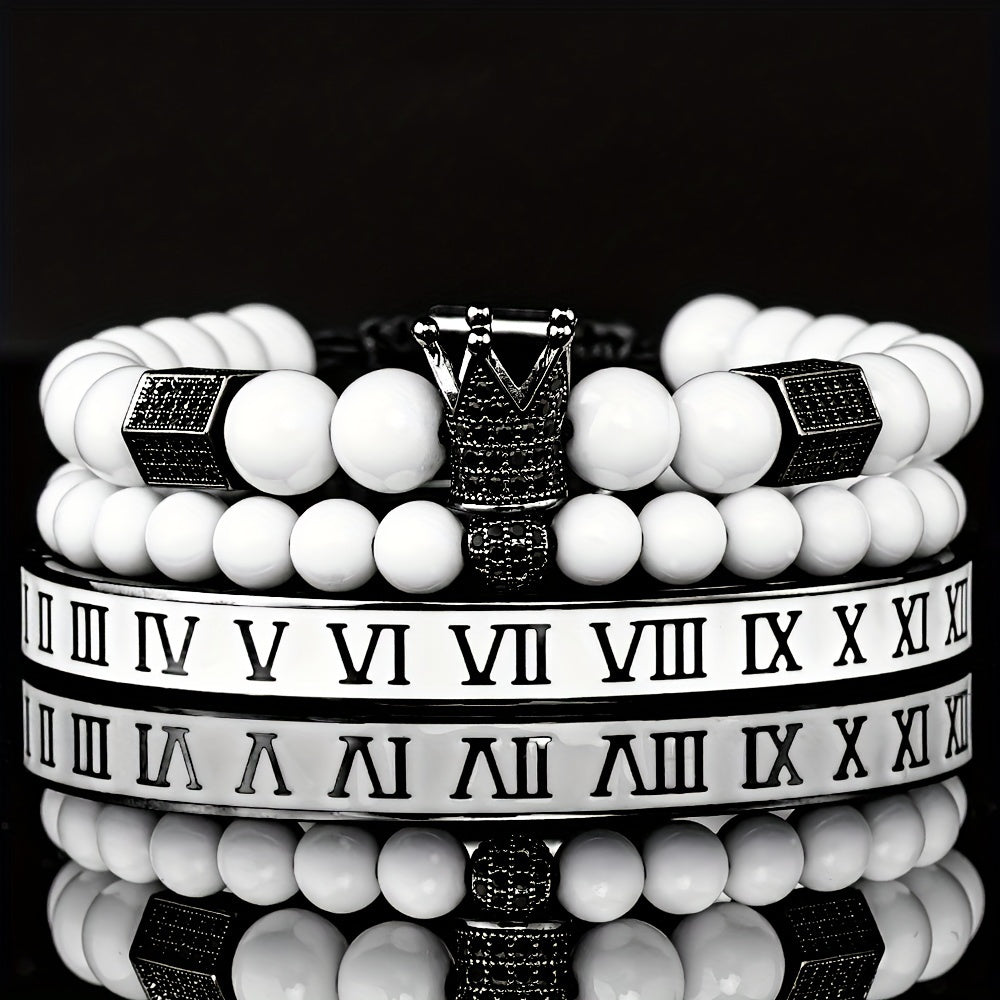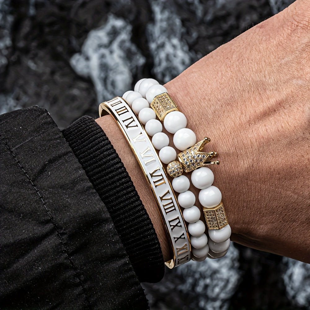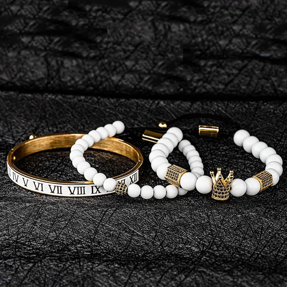 Elegant 3-piece bracelet set featuring cubic zirconia crown, enamel Roman numerals, and durable stainless steel construction. Ideal for men's jewelry collection.