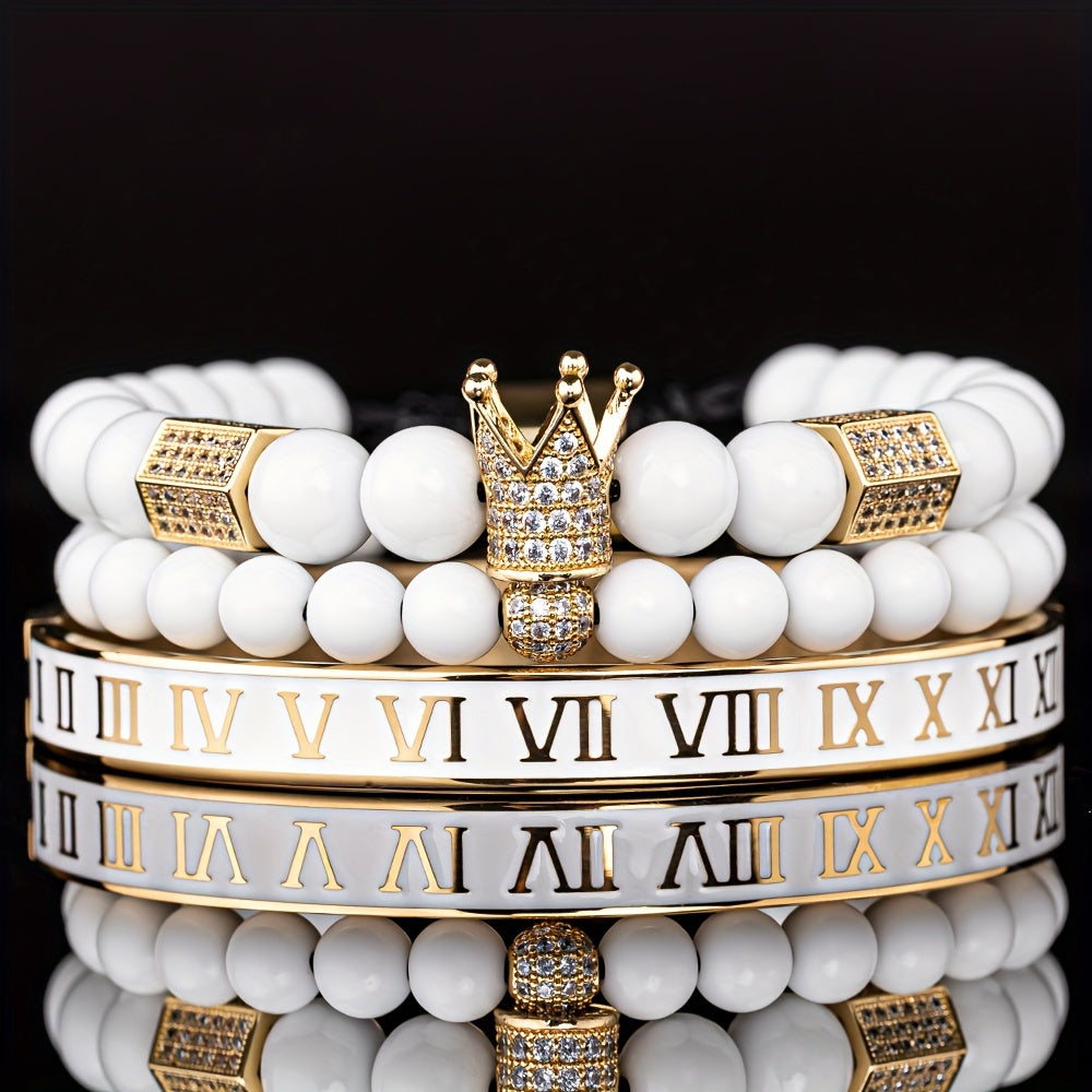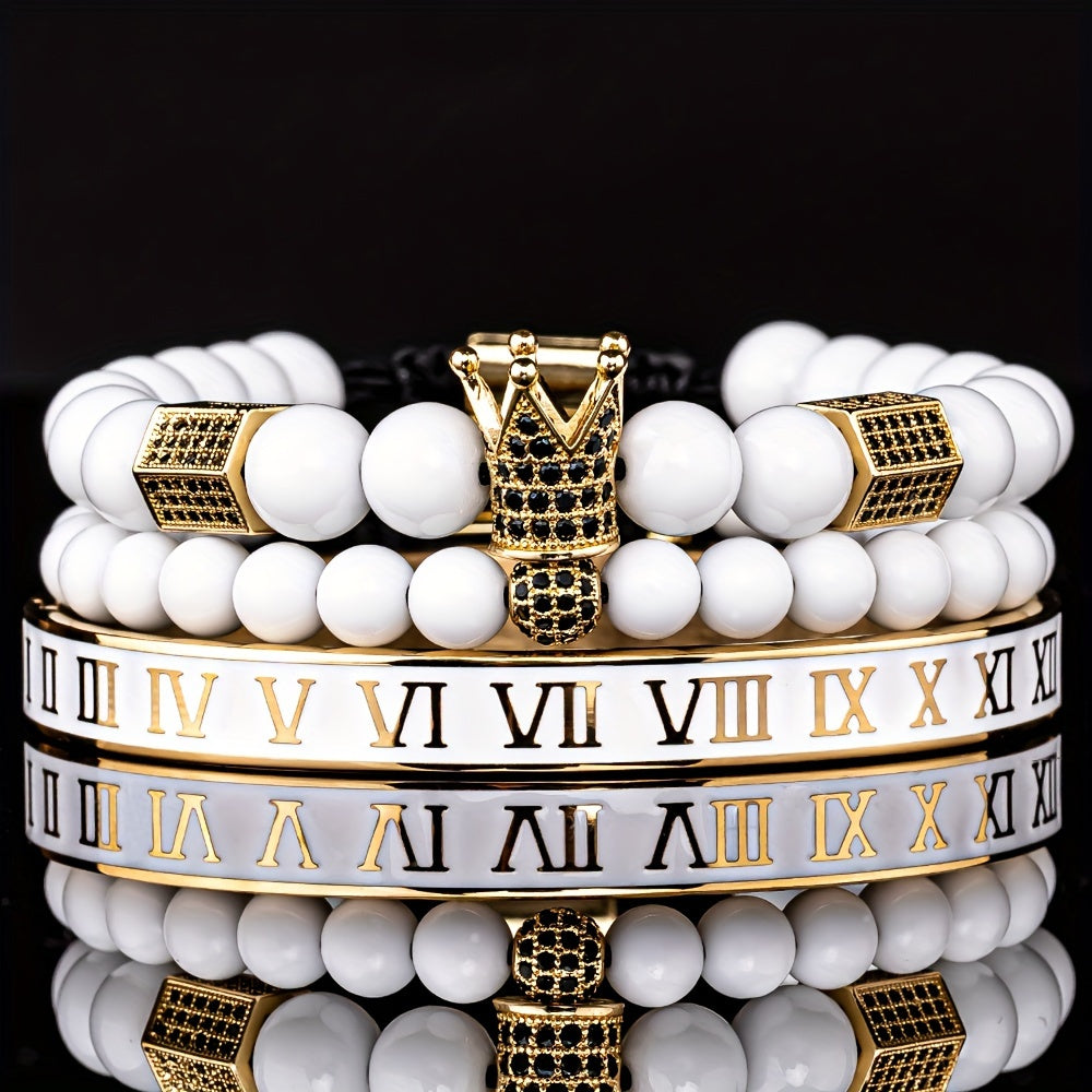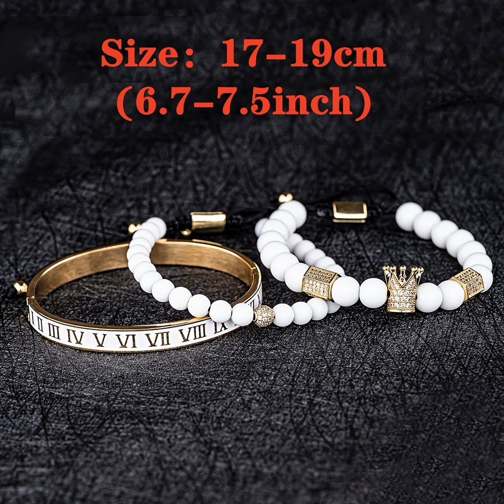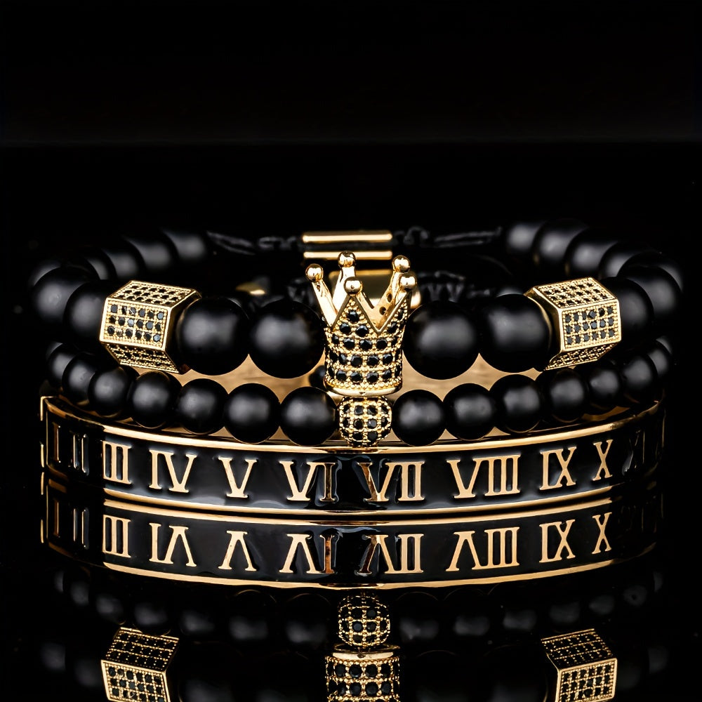Elegant 3-piece bracelet set featuring cubic zirconia crown, enamel Roman numerals, and durable stainless steel construction. Ideal for men's jewelry collection.