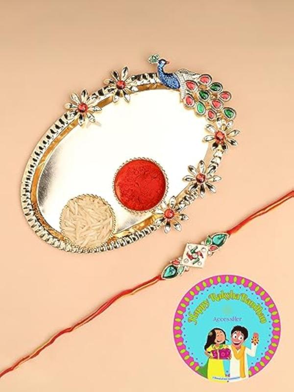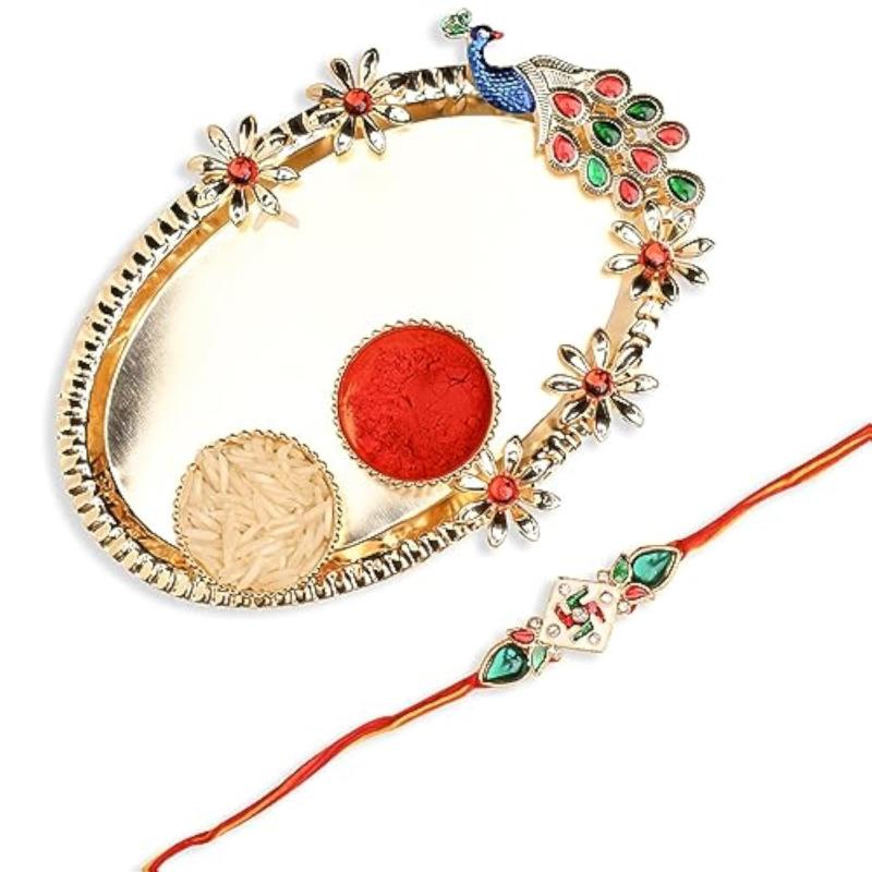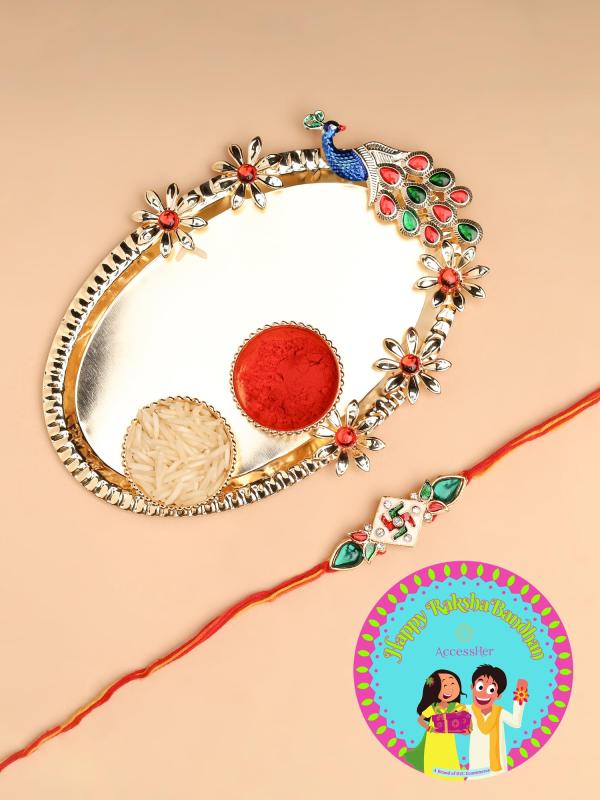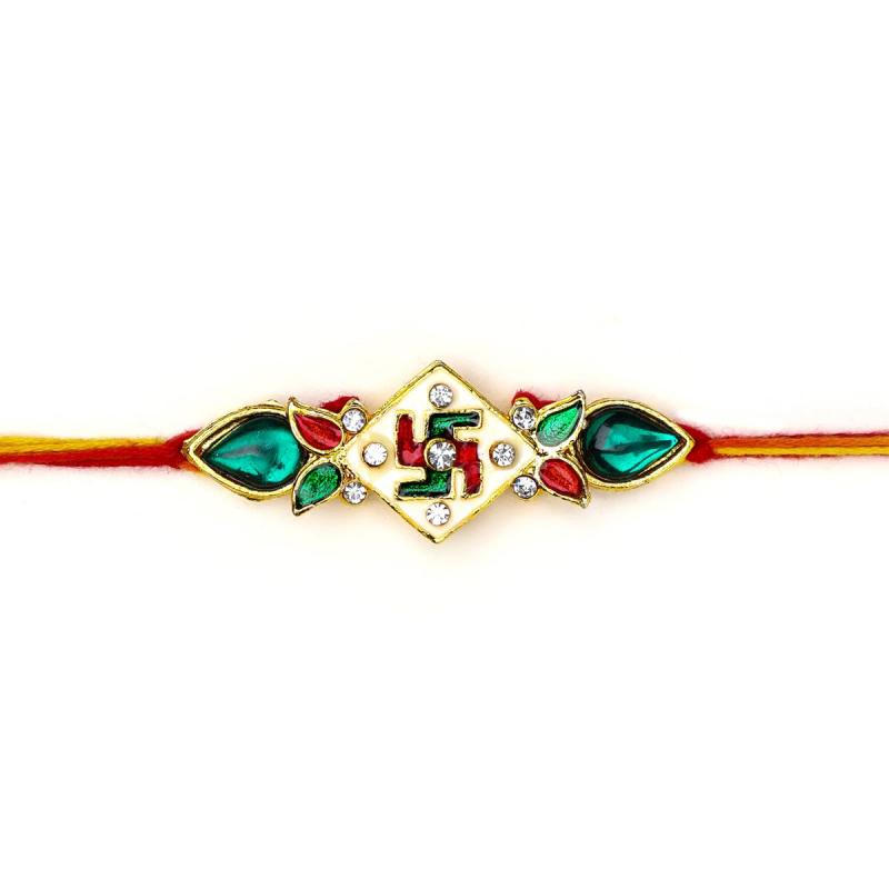 Beautiful rakhi with deity Swastik design, complete with a Pooja Thali & Roli Kumk