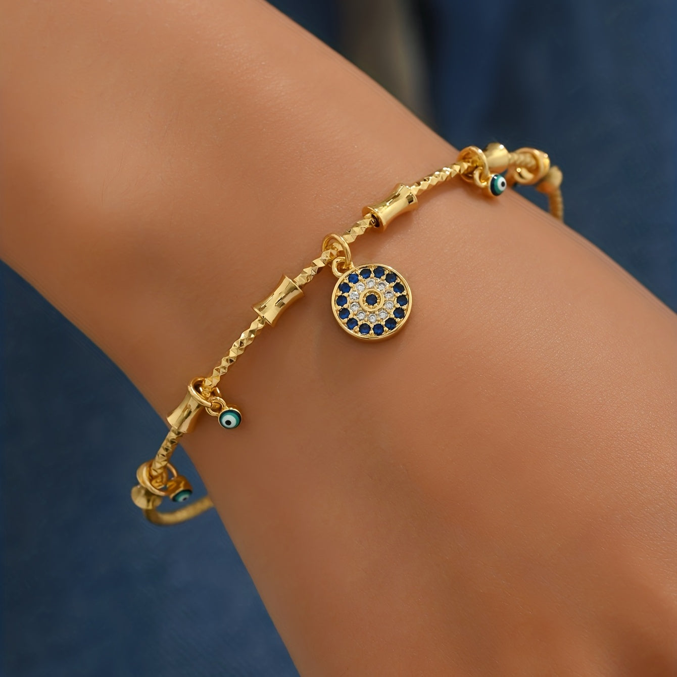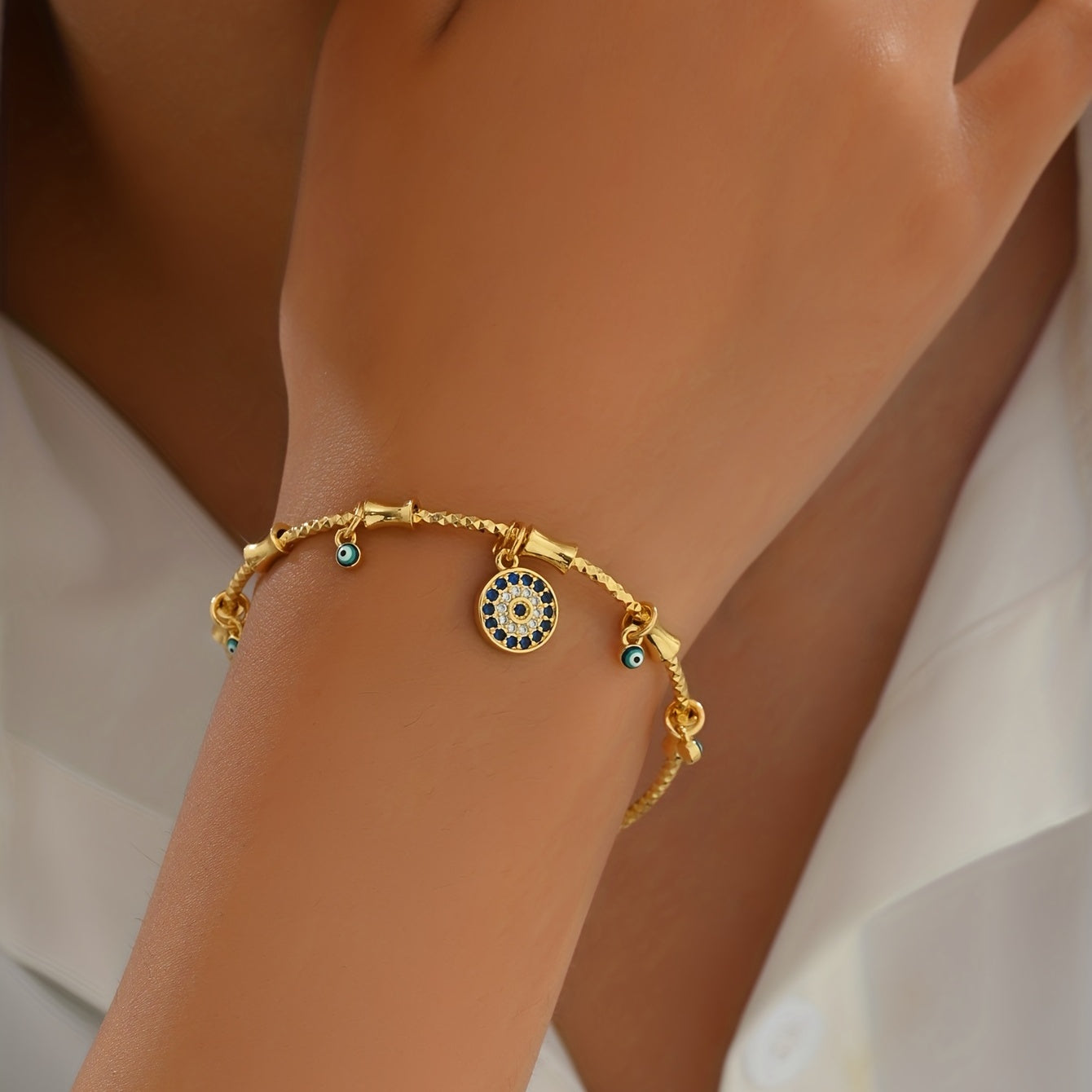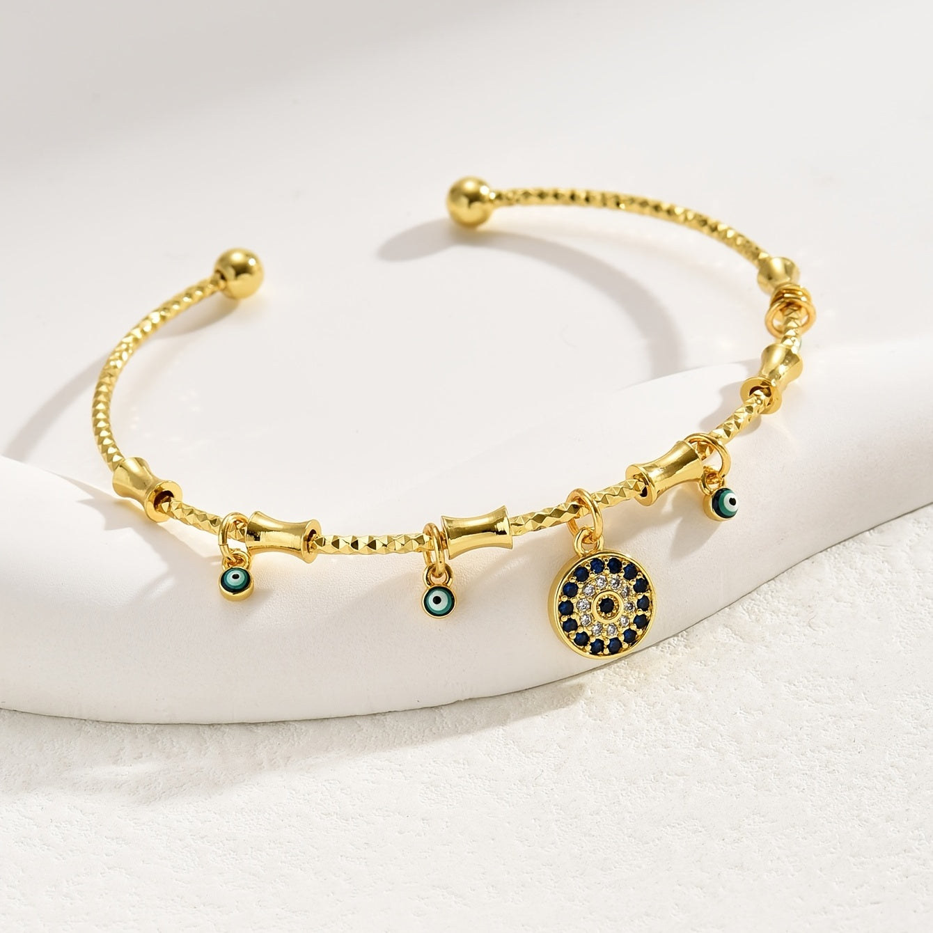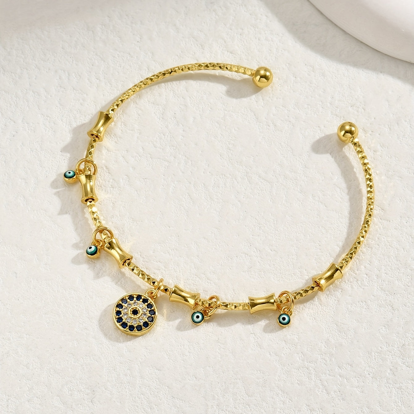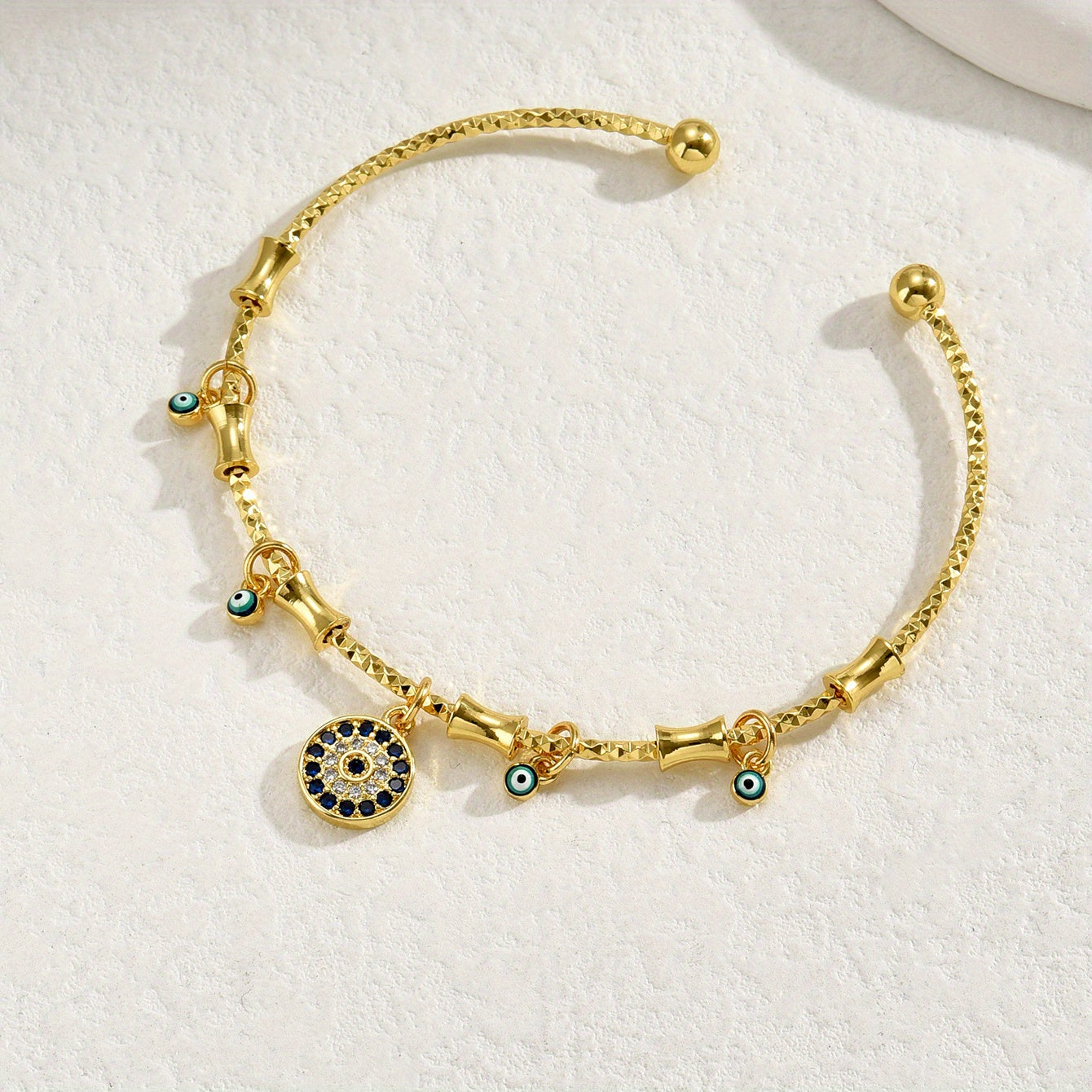 This exquisite cuff bracelet features a Devil's Eye pendant inlaid with shimmering zircon stones. It is made with high-quality 18K gold plating and will make the perfect birthday gift for any lady.