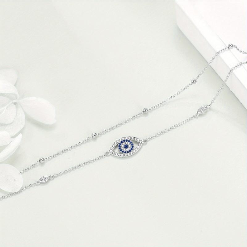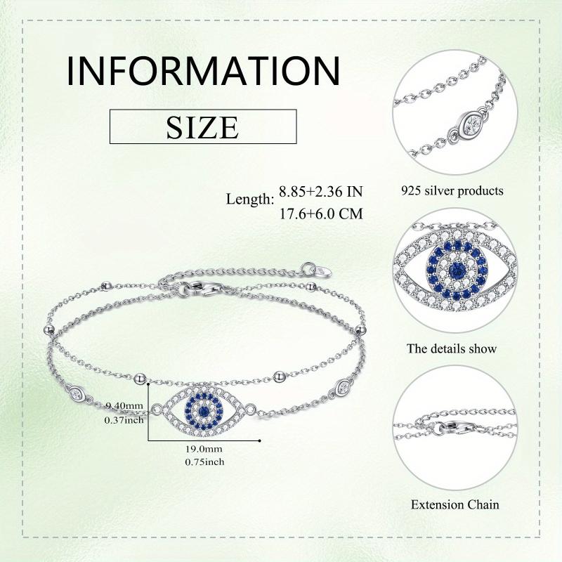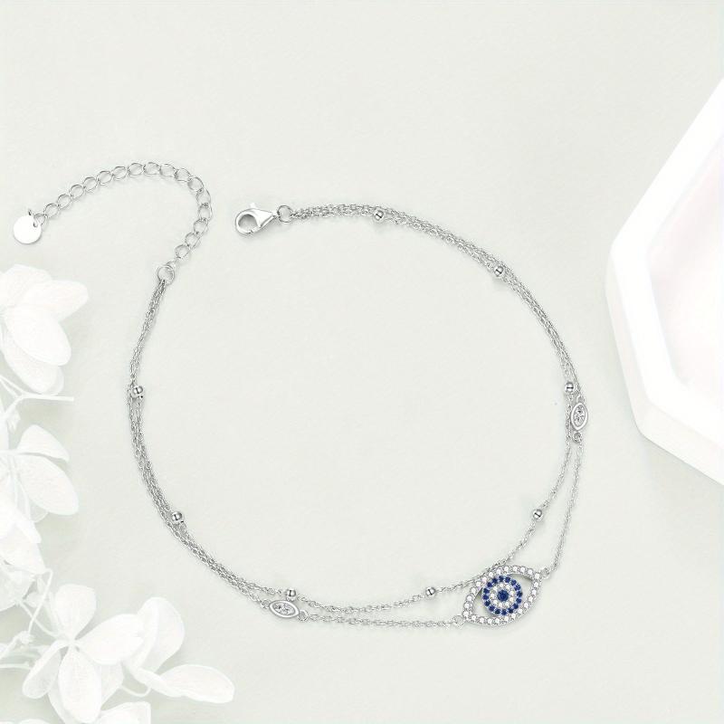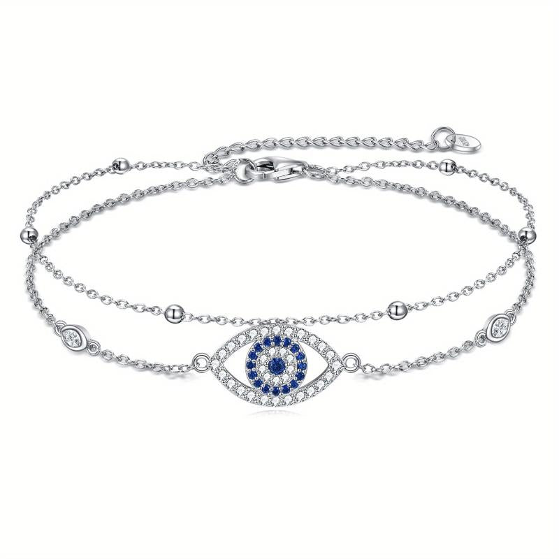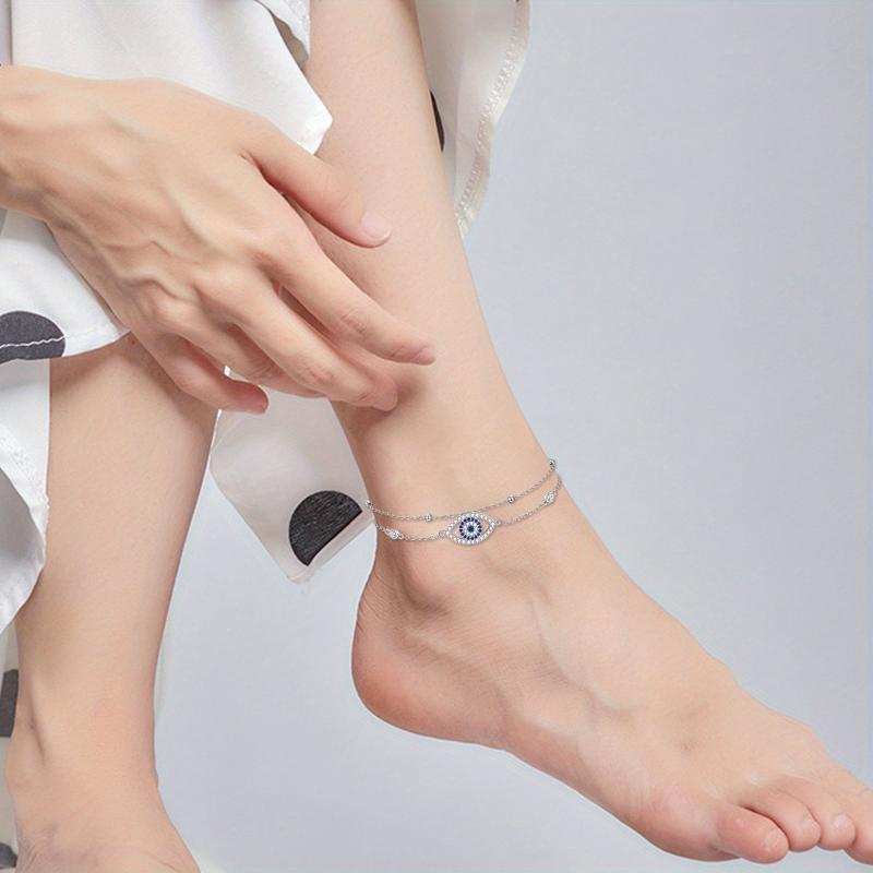 This sterling silver anklet features a double layered design with evil eye charms adorned with cubic zirconia for added protection. Adjustable for a comfortable fit on your foot.