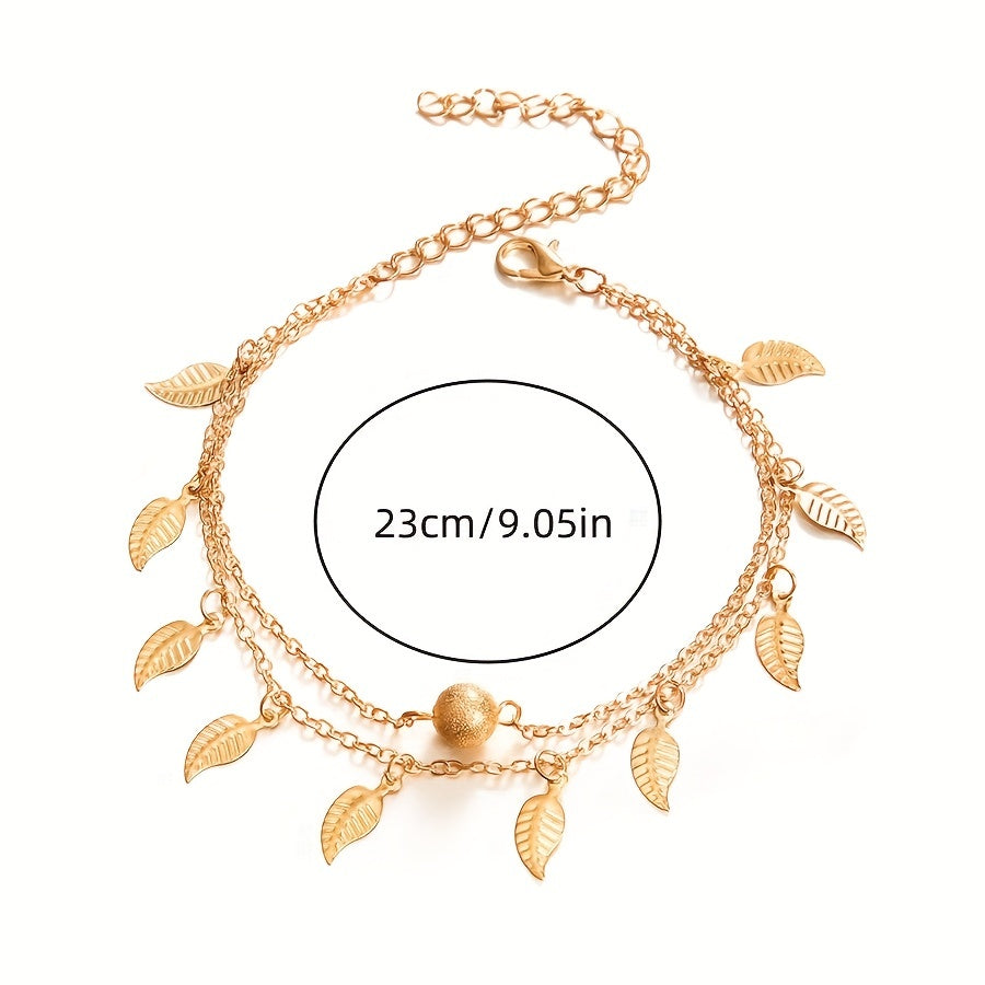 This delicate ankle bracelet features a double layers design with a leaf tassel pendant and faux pearls beads. Perfect accessory for a beach day or summer outfit.