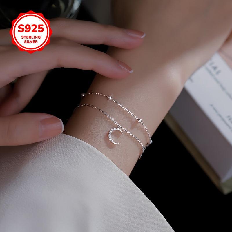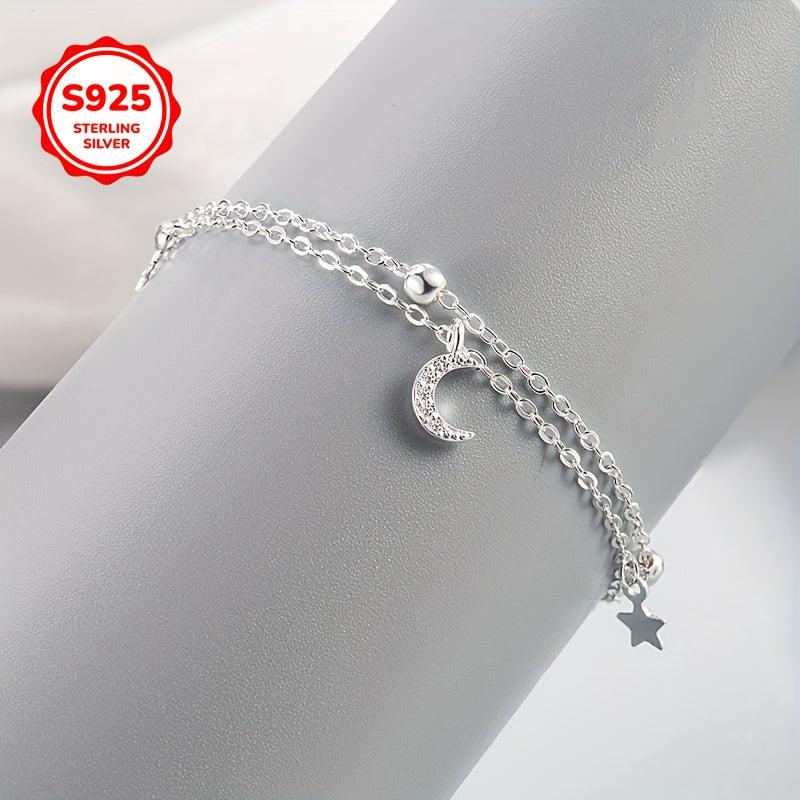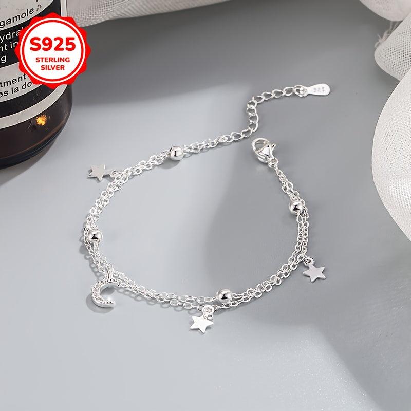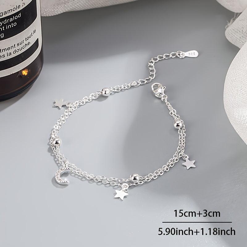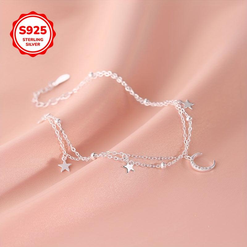 Stay stylish with this fashionable and lightweight handcrafted bracelet made of silvery S925 sterling silver. Features intricate star and moon charms on a double-layer design.