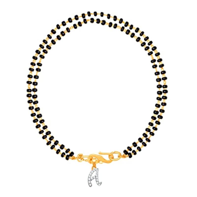 Elegant dual chain mangalsutra bracelet featuring the letter A initial charm, beads, and sparkling cubic zirconia. Perfect for daily wear or special occasions.