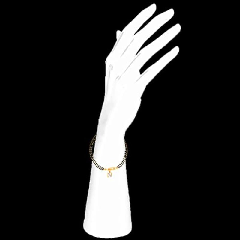 Elegant mangalsutra bracelet featuring 'N' alphabet initial design with beads and sparkling cubic zirconia accents.