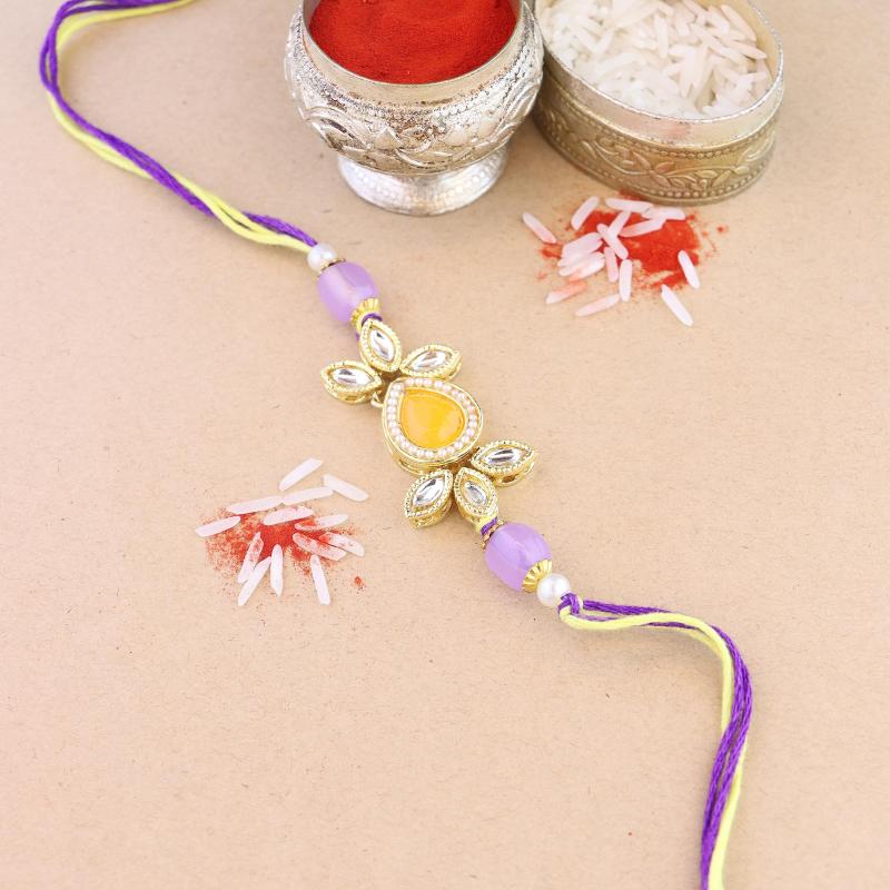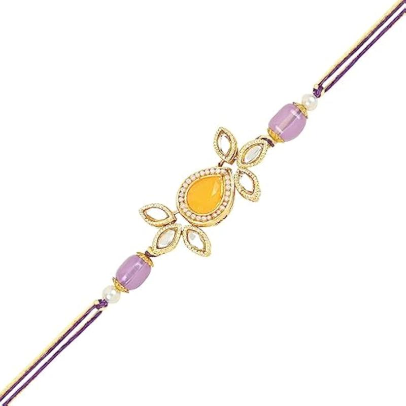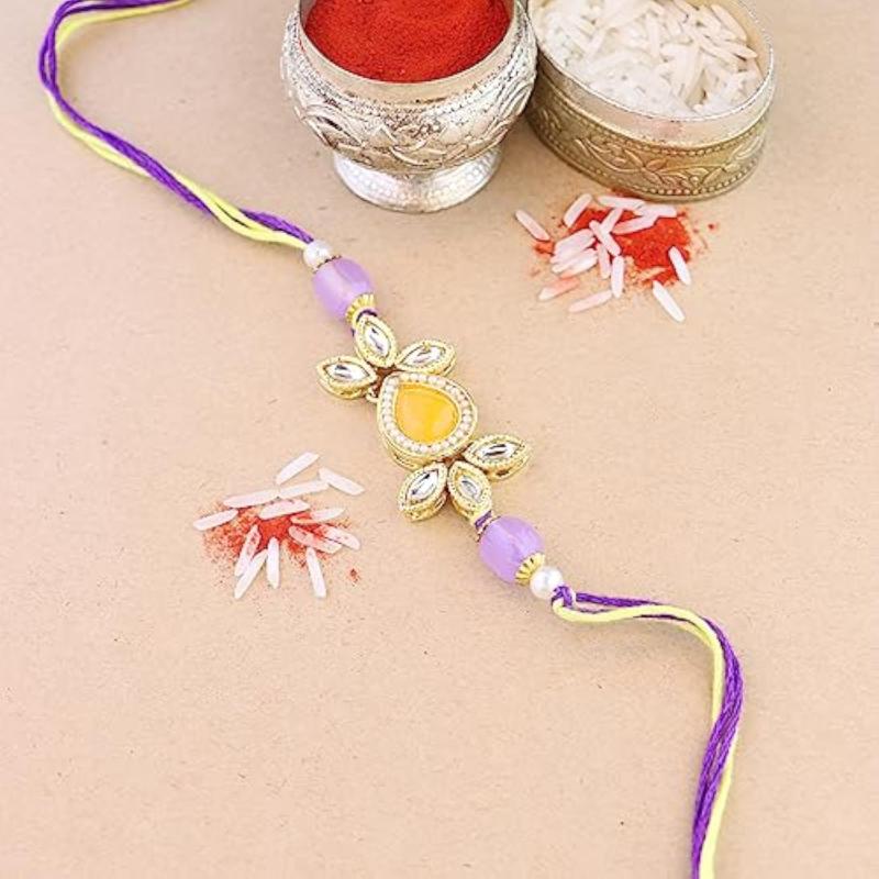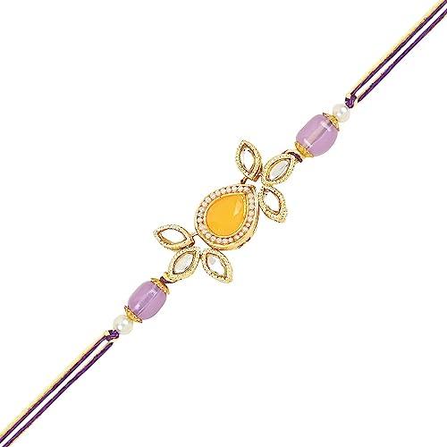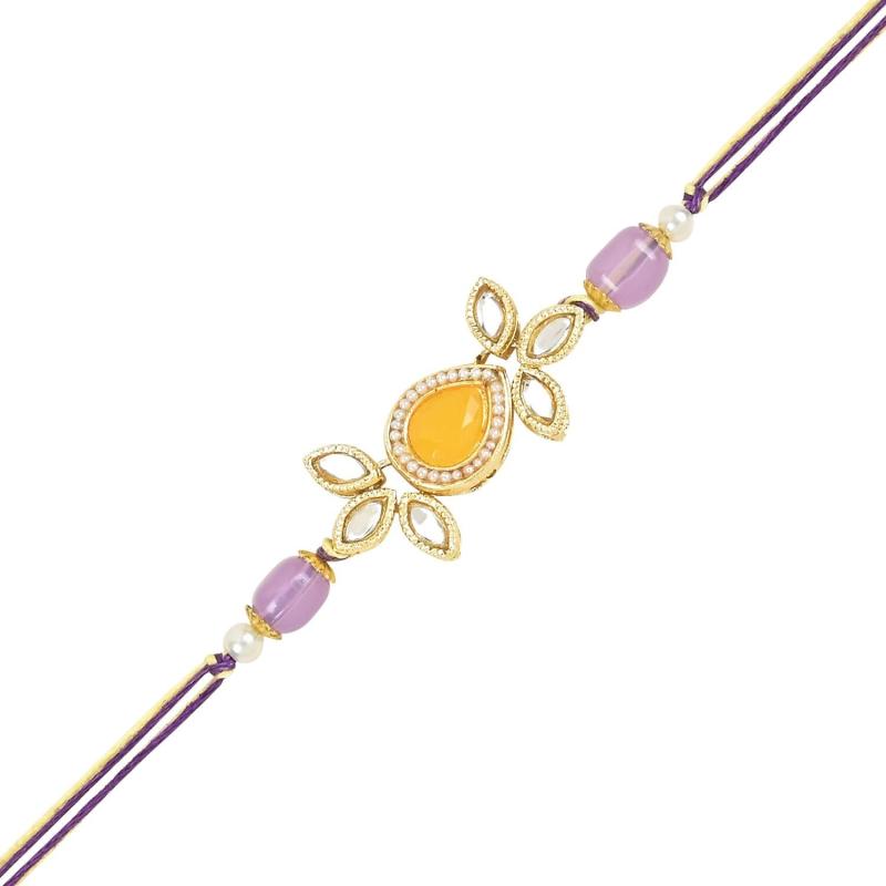Express your love and respect for your brother with this beautifully designed rakhi made with pearls and kundan. A perfect way to celebrate Raksha Bandhan!