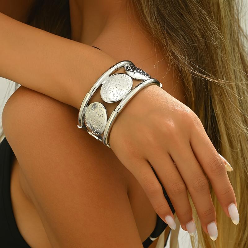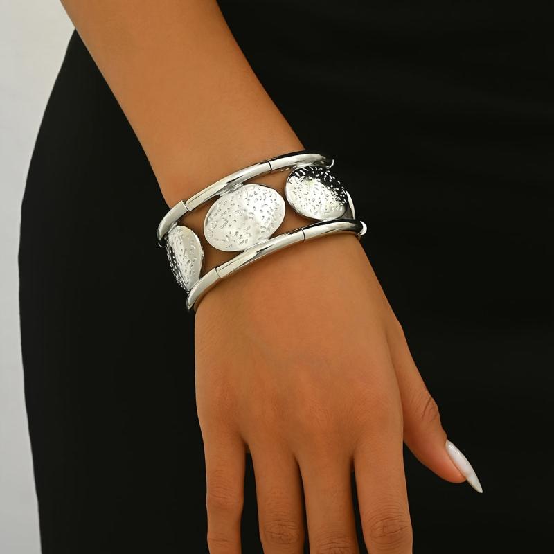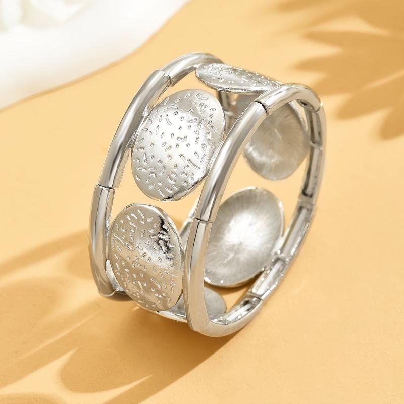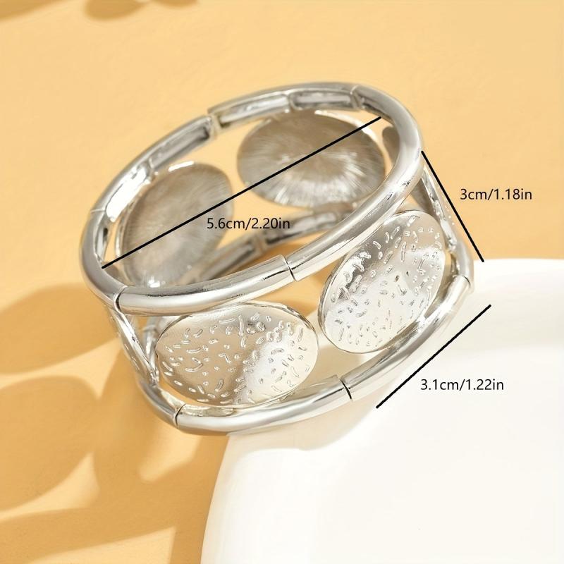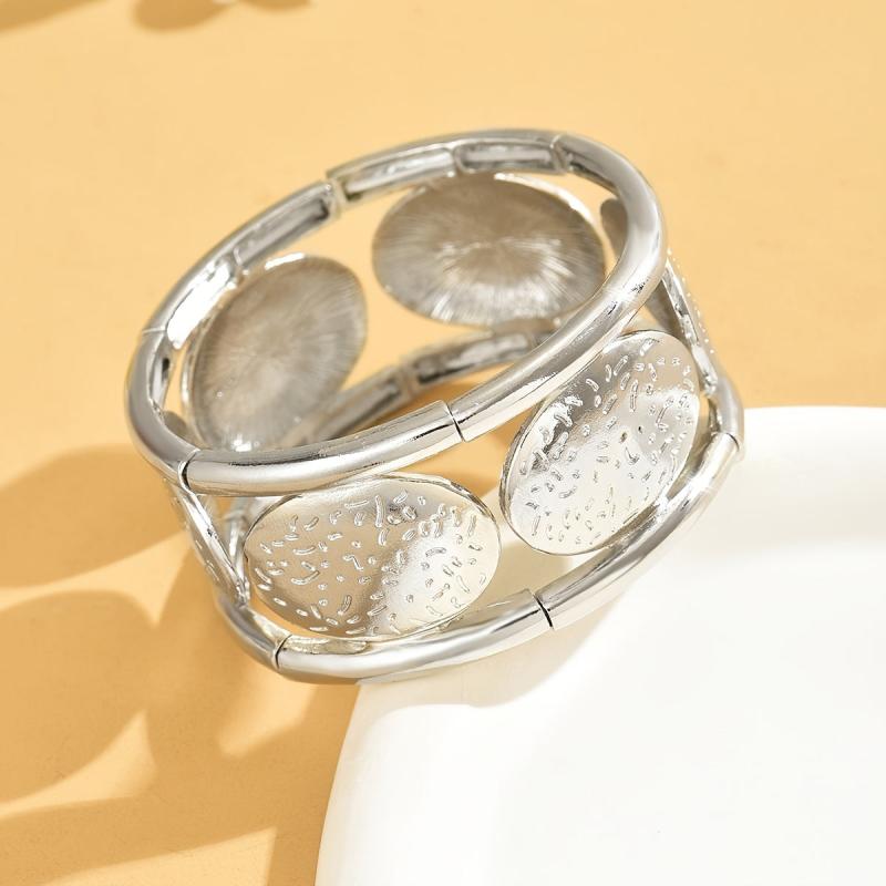 Add a touch of sophistication to your outfit with this beautifully designed silvery oval bangle. The hammered texture creates a unique look, while the elastic cord detailing adds a modern twist. Perfect for any occasion!