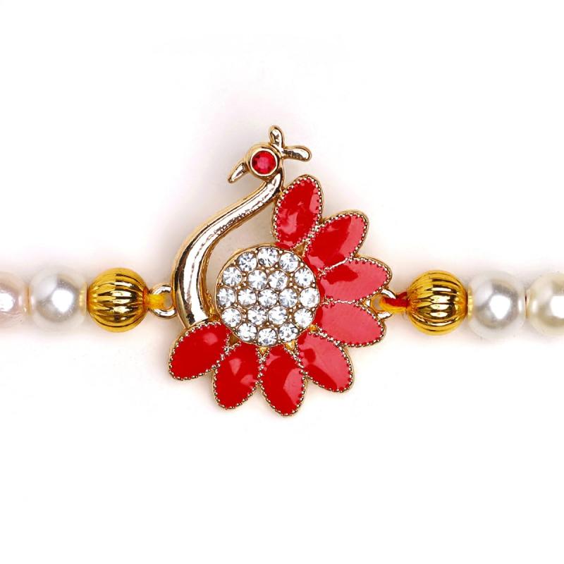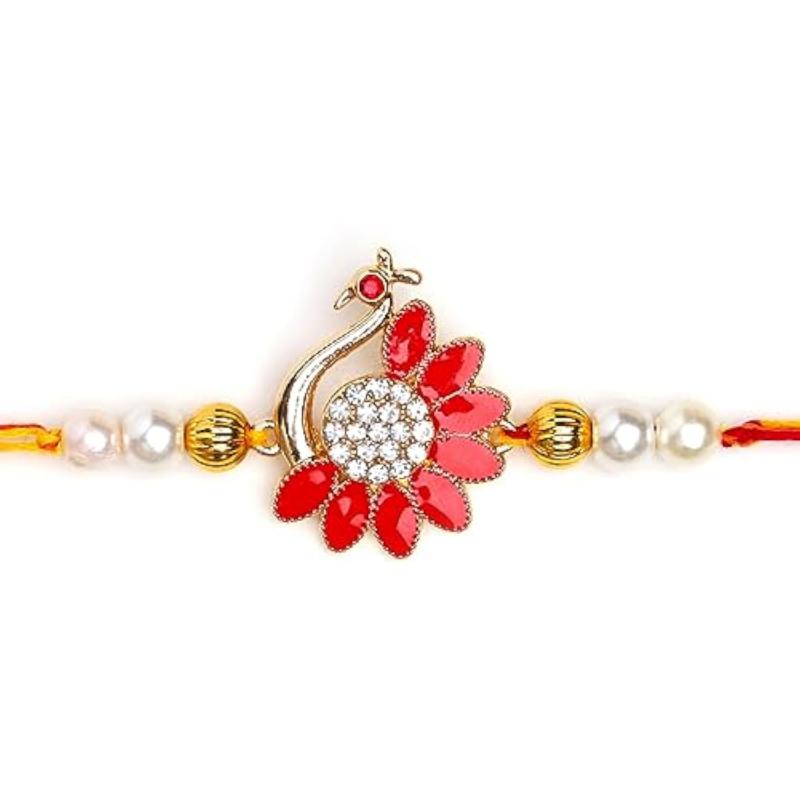 Celebrate Rakshabandhan with this beautiful plated semi precious enamel peacock Rakhi for your beloved brother. Includes 1 Rakhi with Roli Kumkum packets.